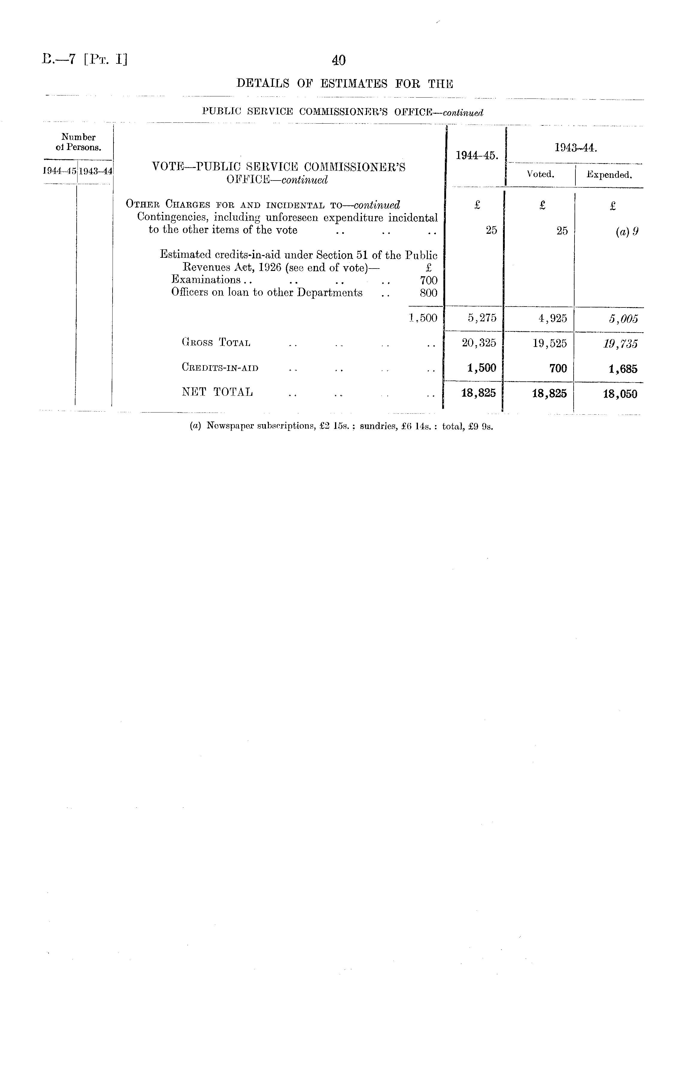Number oi Persons. 1943-44. 1944-45. 1944-451043-44 VOTE—PUBLIC SERVICE COMMISSIONER'S ~Tt - 1944 451943-44 OFFICE-continued Voted. Expended. Other Charges for and incidental to —continued £ £ £ Contingencies, including unforeseen expenditure incidental to the other items of the vote .. .. .. 25 25 (a) 9 Estimated credits-in-aid under Section 51 of the Public Revenues Act, 1926 (see end of vote) — £ Examinations.. .. .. .. 700 Officers on loan to other Departments .. 800 1,500 5,275 4,925 5,005 Gross Total .. .. .. .. 20,325 19,525 19,735 Credits-in-aid .. .. . .. 1,500 700 1,685 NET TOTAL .. .. .. 18,825 18,825 18,050