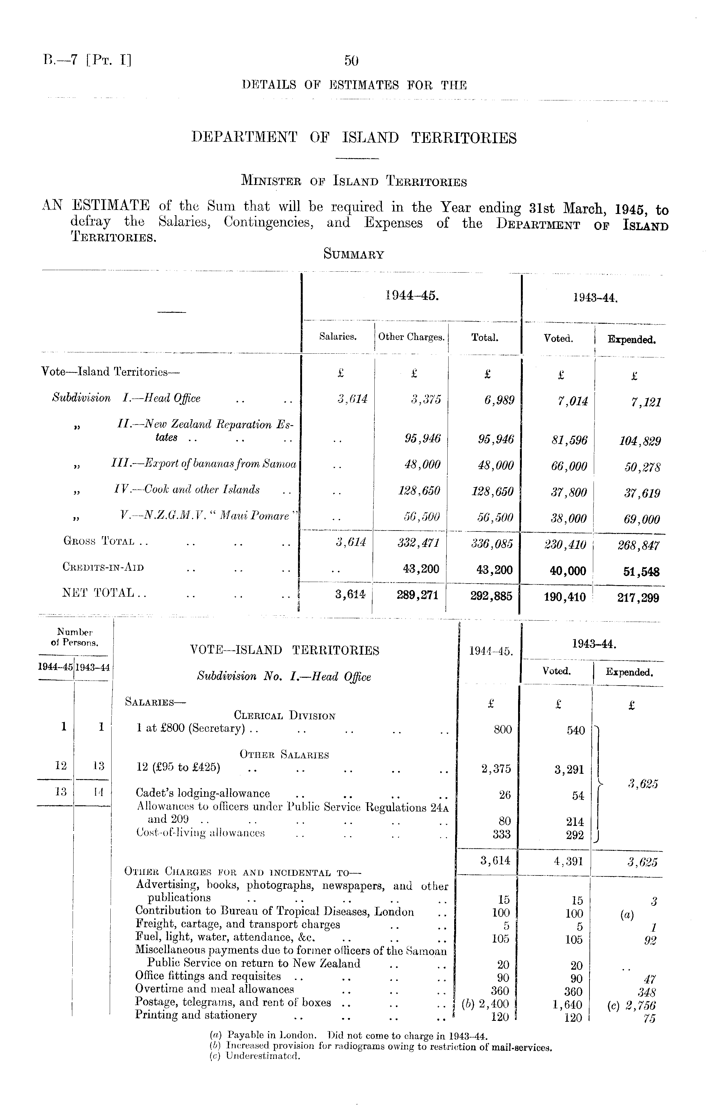 1944-45. 1943-44. Salaries. Other Charges. Total. Voted. | Expended. Vote—Island Territories— £ £ £ £ £ Subdivision I.—Head Office .. .. 3,614 3,375 6,989 7,014 7,121 „ II. —New Zealand Reparation Estates 95,946 95,946 81,596 104,829 „ III•—Export of bananas from Samoa .. 48,000 48,000 66,000 50,278 „ IV.—Cook and other Islands .. .. 128,650 128,650 37,800 37,619 „ V. —N.Z.G.M.V." Maui Pomare" .. 56,500 56,500 38,000 69,000 GROSS Total 3,614 332,471 336,085 230,410 268,847 Credits-IN-AID .. .. .. .. 43,200 43,200 40,000 51,548 NET TOTAL.. .. .. ,.| 3,614 289,271 292,885 190,410 217,299 1 ! Number °' FerS0 " 3 ' VOTE—ISLAND TERRITORIES 1944-45. 1943-44. 1944-451943-44 Subdivision No. I.—Head Office Voted -_ Expended. Salaries— £ £ £ Clerical Division 1 1 1 at £800 (Secretary) .. .. .. .. .. 800 540 " Other Salaries 12 13 12 (£95 to £425) 2,375 3,291 13 14 Cadet's lodging-allowance .. .. .. .. 26 54 — Allowances to officers under Public Service Regulations 24a and 209 .. .. .. .. .. .. 80 214 Cost-of-living allowances .. .. .. ,. 333 292 3,614 4,391 3,625 Other Charges for and incidental to — Advertising, books, photographs, newspapers, and other publications .. .. .. .. .. 15 15 3 Contribution to Bureau of Tropical Diseases, London .. 100 100 (a) Freight, cartage, and transport charges .... 5 5 J Fuel, light, water, attendance, &c. .. .. .. 105 105 92 Miscellaneous payments due to former officers of the Samoan Public Service on return to New Zealand .. .. 20 20 Office fittings and requisites .. .. .. .. 90 90 47 Overtime and meal allowances .. .. .. 360 360 348 Postage, telegrams, and rent of boxes .. .. .. (6)2,400 1,640 (c) 2,756 Printing and stationery .. .. .. .. * 120 I 120 I ' 75