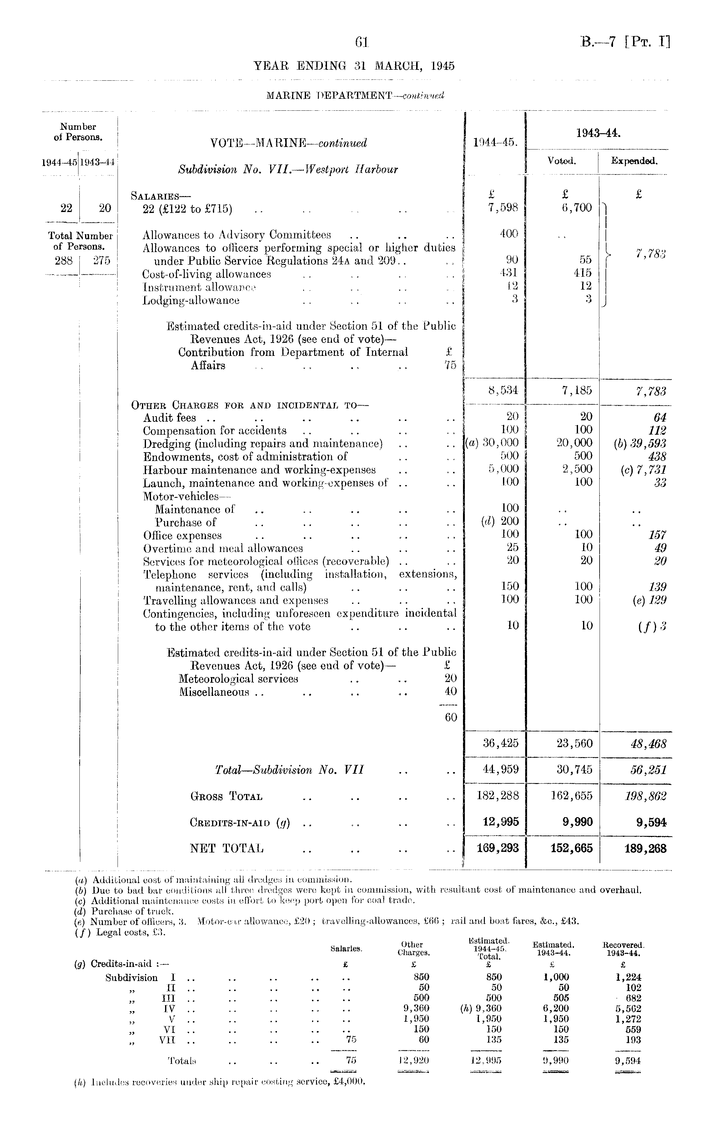 Number 1 QAV A A nf Pfirsnns 1^4:0—4:3:. 01 • VOTE —MARINE—continued 1944-45. ___ 1944-45:1943-41 . . , „ , Voted. Expended, j Subdivision No. VII. — |y Harbour _ Salaries — £ £ £ 22 20 22 (£122 to £715) .. .. . 7,598 6,700 " Total Number Allowances to Advisory Committees .. .. .. 400 of Persons. Allowances to officers performing special or higher duties I « 288 I 275 under Public Service Regulations 24a and 209.. .. 90 55 I' 1 Cost-of-living allowances .. .. .. .. 431 415 Instrument allowance .. .. .. .. 12 12 Lodging-allowance .. .. .. .. 3 3 Estimated credits-in-aid under Section 51 of the Public Revenues Act, 1926 (see end of vote) — Contribution from Department of Internal £ Affairs .. .. ., .. 75 8,534 7,185 7,783 Otheb Charges fob and incidental to — — Audit fees .. .. .. .. .. .. 20 20 64 Compensation for accidents .. .. .. .. 100 100 112 Dredging (including repairs and maintenance) .. .. (a) 30,000 20,000 (b) 39,593 Endowments, cost of administration of .. .. 500 500 438 Harbour maintenance and working-expenses .. .. 5,000 2,500 (c) 7,731 Launch, maintenance and working-expenses of .. .. 100 100 33 Motor-vehicles— Maintenance of .. .. .. .. 100 Purchase of .. .. .. .. .. (d) 200 Office expenses .. .. .. .. .. 100 100 157 Overtime and meal allowances .. .. .. 25 10 49 Services for meteorological offices (recoverable) .. .. 20 20 20 Telephone services (including installation, extensions, maintenance, rent, and calls) .. .. .. 150 100 139 Travelling allowances and expenses .. .. .. 100 100 (e) 129 Contingencies, including unforeseen expenditure incidental to the other items of the vote .. .. .. 10 10 (/) -5 Estimated credits-in-aid under Section 51 of the Public Revenues Act, 1926 (see end of vote) — £ Meteorological services .. .. 20 Miscellaneous .. .. .. .. 40 60 36,425 23,560 48,468 Total—Subdivision No. VII .. .. 44,959 30,745 56,251 GROSS Total 182,288 1.62,655 198,862 Credits-in-aid {g) .. ■. ■ ■ ■ ■ 12,995 9,990 9,594 NET TOTAL 169,293 152,665 189,268