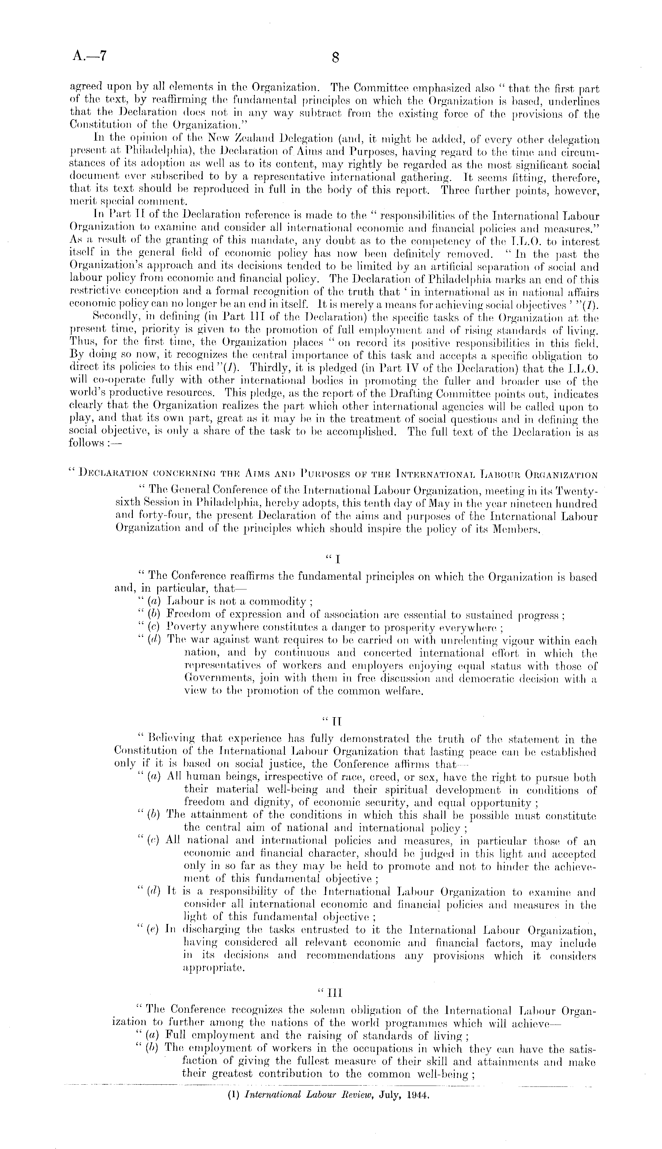 agreed upon by all elements in the Organization. The Committee emphasized also " that the first part of the text, by reaffirming the fundamental principles on which the Organization is based, underlines that the Declaration does not in any way subtract from the existing force of the provisions of the Constitution of the Organization." In the opinion of the New Zealand Delegation (and, it might be added, of every other delegation present at Philadelphia), the Declaration of Aims and Purposes, having regard to the time and circumstances of its adoption as well as to its content, may rightly be regarded as the most significant social document ever subscribed to by a representative international gathering. It seems fitting, therefore, that its text should be reproduced in full in the body of this report. Three further points, however, merit special comment. In Part II of the Declaration reference is made to the " responsibilities of the International Labour Organization to examine and consider all international economic and financial policies and measures." As a result of the granting of this mandate, any doubt as to the competency of the 1.L.0. to interest itself in the general field of economic policy has now been definitely removed. "In the past the Organization's approach and its decisions tended to be limited by an artificial separation of social and labour policy from economic and financial policy. The Declaration of Philadelphia marks an end of this restrictive conception and a formal recognition of the truth that ' in international as in national affairs economic policy can no longer be an end in itself. It is merely a means for achieving social objectives-' "(/). Secondly, in defining (in Part 111 of the Declaration) the specific tasks of the Organization at the present time, priority is given to the promotion of full employment and of rising standards of living. Thus, for the first time, the Organization places " on record its positive responsibilities in this field. By doing so now, it recognizes the central importance of this task and accepts a specific obligation to direct its policies to this end "(1). Thirdly, it is pledged (in Part IV of the Declaration) that the 1.L.0. will co-operate fully with other international bodies in promoting the fuller and broader use of the world's productive resources. This pledge, as the report of the Drafting Committee points out, indicates clearly that the Organization realizes the part which other international agencies will be called upon to play, and that its own part, great as it may be in the treatment of social questions and in defining the social objective, is only a share of the task to be accomplished. The full text of the Declaration is as follows " Declaration concerning the Aims and Purposes of the International Labour Organization " The General Conference of the International Labour Organization, meeting in its Twentysixth Session in Philadelphia, hereby adopts, this tenth day of May in the year nineteen hundred and forty-four, the present Declaration of the aims and purposes of the International Labour Organization and of the principles which should inspire the policy of its Members. "I " The Conference reaffirms the fundamental principles on which the Organization is based and, in particular, that — " (a) Labour is not a commodity ; " (b) Freedom of expression and of association are essential to sustained progress ; " (c) Poverty anywhere constitutes a danger to prosperity everywhere ; " (d) The war against want requires to be carried on with unrelenting vigour within each nation, and by continuous and concerted international effort in which the representatives of workers and employers enjoying equal status with those of Governments, join with them in free discussion and democratic decision with a view to the promotion of the common welfare. " II " Believing that experience has fully demonstrated the truth of the statement in the Constitution of the International Labour Organization that lasting peace can be established only if it is based 011 social justice, the Conference affirms that— " (a) All human beings, irrespective of race, creed, or sex, have the right to pursue both their material well-being and their spiritual development in conditions of freedom and dignity, of economic security, and equal opportunity ; " (b) The attainment of the conditions in which this shall be possible must constitute the central aim of national and international policy ; " (c) All national and international policies and measures, in particular those of an economic, and financial character, should be judged in this light and accepted only in so far as they may be held to promote and not to hinder the achievement of this fundamental objective ; " (d) It is a responsibility of the International Labour Organization to examine and consider all international economic and financial policies and measures in the light of this fundamental objective ; " (e) In discharging the tasks entrusted to it the International Labour Organization, having considered all relevant economic and financial factors, may include in its decisions and recommendations any provisions which it considers appropriate. "11l " The Conference recognizes the solemn obligation of the International Labour Organization to further among the nations of the world programmes which will achieve— " (a) Full employment and the raising of standards of living ; " (b) The employment of workers in the occupations in which they can have the satisfaction of giving the fullest measure of their skill and attainments and make their greatest contribution to the common well-being ;