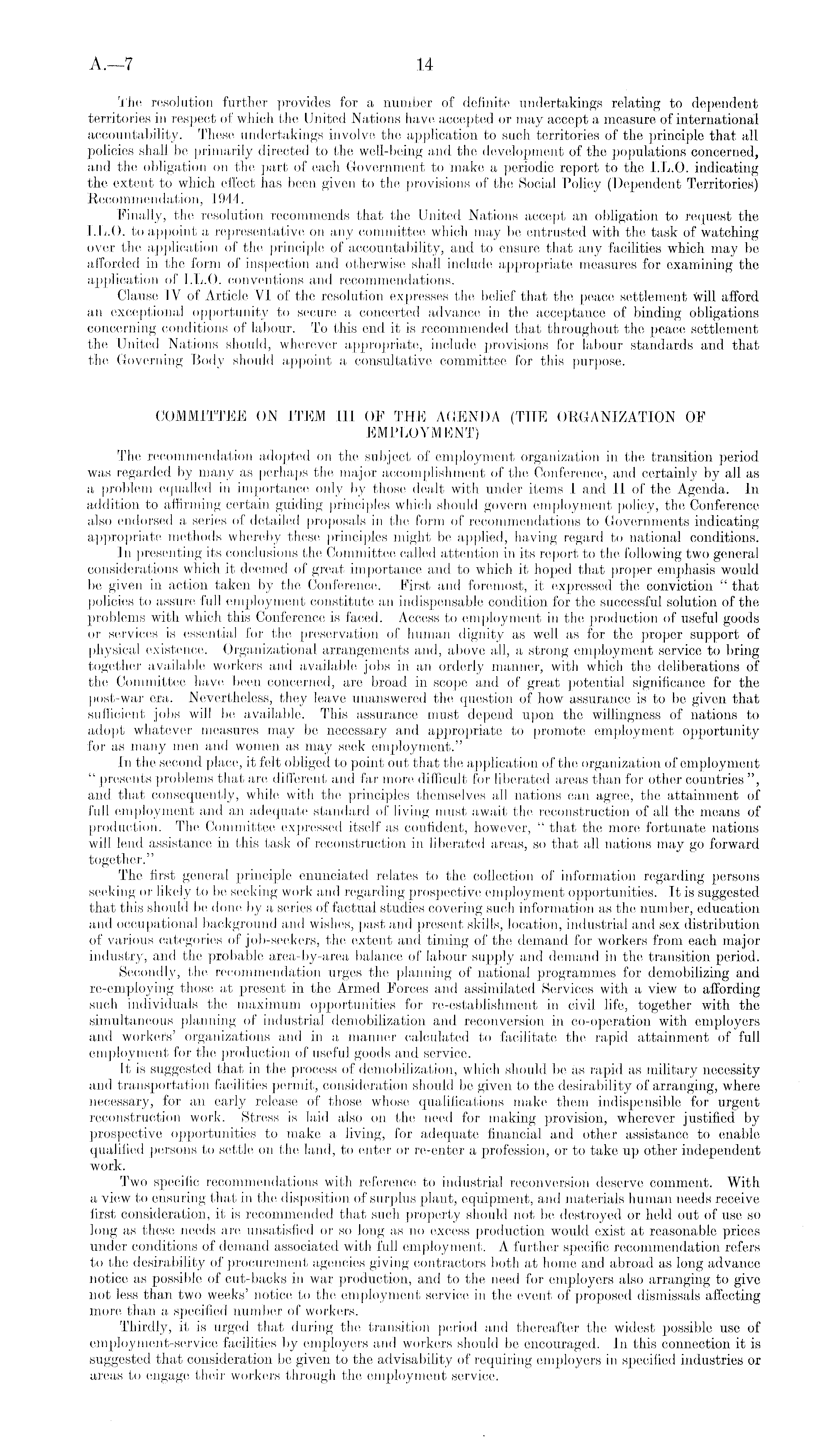 The resolution further provides for a number of definite undertakings relating to dependent territories in respect of which the United Nations have accepted or may accept a measure of international accountability. Those undertakings involve the application to such territories of the principle that all policies shall be primarily directed, to the well-being and the development of the populations concerned, and the obligation on the part of each Government to make a periodic report to the 1.L.0. indicating the extent to which effect has been given to the provisions of the Social Policy (Dependent Territories) Recommendation, 1944. Finally, the resolution recommends that the United Nations accept an obligation to request the 1.L.0. to appoint a representative on any committee which may be entrusted with the task of watching over the application of the principle of accountability, and to em-sure that any facilities which may be afforded in the form of inspection and otherwise shall include appropriate measures for examining the application of 1.L.0. conventions and recommendations. Clause IV of Article VI of the resolution expresses the belief that the peace settlement Will afford an exceptional opportunity to secure a concerted advance in the acceptance of binding obligations concerning conditions of labour. To this end it is recommended that throughout the peace settlement the United Nations should, wherever appropriate, include provisions for labour standards and that the Governing Body should appoint a consultative committee for this purpose. COMMITTEE ON ITEM 111 OF THE AGENDA (THE ORGANIZATION OF EMPLOYMENT) The recommendation adopted on the subject of employment organization in the transition period was regarded by many as perhaps the major accomplishment of the Conference, and certainly by all as a problem equalled in importance only by those dealt with under items I and II of the Agenda. In addition to affirming certain guiding principles which should govern employment policy, the Conference also endorsed a series of detailed proposals in the form of recommendations to Governments indicating appropriate methods whereby these principles might be applied, having regard to national conditions. In presenting its conclusions the Committee called attention in its report to the following two general considerations which it deemed of great importance and to which it hoped that proper emphasis would be given in action taken by the Conference. First and foremost, it expressed the conviction "that policies to assure full employment constitute an indispensable condition for the successful solution of the problems with which this Conference is faced. Access to employment in the production of useful goods or services is essential for the preservation of human dignity as well as for the proper support of physical existence. Organizational arrangements and, above all, a strong employment service to bring together available workers and available jobs in an orderly manner, with which the deliberations of the Committee have been concerned, are broad in scope and of great potential significance for the post-war era. Nevertheless, they leave unanswered the question of how assurance is to be given that sufficient jobs will be available. This assurance must depend upon the willingness of nations to adopt whatever measures may be necessary and appropriate to promote employment opportunity for as many men and women as may seek employment." In the second place, it felt obliged to point out that the application of the organization of employment " presents problems that are different and far more difficult for liberated areas than, for other countries ", and that consequently, while witli the principles themselves all nations can agree, the attainment of full employment and an adequate standard of living must await the reconstruction of all the means of production. The Committee expressed itself as confident, however, " that the more fortunate nations will lend assistance in this task of reconstruction in liberated areas, so that all nations may go forward together." The first general principle enunciated relates to the collection of information regarding persons seeking or likely to be seeking work and regarding prospective employment opportunities. It is suggested that this should bo done by a series of factual studies covering such information as the number, education and occupational background and wishes, past and present skills, location, industrial and sex distribution of various categories of job-seekers, the extent and timing of the demand for workers from each major industry, and the probable area-by-area balance of labour supply and demand in the transition period. Secondly, the recommendation urges the planning of national programmes for demobilizing and re-employing those at present in the Armed Forces and assimilated Services with a view to affording such individuals the maximum opportunities for re-establishment in civil life, together with the simultaneous planning of industrial demobilization and reconversion in co-operation with employers and workers' organizations and in a manner calculated to facilitate the rapid attainment of full employment for the production of useful goods and service. It is suggested that in the process of demobilization, which should be as rapid as military necessity and transportation facilities permit, consideration should be given to the desirability of arranging, where necessary, for an early release of those whose qualifications make them indispensible for urgent reconstruction work. Stress is laid also on the need for making provision, wherever justified by prospective opportunities to make a living, for adequate financial and other assistance to enable qualified persons to settle on the land, to enter or re-enter a profession, or to take up other independent work. Two specific recommendations with reference to industrial reconversion deserve comment. With a vie