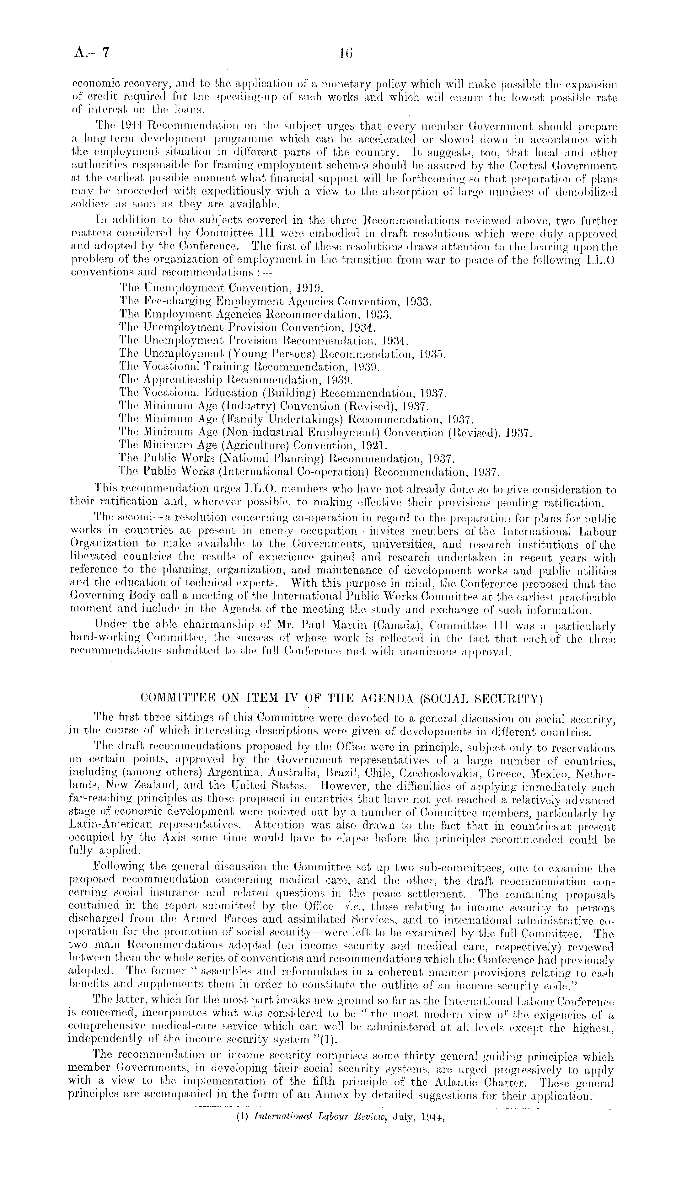 economic recovery, and to the application of a monetary policy which will make possible the expansion of credit required for the speeding-up of such works and which will ensure the lowest possible rate of interest on the loans. The 1944 Recommendation oil the subject urges that every member Government should prepare a long-term development programme which can be accelerated or slowed down in accordance with the employment situation in different parts of the country. It suggests, too, that local and other authorities responsible for framing employment schemes should be assured by the Central Government at the earliest possible moment what financial support will be forthcoming so that preparation of plans may be proceeded with expeditiously with a view to the absorption of large numbers of demobilized soldiers as soon as they are available. In addition to the subjects covered in the three Recommendations reviewed above, two further matters considered by Committee 111 were embodied in draft resolutions which were duly approved and adopted by the Conference. The first of these resolutions draws attention to the bearing upon the problem of the organization of employment in the transition from war to peace of the following 1.L.0 conventions and recommendations :— The Unemployment Convention, 1919. The Fee-charging Employment Agencies Convention, 1933. The Employment Agencies Recommendation, 1933. The Unemployment Provision Convention, 1934. The Unemployment Provision Recommendation, .1934. The Unemployment (Young Persons) Recommendation, 1935. The Vocational Training Recommendation, 1939. The Apprenticeship Recommendation, 1939. The Vocational Education (Building) Recommendation, 1937. The Minimum Age (Industry) Convention (Revised), 1937. The Minimum Age (Family Undertakings) Recommendation, 1937. The Minimum Age (Non-industrial Employment) Convention (Revised), 1937. The Minimum Age (Agriculture) Convention, 1921. The Public Works (National Planning) Recommendation, 1937. The Public Works (International Co-operation) Recommendation, 1937. This recommendation urges 1.L.0. members who have not already done so to give consideration to their ratification and, wherever possible, to making effective their provisions pending ratification. The second —a resolution concerning co-operation in regard to the preparation for plans for public works in countries at present in enemy occupation- invites members of the International Labour Organization to make available to the Governments, universities, and research institutions of the liberated countries the results of experience gained and research undertaken in recent years with reference to the planning, organization, and maintenance of development works and public utilities and the education of technical experts. With this purpose in mind, the Conference proposed that the Governing Body call a meeting of the International Public Works Committee at the earliest practicable moment and include in the Agenda of the meeting the study and exchange of such information. Under the able chairmanship of Mr. Paul Martin (Canada), Committee 111 was a particularly hard-working Committee, the success of whose work is reflected in the fact that each of the three recommendations submitted to the full Conference met with unanimous approval. COMMITTEE ON ITEM IV OF THE AGENDA (SOCIAL SECURITY) The first three sittings of this Committee were devoted to a general discussion on social security, in the course of which interesting descriptions were given of developments in different countries. The draft recommendations proposed by the Office were in principle, subject only to reservations on certain points, approved by the Government representatives of a large number of countries, including (among others) Argentina, Australia, Brazil, Chile, Czechoslovakia, Greece, Mexico, Netherlands, New Zealand, and the United States. However, the difficulties,of applying immediately such far-reaching principles as those proposed in countries that have not yet reached a relatively advanced stage of economic development were pointed out by a number of Committee members, particularly by Latin-American representatives. Attention was also drawn to the fact that in countries at present occupied by the Axis some time would have to elapse before the principles recommended could be fully applied. Following the general discussion the Committee set up two sub-committees, one to examine the proposed recommendation concerning medical care, and the other, the draft reocmmendation concerning social insurance and related questions in the peace settlement. The remaining proposals contained in the report submitted by the Office—i.e., those relating to income security to persons discharged from the Armed Forces and assimilated Services, and to international administrative cooperation for the promotion of social security —were left to be examined by the full Committee. The two main Recommendations adopted (on income security and medical care, respectively) reviewed between them the whole series of conventions and recommendations which the Conference had previously adopted. The former " assembles and reformulates in a coherent manner provisions relating to cash benefits and supplements them in order to constitute the outline of an income security code." The latter, which for the most part breaks new ground so far as the International Labour Conference is concerned, incorporates what was considered to be " the most modern view of the exigencies of a comprehensive medical-care service which can well be, administered at all levels except the highest, independently of the income security system "(1). The recommendation on income security comprises some thirty general guiding principles which member Governments, in developing their social security systems, are urged progressively to apply with a view to the implementation of the fifth principle of the Atlantic Charter. These general principles are accompanie