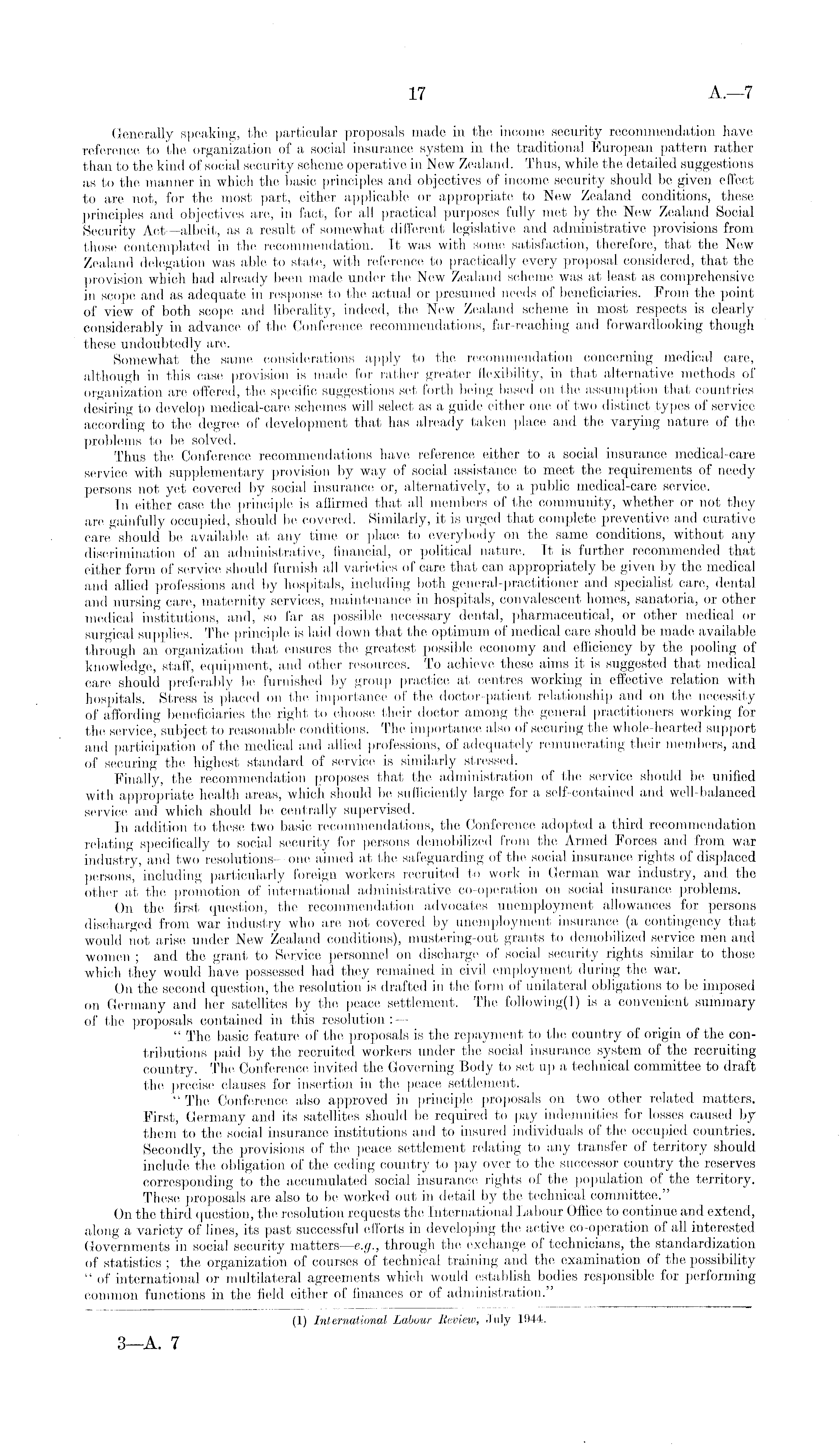 Generally speaking, the particular proposals made in the income security recommendation have reference to the organization of a social insurance system in t he traditional European pattern rather than to the kind of social security scheme operative in New Zealand. Thus, while the detailed suggestions as to the manner in which the basic principles and objectives of income security should be given effect to are not, for the most part, either applicable or appropriate to New Zealand conditions, these principles and objectives are, in fact, for all practical purposes fully met by the New Zealand Social Security Act—albeit, as a result of somewhat different legislative and administrative provisions from those contemplated in the recommendation. It was with some satisfaction, therefore, that the New Zealand delegation was able to state, with reference to practically every proposal considered, that the provision which had already been made under the New Zealand scheme was at least as comprehensive in scope and as adequate in response to the actual or presumed needs of beneficiaries. From the point of view of both scope and liberality, indeed, the New Zealand scheme in most respects is clearly considerably in advance of the Conference recommendations, far-reaching and forwardlooking though these undoubtedly are. Somewhat the same considerations apply to the recommendation concerning medical care, although in this case provision is made for rather greater flexibility, in that alternative methods of organization are offered, the specific suggestions set forth being based 011 the assumption that countries desiring to develop medical-care schemes will select as a guide either one of two distinct types of service according to the degree of development that has already taken place and the varying nature of the problems to be solved. Thus the Conference recommendations have reference either to a social insurance medical-care service with supplementary provision by way of social assistance to meet the requirements of needy persons not yet covered by social insurance or, alternatively, to a public medical-care service. In either case the principle is affirmed that all members of the community, whether or not they are gainfully occupied, should be covered. Similarly, it is urged that complete preventive and curative care should be available at any time or place to everybody 011 the same conditions, without any discrimination of an administrative, financial, or political nature. It is further recommended that either form of service should furnish all varieties of care that can appropriately be given by the medical and allied professions and by hospitals, including both general-practitioner and specialist care, dental and nursing care, maternity services, maintenance'in hospitals, convalescent homes, sanatoria, or other medical institutions, and, so far as possible necessary dental, pharmaceutical, or other medical or surgical supplies-. The principle is laid down that the optimum of medical care should be made available through an organization that ensures the greatest possible economy and efficiency by the pooling of knowledge, staff, equipment, and other resources. To achieve these aims it is suggested that medical care should preferably be furnished by group practice at centres working in effective relation with hospitals. Stress is placed on the importance of the doctor-patient relationship and on the necessity of affording beneficiaries the right to choose their doctor among the general practitioners working for the service, subject to reasonable conditions. The importance also of securing the whole-hearted support and participation of the medical and allied professions, of adequately remunerating their members, and of securing the highest standard of service is similarly stressed. Finally, the recommendation proposes that the administration of the service should be unified with appropriate health areas, which should be sufficiently large for a self-contained and well-balanced service and which should be centrally supervised. In addition to these two basic recommendations, the Conference adopted a third recommendation relating specifically to social security for persons demobilized from the Armed Forces and from war industry, and two resolutions—one aimed at the safeguarding of the social insurance rights of displaced persons, including particularly foreign workers recruited to work in German war industry, and the other at the promotion of international administrative co-operation on social insurance problems. On the first question, the recommendation advocates unemployment allowances for persons discharged from war industry who are not covered by unemployment insurance (a contingency that would not arise under New Zealand conditions), mustering-out grants to demobilized service men and women ; and the grant to Service personnel 011 discharge of social security rights similar to those which they would have possessed had they remained in civil employment during the war. 011 the second question, the resolution is drafted in the form of unilateral obligations to be imposed 011 Germany and her satellites by the peace settlement. The following(l) is a convenient summary of the proposals contained in this resolution : — " The basic feature of the proposals is the repayment to the country of origin of the contributions paid by the recruited workers under the social insurance system of the recruiting country. The Conference invited the Governing Body to set up a technical committee to draft the precise clauses for insertion in the peace settlement. " The Conference also approved in principle proposals 011 two other related matters. First, Germany and its satellites should be required to pay indemnities for losses caused by them to the social insurance institutions and to insured individuals of the occupied countries. Secondly, the provisions of the peace settlement relating to any transfer of territory 