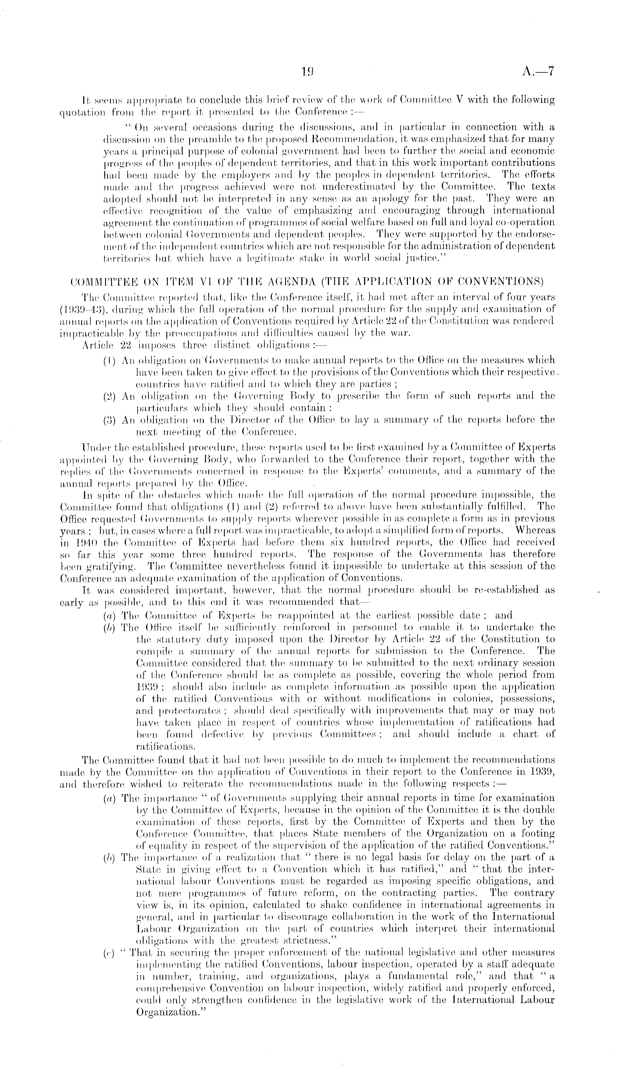 It seems appropriate to conclude this brief review of the work of Committee V with the following quotation from the report it presented to the Conference : — " On several occasions during the discussions, and in particular in connection with a discussion on the preamble to the proposed Recommendation, it was emphasized that for many years a principal purpose of colonial government had been to further the social and economic progress of the peoples of dependent territories, and that in this work important contributions had been made by the employers and by the peoples in dependent territories. The efforts made and the progress achieved were not underestimated by the Committee. The texts adopted should not be interpreted in any sense as an apology for the past. They were an effective recognition of the value of emphasizing and encouraging through international agreement the continuation of programmes of social welfare based on full and loyal co-operation between colonial Governments and dependent peoples. They were supported by the endorsement of the independent countries which are not responsible for the administration of dependent territories but which have a legitimate stake in world social justice." COMMITTEE ON ITEM VI OF THE AGENDA (THE APPLICATION OF CONVENTIONS) The Committee reported that, like the Conference itself, it had met after an interval of four years (1939-43), during which the full operation of the normal procedure for the supply and examination of annual reports on the application of Conventions required by Article '22 of the Constitution was rendered impracticable by the preoccupations and difficulties, caused by the war. Article 22 imposes three distinct obligations : — (1) An obligation on" Governments to make annual reports to the Office on the measures which have been taken to give effect to the provisions of the Conventions which their respective countries have ratified and to which they are parties ; (2) An obligation on the Governing Body to prescribe the form of such reports and the particulars which they should contain : (3) An obligation on the Director of the Office to lay a summary of the reports before the next meeting of the Conference. Under the established procedure, these reports used to be first examined by a Committee of Experts appointed by the Governing Body, who forwarded to the Conference their report, together with the replies of the Governments concerned in response to the Experts' comments, and a summary of (lie annual reports prepared by the Office. In spite of the obstacles which made the full operation of the normal procedure impossible, the Committee found that obligations (1) and (2) referred to above have been substantially fulfilled. The Office requested Governments to supply reports wherever possible in as complete a form as in previous years ; but, in cases where a full report was impracticable, to adopt a simplified form of reports. Whereas in 1940 the Committee of Experts had before them six hundred reports, the Office had received so far this year some three hundred reports. The response of the Governments has therefore been gratifying. The Committee nevertheless found it impossible to undertake at this session of the Conference an adequate examination of the application of Conventions. It was considered important, however, that the normal procedure should be re-established as early as possible, and to this end it was recommended that — (a) The Committee of Experts be reappointed at the earliest possible date ; and (b) The Office itself be sufficiently reinforced in personnel to enable it to undertake the the statutory duty imposed upon the Director by Article 22 of the Constitution to compile a summary of the annual reports for submission to the Conference. The Committee considered that the summary to be submitted to the next ordinary session of the Conference should be as complete as possible, covering the whole period from 1939 ; should also include as complete information as possible upon the application of the ratified Conventions with or without modifications in colonies, possessions, and protectorates ; should deal specifically with improvements that may or may not have taken place in respect of countries whose implementation of ratifications had been found defective by previous Committees ; and should include a chart of ratifications. The Committee found that it had not been possible to do much to implement the recommendations made by the Committee on the application of Conventions in their report to the Conference in 1939, and therefore wished to reiterate the recommendations made in the following respects : — (а) The importance " of Governments supplying their annual reports in time for examination by the Committee of Experts, because in the opinion of the Committee it is the double examination of these reports, first by the Committee of Experts and then by the Conference Committee, that places State members of the Organization on a footing of equality in respect of the supervision of the application of the ratified Conventions." (б) The importance of a realization that " there is no legal basis for delay on the part of a State in giving effect to a Convention which it has ratified," and " that the international labour Conventions must be regarded as imposing specific obligations, and not mere programmes of future reform, on the contracting parties. The contrary view is, in its opinion, calculated to shake confidence in international agreements in general, and in particular to discourage collaboration in the work of the International Labour Organization on the part of countries which interpret their international obligations with the greatest strictness." ((.•) " That in securing the proper enforcement of the national legislative and other measures implementing the ratified Conventions, labour inspection, operated by a staff adequate in number, training, and organizations, plays a fundamental role," and that "