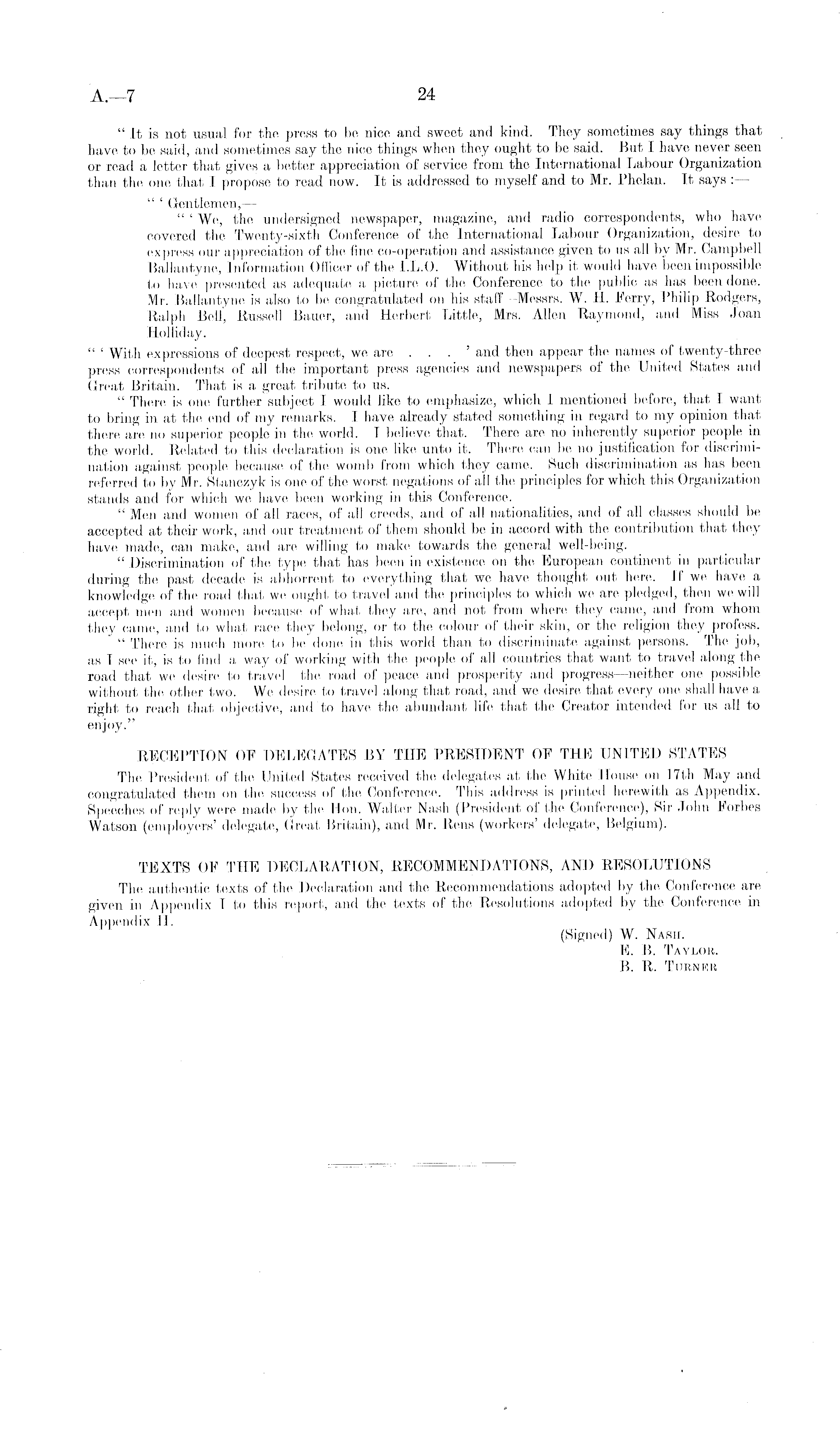 "It is not usual for the press to be nice and sweet and kind. They sometimes say things that have to be said, and sometimes say the nice things when they ought to be said. But I have never seen or read a letter that gives a better appreciation of service from the International Labour Organization than the one that I propose to read now. It is addressed to myself and to Mr. Phelan. It says : — " ' Gentlemen, — " ' We, the undersigned newspaper, magazine, and radio correspondents, who have covered the Twenty-sixth Conference of the International Labour Organization, desire to express our appreciation of the fine co-operation and assistance given to us all by Mr. Campbell Ballantyne, Information Officer of the 1.L.0. Without his help it would have been impossible to have presented as adequate a picture of the Conference to the public as has been done. Mr. Ballantyne is also to be congratulated on his staff—Messrs. W. H. Ferry, Philip Rodgers, Ralph Bell, Russell Bauer, and Herbert Little, Mrs. Allen Raymond, and Miss .loan Holliday. " ' With expressions of deepest respect, we are . . . ' and then appear the names of twenty-three press correspondents of all the important press agencies and newspapers of the United States and Great Britain. That is a great tribute to us. " There is one further subject I would like to emphasize, which I mentioned before, that I want to bring in at the end of my remarks. I have already stated something in regard to my opinion that there are no superior people in the world. I believe that. There are no inherently superior people in the world. Related to this declaration is one like unto it. There can be no justification for discrimination against people because of the womb from which they came. Such discrimination as has been referred to by Mr. Stanczyk is one of the worst negations of all the principles for which this Organization stands and for which we have been working in this Conference. " Men and women of all races, of all creeds, and of all nationalities, and of all classes should be accepted at their work, and our treatment of them should be in accord with the contribution that they have made, can make, and are willing to make towards the general well-being. " Discrimination of the type that has been in existence on the European continent in particular during the past decade is abhorrent to everything that wo have thought out here. If we, have a knowledge of the road that we, ought to travel and the principles to which we are pledged, then we will accept men and women because of what they are, and not from where they came, and from whom they came, and to what race they belong, or to the colour of their skin, or the religion they profess. " There is much more to lie done in this world than to discriminate against persons. The job, as T see it, is to find a way of working with the people of all countries that want to travel along the road that we desire to travel the road of peace and prosperity and progress—neither one possible without the other two. We desire to travel along that road, and we desire that every one shall have a right to reach that objective, and to have the abundant life that the Creator intended for us all to enjoy." RECEPTION OF DELEGATES BY THE PRESIDENT OF THE UNITED STATES The President of the United States received the delegates at the White House on 17th May and congratulated them on the success of the Conference. This address is printed herewith as Appendix. Speeches of reply were made by the Hon. Walter Nash (President of the Conference), Sir John Forbes Watson (employers' delegate, Great Britain), and Mr. Reus (workers' delegate, Belgium). TEXTS OF THE DECLARATION, RECOMMENDATIONS, AND RESOLUTIONS The authentic texts of the Declaration and the Recommendations adopted by the Conference are given in Appendix I to this report, and the texts of the Resolutions adopted by the Conference in Appendix 11. (Signed) W. Nash. E. B. Taylor. B. R. Turner
