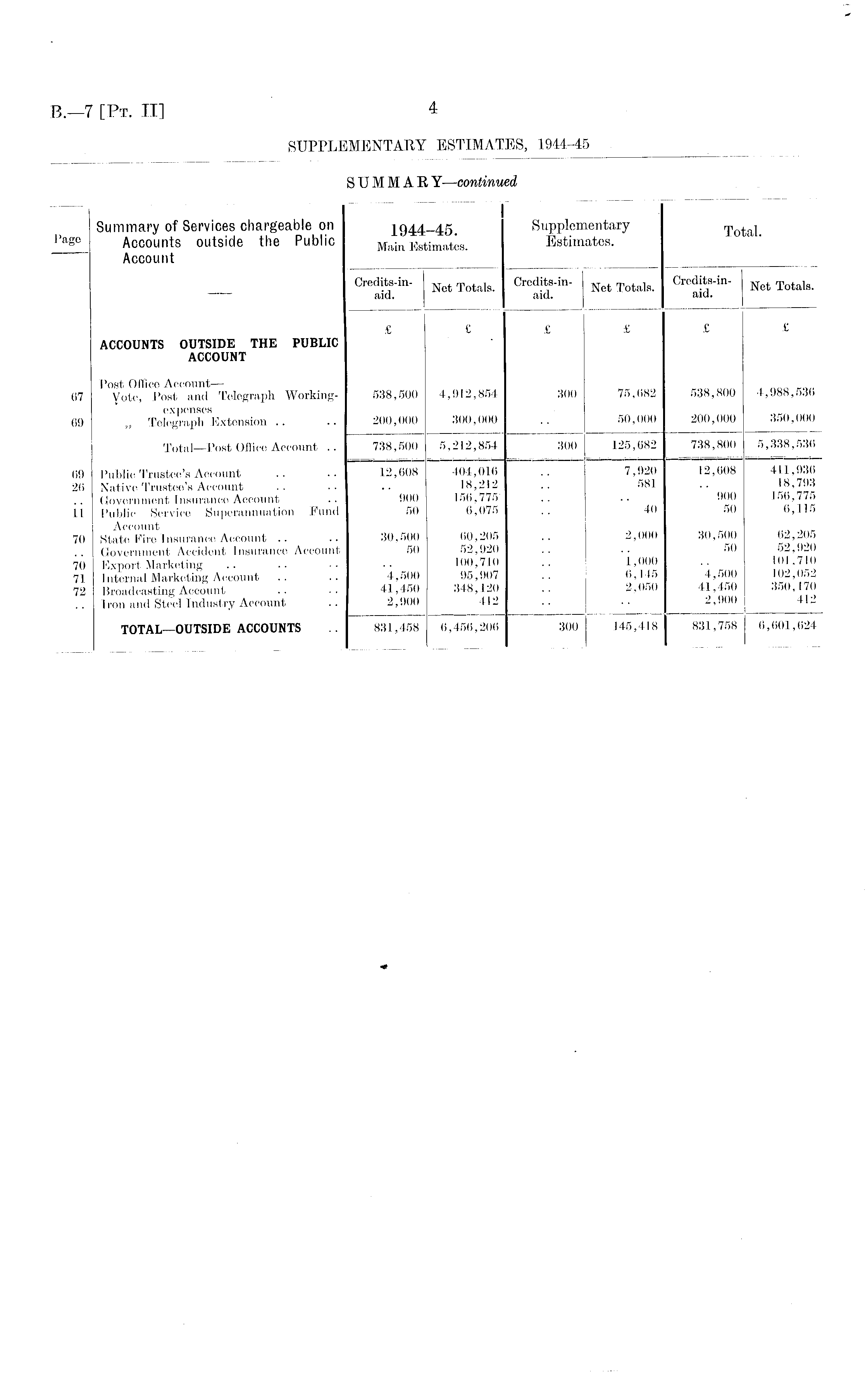 I I Summary of Services chargeable on 1944-45. Supplementary Tota j Pa g° Accounts outside the Public Main Estimates. Estimates. Account Credits-in- Not Totals . Credits-in- Net Totals . Credits-in- Net Totals . aid. aid. aid. ££££££ ACCOUNTS OUTSIDE THE PUBLIC ACCOUNT Post Office Account — „„ _„ 67 Y ote > Post and Telegraph Working- 538,500 4,912,854 300 75,682 538,800 4,988,536 expenses ,.„ , 69 „ Telegraph Extension .. .. 200,000 300,000 .. 50,000 200,000 350,000 Total—Post Office Account .. 738,500 5,212,854 300 125,082 738,800 5,338,536 69 Public Trustee's Account .. .. 12,608 404,016 .. 7,920 12,608 411,936 26 Native Trustee's Account .. .• 18,212 .. 581 .. 18,793 .. Government Insurance Account .. 900 156,775 .. .. 900 156,775 11 Public Service Superannuation Fund 50 6,075 ... 40 50 6,115 70 State Kb" Insurance Account .. .. 30,500 60,205 .. 2,000 30,500 62,205 .. Government Accident Insurance Account 50 52,920 .. .. 50 o2,.)20 70 Export Marketing 100,710 .. 1,000 .. 01,710 71 Internal Marketing Account .. .. 4,500 95,907 .. 6,145 4,500 02,052 72 Broadcasting Account .. .. 41,450 348,120 .. 2,050 41,450 350,170 .. Iron and Steel Industry Account .. 2,900 412 .. .. 2,900 412 TOTAL—OUTSIDE ACCOUNTS .. 831,458 6,456,206 300 145,418 831,758 6,601,624