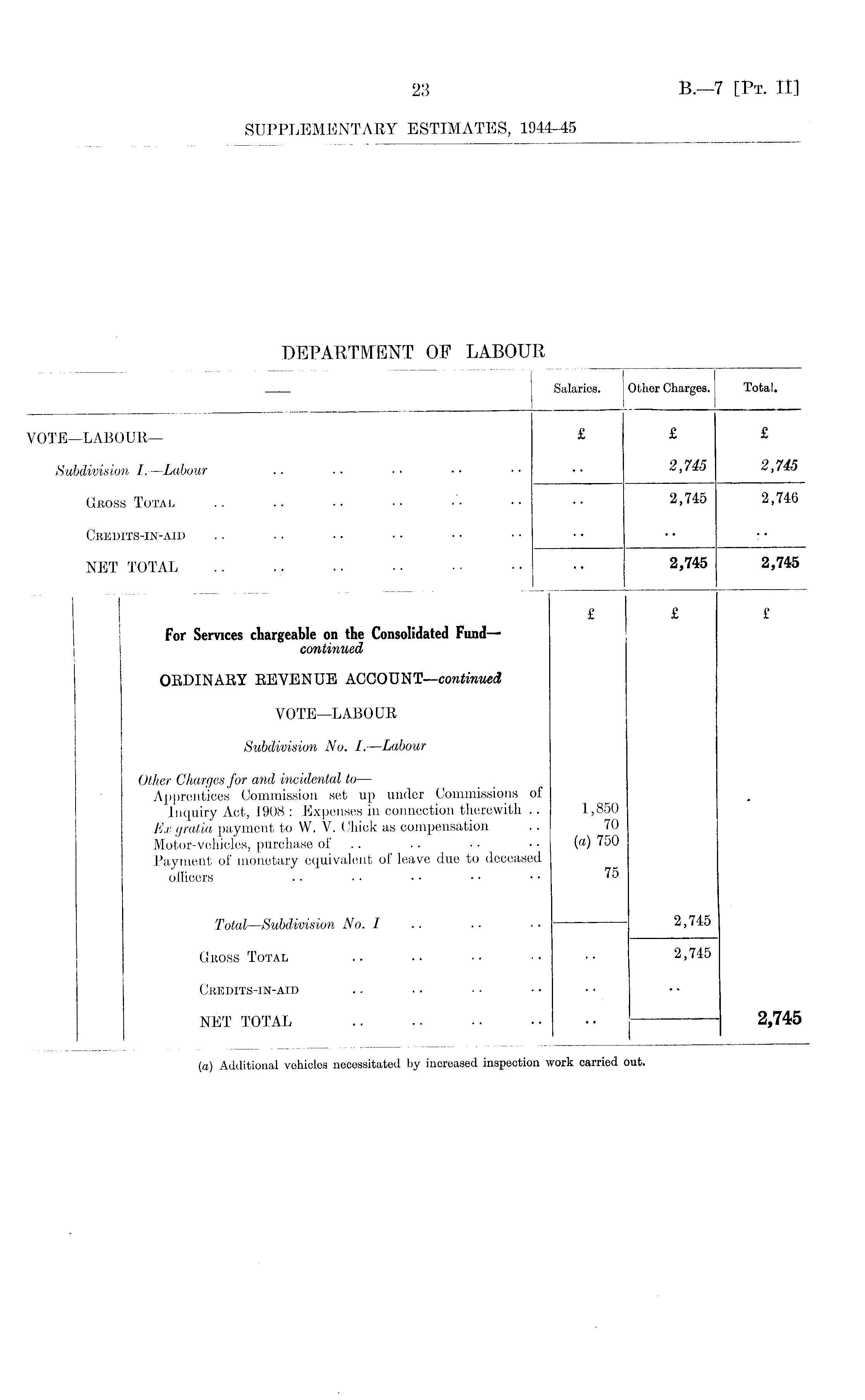 Salarios. Other Charges. Total. VOTE—LABOUR— £ £ £ Subdivision I. — Labour .. .. •• •• •• •• 2,745 2,745 Gross Total .. .. ' 2,745 2,746 Credits-in-aid NET TOTAL .. ... .. •• •• •• •• 2 » 745 2 » 745 £ £ £ For Services chargeable on the Consolidated Fund— continued ORDINARY REVENUE ACCOUNT— continued VOTE—LABOUR Subdivision No. I. — Labour Other Charges for and incidental to — Apprentices Commission set up under Commissions of Inquiry Act, 1908 : Expenses in connection therewith .. 1,850 Ex gratia payment to W. V. Chick as compensation . . 70 Motor-vehicles, purchase of . - ■ • • • ( a ) 750 Payment of monetary equivalent of leave due to deceased officers • .. • • • • • • • • "° Total—Subdivision No. I .. .■ ■■ — 2,745 Gross Total 2,745 Credits-in-aid NET TOTAL 2,745 (a) Additional vehicles necessitated by increased inspection work carried out.