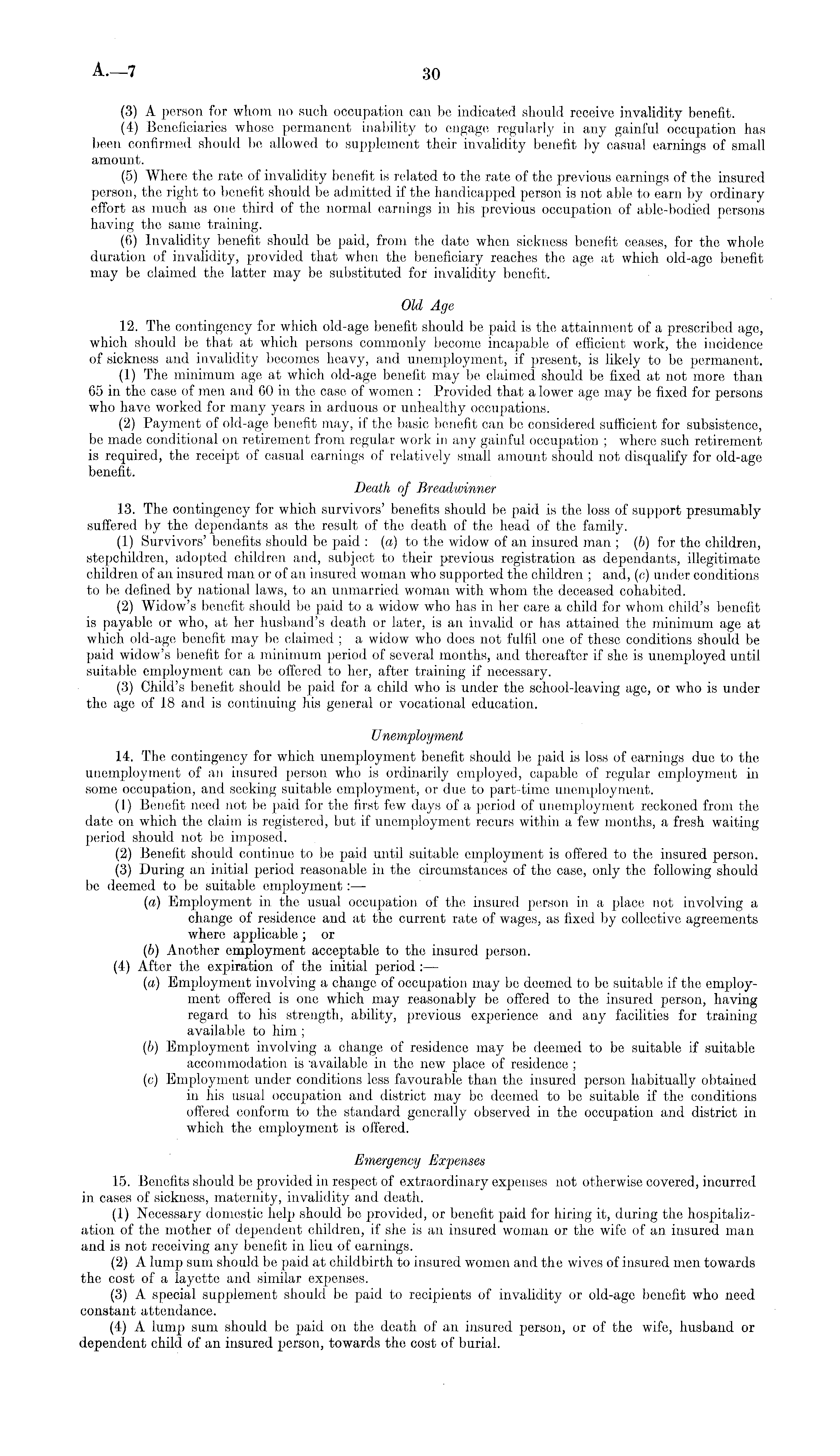 (3) A person for whom no such occupation can be indicated should receive invalidity benefit. (4) Beneficiaries whose permanent inability to engage regularly in any gainful occupation has been confirmed should be allowed to supplement their invalidity benefit by casual earnings of small amount. (5) Where the rate of invalidity benefit is related to the rate of the previous earnings of the insured person, the right to benefit should be admitted if the handicapped person is not able to earn by ordinary effort as much as one third of the normal earnings in his previous occupation of able-bodied persons having the same training. (6) Invalidity benefit should be paid, from the date when sickness benefit ceases, for the whole duration of invalidity, provided that when the beneficiary reaches the age at which old-age benefit may be claimed the latter may be substituted for invalidity benefit. Old Age 12. The contingency for which old-age benefit should be paid is the attainment of a proscribed age, which should be that at which persons commonly become incapable of efficient work, the incidence of sickness and invalidity becomes heavy, and unemployment, if present, is likely to be permanent. (1) The minimum age at which old-age benefit may be claimed should be fixed at not more than 65 in the case of men and 60 in the case of women : Provided that a lower age may be fixed for persons who have worked for many years in arduous or unhealthy occupations. (2) Payment of old-age benefit may, if the basic benefit can be considered sufficient for subsistence, be made conditional on retirement from regular work in any gainful occupation ; where such retirement is required, the receipt of casual earnings of relatively small amount should not disqualify for old-age benefit. Death of Breadwinner 13. The contingency for which survivors' benefits should be paid is the loss of support presumably suffered by the dependants as the result of the death of the head of the family. (1) Survivors' benefits should be paid : (a) to the widow of an insured man ; (b) for the children, stepchildren, adopted children and, subject to their previous registration as dependants, illegitimate children of an insured man or of an insured woman who supported the children ; and, (c) under conditions to be defined by national laws, to an unmarried woman with whom the deceased cohabited. (2) Widow's benefit should be paid to a widow who has in her care a child for whom child's benefit is payable or who, at her husband's death or later, is an invalid or has attained the minimum age at which old-age benefit may be claimed ; a widow who does not fulfil one of these conditions should be paid widow's benefit for a minimum period of several months, and thereafter if she is unemployed until suitable employment can be offered to her, after training if necessary. (3) Child's benefit should be paid for a child who is under the school-leaving age, or who is under the age of 18 and is continuing his general or vocational education. Unemployment 14. The contingency for which unemployment benefit should be paid is loss of earnings duo to the unemployment of an insured person who is ordinarily employed, capable of regular employment in some occupation, and seeking suitable employment, or due to part-time unemployment. (1) Benefit need not be paid for the first few days of a period of unemployment reckoned from the date on which the claim is registered, but if unemployment recurs within a few months, a fresh waiting period should not be imposed. (2) Benefit should continue to be paid until suitable employment is offered to the insured person. (3) During an initial period reasonable in the circumstances of the case, only the following should be deemed to be suitable employment: — (a) Employment in the usual occupation of the insured person in a place not involving a change of residence and at the current rate of wages, as fixed by collective agreements where applicable; or (b) Another employment acceptable to the insured person. (4) After the expiration of the initial period (а) Employment involving a change of occupation may be deemed to be suitable if the employment offered is one which may reasonably be offered to the insured person, having regard to his strength, ability, previous experience and any facilities for training available to him ; (б) Employment involving a change of residence may be deemed to be suitable if suitable accommodation is 'available in the new place of residence ; (c) Employment under conditions less favourable than the insured person habitually obtained in his usual occupation and district may be deemed to be suitable if the conditions offered conform to the standard generally observed in the occupation and district in which the employment is offered. Emergency Expenses 15. Benefits should be provided in respect of extraordinary expenses not otherwise covered, incurred in cases of sickness, maternity, invalidity and death. (1) Necessary domestic help should bo provided, or benefit paid for hiring it, during the hospitalization of the mother of dependent children, if she is an insured woman or the wife of an insured man and is not receiving any benefit in lieu of earnings. (2) A lump sum should be paid at childbirth to insured women and the wives of insured men towards the cost of a layette and similar expenses. (3) A special supplement should be paid to recipients of invalidity or old-age benefit who need constant attendance. (4) A lump sum should be paid on the death of an insured person, or of the wife, husband or dependent child of an insured person, towards the cost of burial.