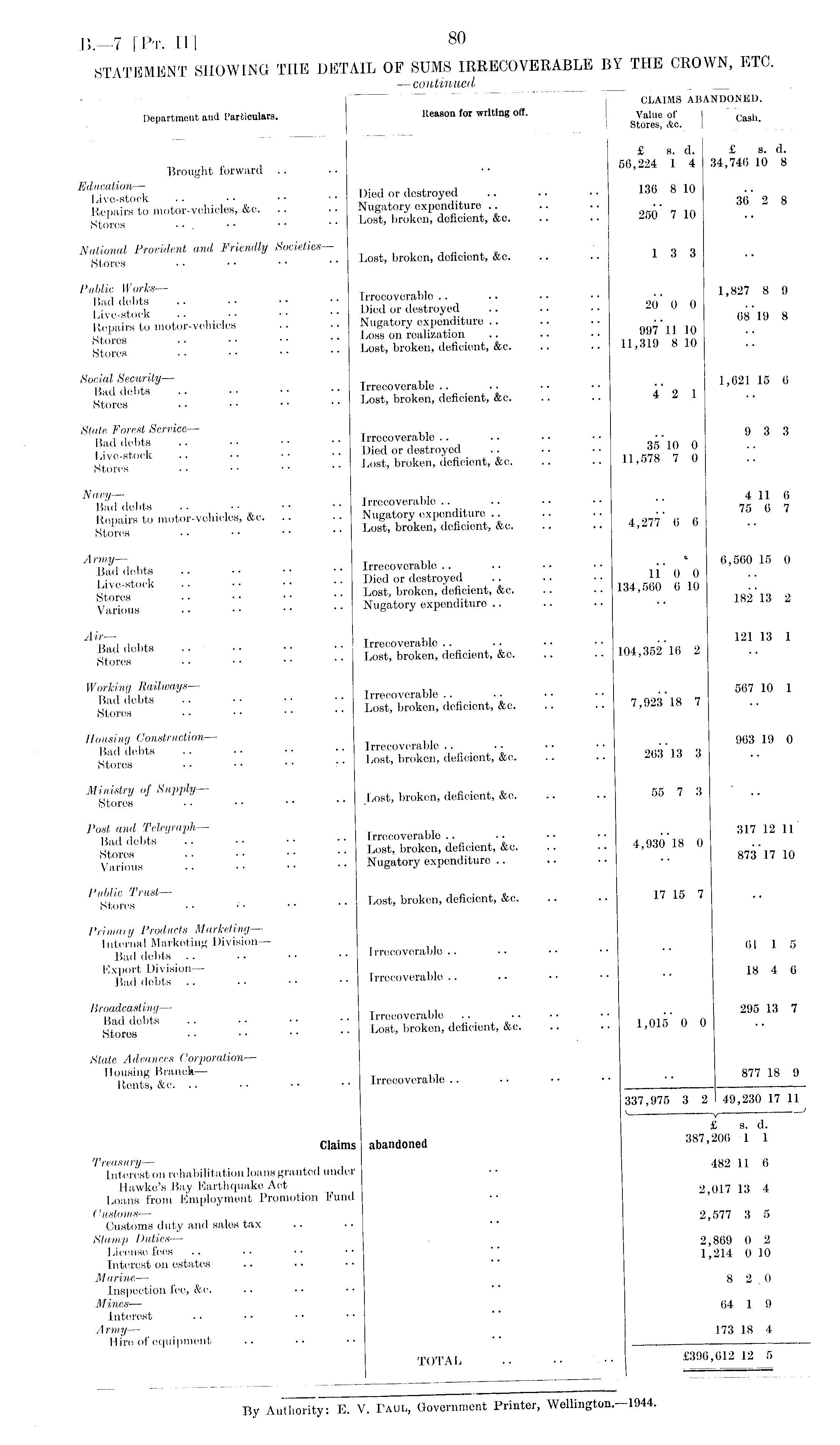 CLAIMS ABANDONED. Department and Particulars. Kea80n ,OT wrlting ofl - Value of I r Stores, Ac. | £ 8. d. £ s. d. , . , , 56,224 1 4 34,740 10 8 Brought forward Education — , , 1*10 8 10 Live-stock Died or destroyed yb £ 2 8 Repairs to motor-vehicles, &c Nugatory expenditure .. .. ■• •• SijOTes ■• •• •■ Lost, broken, deficient, &o. .. .. -sou ' i" National Provident and Friendly Societies— ■ ' lis Stores ■ • ■ • • ■ - Lost ' brokon > doficiont, &c. .. .. 1 i> a PmJKc Works— 1,827 8 9 BaddeM , 9 •• •■ •• uXTIsLy'ed " :: :: 26-00 Live-stook .. •• •• ■• Died or destroyed .. 08 19 8 Repairs to motor-vehioles .. •• Nugatory expenditure •• o, „„„ .. Loss on realization .. •• •■ »a< n iu !*££ :: !! •• Lost, broken, deficient, &c 11,319 8 10 Social Security— ' 1,621 18 6 Bad debts Irrecoverable .. .. •• •• •• „, ores _ .. .. Lost, broken, deficient, &c. .. .. * * 1 State Forest Service — 9 3 3 I Sad debts .. Irrecovera be.. •• Live-stook D,ed or destroyed .. - ' g tores .. .. .. Lost, broken, deficient, &o. .. .. 11,0<» I. « Baddebts •■ •■ •• Irrecoverable.. .. •• •• •• 75 6 7 Repairs to motor-vehicles, &c Nugatory expenditure .. •• •• gt J rog ,. .. .. Lost, broken, deficient, &e. .. .. *>*'< " D T „ mH „ .. * 6,500 15 0 Bad debts .. •• Irrecovorable .. •• ■• • • t ■ i „i, .. Died or destroyed .. .. •• ,„ iCef " ■• •' Lost, broken, deficient, &c 134,500 0 10 ,. V ari0U s :: Nugatory expenditure •• 182 13 2 £ t a 0 d re debts :: :: :: " :: :: 2 Working Railways— ,, . 507 10 1 d r t8 :: :■: :: :: SSZCi-w-*'*-. " :: 7 > 92318 7 0 "" Irrecoverable •• , 0 Stores !! : • Loat > broken ' deficient ' &c 263 13 3 Ministry of Supply- Lost, broken, deficient, &c 55 7 3 Post and Telegraph— 317 12 11' C bts - :: :: :: :: :: Mao is o Various I. Nugatory expenditure 873 17 10 PU ™oJj USt ~~ .. » Lost, broken, deficient, &c 17 15 7 Primary Products Marketing — Internal Marketing Division— . 61 1 5 Bad debts Irrecoverable Export Division— 18 4 6 Bad debts Irrecoverable Broadcasting — ,. 295 13 7 ST 8 :: :: :: :: *««**: :: :: 1,01. 0 0 Stale Advances Corporation — Housing Branch — ., 877 18 9 Rents, &c Irrecoverable •• 337,975 3 2 49,230 17 11 £ s. d. Claims abandoned 387,200 1 1 Treasury — 482 11 0 Interest on rehabilitation loans granted under Hawke's Bay Earthquake Act 2,017 13 4 Loans from Employment Promotion Fund Customs— 2,577 3 5 Customs duty and sales tax Stamp Duties — . 2,869 0 2 License foes .. •• •• •• 1,214 0 10 Interest on estates Marine — 8 2.0 Inspection fee, &o. Mines — 64 1 9 Interest Army— 173 18 4 Hire of equipment .. ■• ■■ TOTAL .. •• '••• £390,612 12 5 ' . ,- . TTT_11- J. 1f\A A
