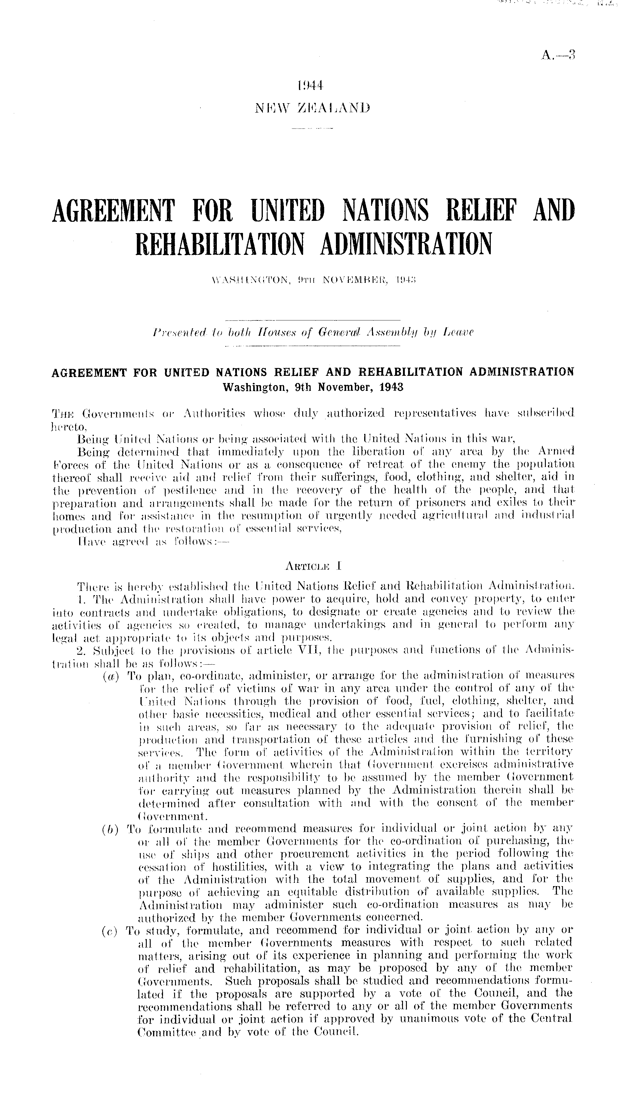 AGREEMENT FOR UNITED NATIONS RELIEF AND REHABILITATION ADMINISTRATION Washington, 9th November, 1943 The Governments or Authorities whose duly authorized representatives have subscribed hereto, Being United Nations or being associated with the United Nations in this war, Being determined that immediately upon the liberation of any area by the Armed Forces of the United Nations or as a consequence of retreat of the enemy the population thereof shall receive aid and relief from their sufferings, food, clothing, and shelter, aid in the prevention of pestilence and in the recovery of the health of the people, and that preparation and arrangements shall be made for the return of prisoners and exiles to their homes and for assistance in the resumption of urgently needed agricultural and industrial production and the restoration of essential services, Have agreed as follows:— Article I There is hereby established the United Nations Relief and Rehabilitation Administration. 1. The Administration shall have power to acquire, hold and convey property, to enter into contracts and undertake obligations, to designate or create agencies and to review the activities of agencies so created, to manage undertakings and in general to perform any legal act appropriate to its objects and purposes. 2. Subject to the provisions of article VII, the purposes and functions of the Administration shall be as follows:— (а) To plan, co-ordinate, administer, or arrange for the administration of measures for the relief of victims of war in any area under the control of any of the United Nations through the provision of food, fuel, clothing, shelter, and other basic necessities, medical and other essential services; and to facilitate in such areas, so far as necessary to the adequate provision of relief, the production and transportation of these articles and the furnishing of these services. The form of activities of the Administration within the territory of a member Government wherein that Government exercises administrative authority and the responsibility to be assumed by the member Government for carrying out measures planned by the Administration therein shall be determined after consultation with and with the consent of the member Government. (б) To formulate and recommend measures for individual or joint action by any or all of the member Governments for the co-ordination of purchasing, the use of ships and other procurement activities in the period following the cessation of hostilities, with a view to integrating the plans and activities of the Administration with the total movement of supplies, and for the purpose of achieving an equitable distribution of available supplies. The Administration may administer such co-ordination measures as may be authorized by the member Governments concerned. (c) To study, formulate, and recommend for individual or joint action by any or all of the member Governments measures with respect to such related matters, arising out of its experience in planning and performing the work of relief and rehabilitation, as may be proposed by any of the member Governments. Such proposals shall be studied and recommendations formulated if the proposals are supported by a vote of the Council, and the recommendations shall be referred to any or all of the member Governments for individual or joint action if approved by unanimous vote of the Central Committee and by vote of the Council.