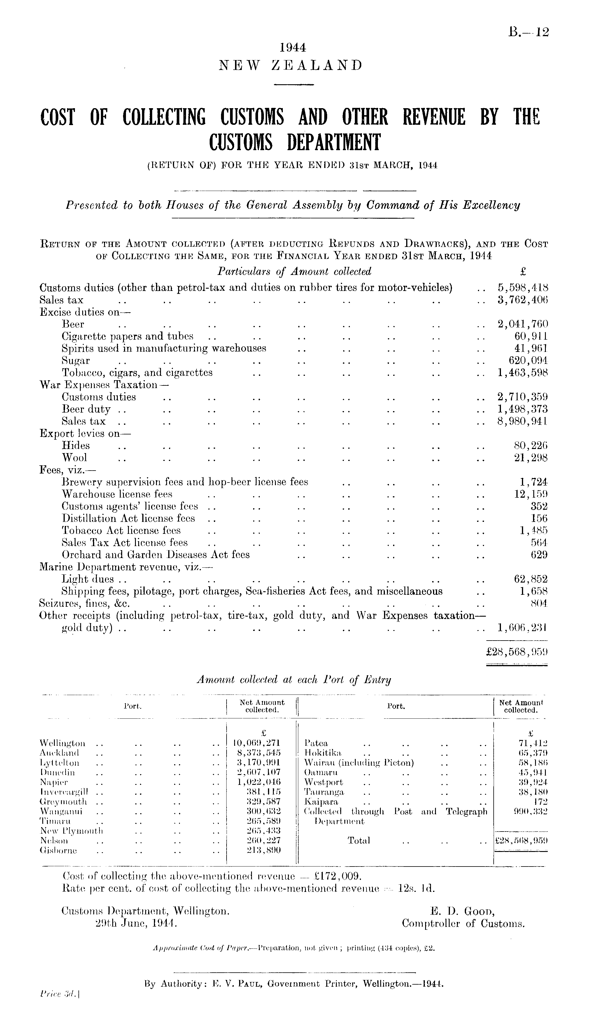 Cost of collecting the above-mentioned revenue = £172,009. Rate per cent, of cost of collecting the above-mentioned revenue = 12s. Id. Customs Department, Wellington. E. D. Good, 29th June, 1944. Comptroller of Customs.