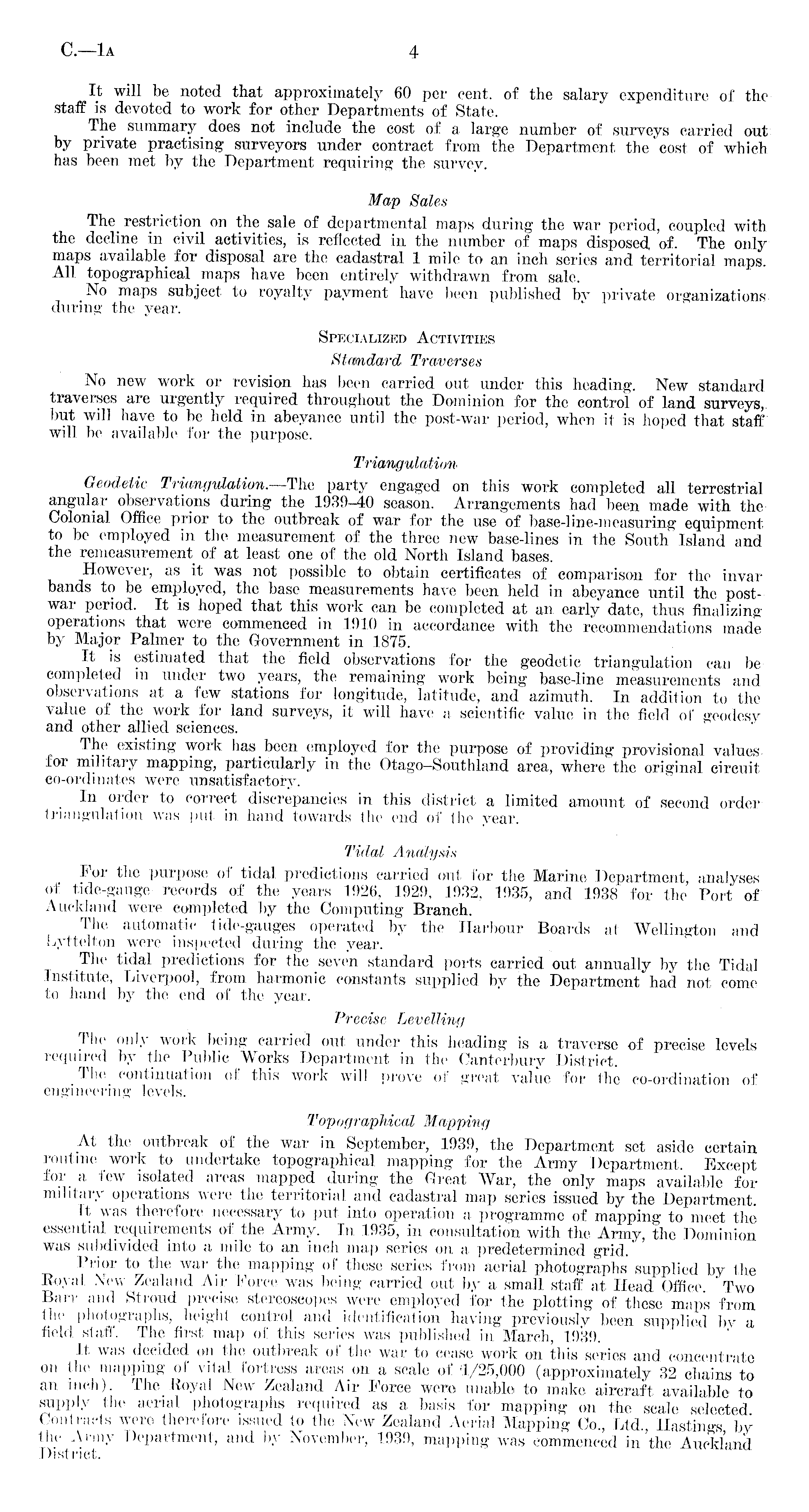 It will be noted that approximately 60 per cent, of the salary expenditure of the staff is devoted to work for other Departments of State. The summary does not include the cost of a large number of surveys carried out by private practising surveyors under contract from the Department the'cost of which has been met by the Department requiring the survey. Map Sales The restriction on the sale of departmental maps during the war period, coupled with the decline in civil activities, is reflected in the number of maps disposed of. The only maps for disposal are the cadastral 1 mile to an inch series and territorial maps. All topographical maps have been entirely withdrawn from sale. No maps subject to royalty payment have been published by private organizations during the year. Specialized Activities Stmdard Traverses No new work or revision has been carried out under this heading. New standard traverses are urgently required throughout the Dominion for the control of land surveys, but will have to be held in abeyance until the post-war period, when it is hoped that staff will be available for the purpose. TrianguLatim Geodetic Tr{angulation.—The party engaged on this work completed all terrestrial angular observations during the 1939-40 season. Arrangements had been made with the Colonial Office prior to the outbreak of war for the use of base-line-measuring equipment to be employed in the measurement of the three new base-lines in the South Island and the remeasurement of at least one of the old North Island bases. However, as it was not possible to obtain certificates of comparison for the invar bands to be employed, the base measurements have been held in abeyance until the postwar period. It is hoped that this work can be completed at an early date, thus finalizing operations that were commenced in 1910 in accordance with the recommendations made by Major Palmer to the. Government in 1875. It is estimated that the field observations for the geodetic triangulation can be completed in under two years, the remaining work being base-line measurements and observations at a few stations for longitude, latitude, and azimuth. In addition to the value of the work for land surveys, it will have a scientific value in the field of geodesy and other allied sciences. The existing work has been employed for the purpose of providing provisional values for military mapping, particularly in the Otago—Southland area, where the original circuit co-ordinates were unsatisfactory. In order to correct discrepancies in this district a limited amount of second order triangulation was put in hand towards the end of the year. Tidal Analysis lor the purpose of tidal predictions carried out for the Marine Department, analyses of tide-gauge records of the years 1926, 1929, 1932, 1935, and 1938 for the Port of Auckland were completed by the Computing Branch. The automatic tide-gauges operated by the Harbour Boards at Wellington and Lyttelton were inspected during the year. The tidal predictions for the seven standard ports carried out annually by the Tidal Institute, Liverpool, from harmonic constants supplied by the Department had not come to hand by the end of the year. Precise Levelling The only work being carried out under this heading is a traverse of precise levels required by the Public Works Department in the Canterbury District. The continuation of this work will prove of great value for the co-ordination of engineering levels. Topographical Mapping At the outbreak of the war in September, 1939, the Department set aside certain routine work to undertake topographical mapping for the Army Department. Except for a few isolated areas mapped during the Great War, the only maps available for military operations were the territorial and cadastral map series issued by the Department. It was therefore necessary to put into operation a programme of mapping to meet the essential requirements of the Army. In 1935, in consultation with the Army, the Dominion was subdivided into a mile to an inch map series on a predetermined grid.' Prior to the war the mapping of these series from aerial photographs supplied by the Royal New Zealand Air Force was being carried out by a small staff at Head Office. ' Two Barr and Stroud precise stereoscopes were_ employed for the plotting of these maps from the photographs, height control and identification having previously been supplied bv a field staff. The first map of this series was published in March, 1939. It was decided on the outbreak of the war to cease work on this series and concentrate on the mapping of vital fortress areas on a scale of 1/25,000 (approximately 32 chains'to an inch). The Royal New Zealand Air Force were unable to make aircraft available tosupply the aerial photographs required as a basis for mapping on the scale selected Contracts were therefore issued to the New Zealand Aerial Mapping Co Ltd Hastings bv the Army Department, and by November, 1939, mapping was commenced in 'the Auckland District.