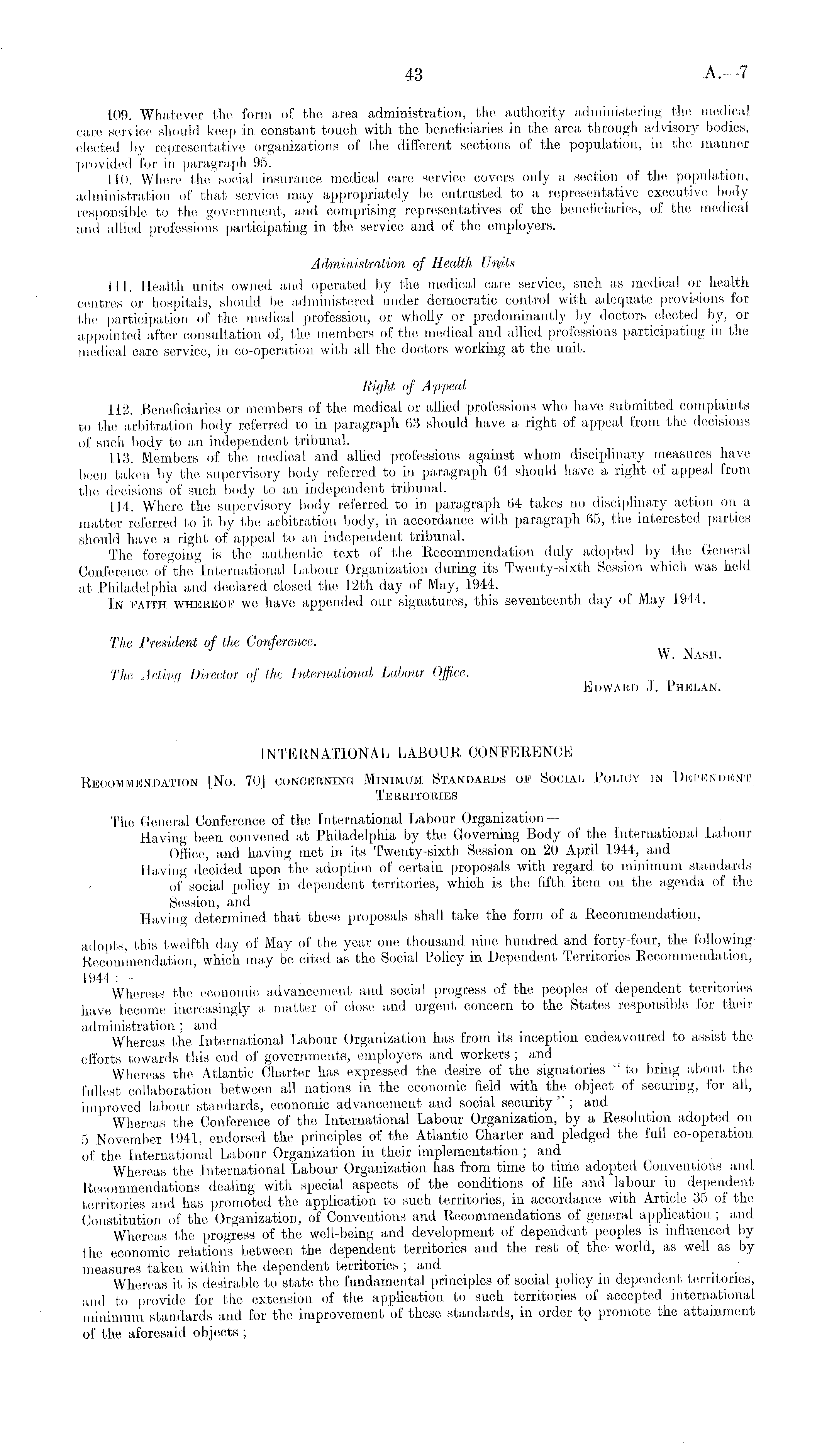 109. Whatever the form of the area administration, the authority administering the medical care service should keep in constant touch with the beneficiaries in the area through advisory bodies, elected by representative organizations of the different sections of the population, in the manner provided for in paragraph 95. 110. Where the" social insurance medical care service covers only a section of the population, administration of that service may appropriately be entrusted to a representative executive body responsible to the government, and comprising representatives of the beneficiaries, of the medical and allied professions participating in the service and of the employers. Administration of Health Units 111. Health units owned and operated by the medical care service, such as medical or health centres or hospitals, should be administered under democratic control with adequate provisions for the participation of the medical profession, or wholly or predominantly by doctors elected by, or appointed after consultation of, the members of the medical and allied professions participating in the medical care service, in co-operation with all the doctors working at the unit. Right of Appeal 112. Beneficiaries or members of the medical or allied professions who have submitted complaints to the arbitration body referred to in paragraph 63 should have a right of appeal from the decisions of such body to an independent tribunal. 113. Members of the medical and allied professions against whom disciplinary measures have been taken by the supervisory body referred to in paragraph 64 should have a right of appeal from the decisions of such body to an independent tribunal. 114. Where the supervisory body referred to in paragraph 64 takes no disciplinary action on a matter referred to it by the arbitration body, in accordance with paragraph 65, the interested parties should have a right of appeal to an independent tribunal. The foregoing is the authentic text of the Recommendation duly adopted by the General Conference of the International Labour Organization during its Twenty-sixth Session which was held at Philadelphia and declared closed the 12th day of May, 1944. In faith whereof we have appended our signatures, this seventeenth day of May 1944. The President of the Conference. J W. Nash. The Acting Director of the International Labour Office. Edward J. Phelan. INTERNATIONAL LABOUR CONFERENCE Recommendation [No. 70] concerning Minimum Standards op Social Policy in Dependent Territories The General Conference of the International Labour OrganizationHaving been convened at Philadelphia by the Governing Body of the International Labour Office, and having met in its Twenty-sixth Session on 20 April 1944, and Having decided upon the adoption of certain proposals with regard to minimum standards of social policy in dependent territories, which is the fifth item on the agenda of the Session, and Having determined that these proposals shall take the form of a Recommendation, adopts, this twelfth day of May of the year one thousand nine hundred and forty-four, the following Recommendation, which may be cited as the Social Policy in Dependent Territories Recommendation, 1944 : Whereas the economic advancement and social progress of the peoples of dependent territories have become increasingly a matter of close and urgent concern to the States responsible for their administration; and _ . Whereas the International Labour Organization has from its inception endeavoured to assist the efforts towards this end of governments, employers and workers ; and Whereas the Atlantic Charter has expressed the desire of the signatories " to bring about the fullest collaboration between all nations in the economic field with the object of securing, for all, improved labour standards, economic advancement and social security " ; and Whereas the Conference of the International Labour Organization, by a Resolution adopted on 5 November 1941, endorsed the principles of the Atlantic Charter and pledged the full co-operation of the International Labour Organization in their implementation ; and Whereas the International Labour Organization has from time to time adopted Conventions and Recommendations dealing with special aspects of the conditions of life and labour in dependent territories and has promoted the application to such territories, in accordance with Article 35 of the Constitution of the Organization, of Conventions and Recommendations of general application ; and Whereas the progress of the well-being and development of dependent peoples is influenced by the economic relations between the dependent territories and the rest of the world, as well as by measures taken within the dependent territories *, and Whereas it is desirable to state the fundamental principles of social policy in dependent territories, and to provide for the extension of the application to such territories of. accepted international minimum standards and for the improvement of these standards, in order to promote the attainment of the aforesaid objects ;