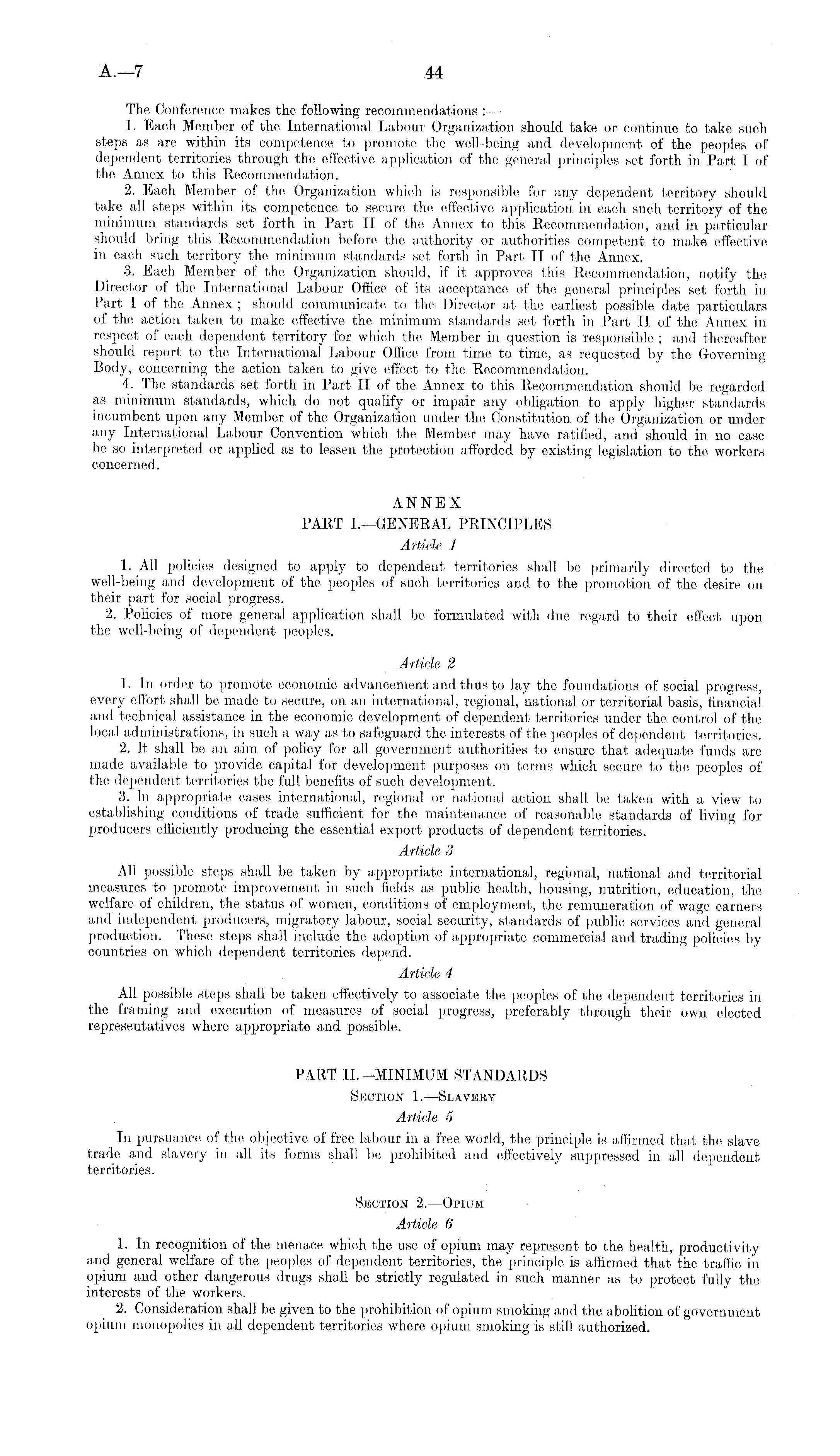 The Conference makes the following recommendations :— 1. Each Member of the International Labour Organization should take or continue to take such steps as are within its competence to promote the well-being and development of the peoples of dependent territories through the effective application of the general principles set forth in Part I of the Annex to this Recommendation. 2. Each Member of the Organization which is responsible for any dependent territory should take all steps within its competence to secure the effective application in each such territory of the minimum standards set forth in Part II of the Annex to this Recommendation, and in particular should bring this Recommendation before the authority or authorities competent to make effective in each such territory the minimum standards set forth in Part II of the Annex. 3. Each Member of the Organization should, if it approves this Recommendation, notify the Director of the International Labour Office of its acceptance of the general principles set forth in Part I of the Annex ; should communicate to the Director at the earliest possible date particulars of the action taken to make effective the minimum standards set forth in Part II of the Annex in respect of each dependent territory for which the Member in question is responsible ; and thereafter should report to the International Labour Office from time to time, as requested by the Governing Body, concerning the action taken to give effect to the Recommendation. 4. The standards set forth in Part II of the Annex to this Recommendation should be regarded as minimum standards, which do not qualify or impair any obligation to apply higher standards incumbent upon any Member of the Organization under the Constitution of the Organization or under any International Labour Convention which the Member may have ratified, and should in no case be so interpreted or applied as to lessen the protection afforded by existing legislation to the workers concerned. ANNEX PART I.—GENERAL PRINCIPLES Article 1 1. All policies designed to apply to dependent territories shall be primarily directed to the well-being and development of the peoples of such territories and to the promotion of the desire on their part for social progress. 2. Policies of more general application shall be formulated with due regard to their effect upon the well-being of dependent peoples. Article 2 1. In order to promote economic advancement and thus to lay the foundations of social progress, every effort shall be made to secure, on an international, regional, national or territorial basis, financial and technical assistance in the economic development of dependent territories under the control of the local administrations, in such a way as to safeguard the interests of the peoples of dependent territories. 2. It shall be an aim of policy for all government authorities to ensure that adequate funds are made available to provide capital for development purposes on terms which secure to the peoples of the dependent territories the full benefits of such development. 3. In appropriate cases international, regional or national action shall be taken with a view to establishing conditions of trade sufficient for the maintenance of reasonable standards of living for producers efficiently producing the essential export products of dependent territories. Article 3 All possible steps shall be taken by appropriate international, regional, national and territorial measures to promote improvement in such fields as public health, housing, nutrition, education, the welfare of children, the status of women, conditions of employment, the remuneration of wage earners and independent producers, migratory labour, social security, standards of public services and general production. These steps shall include the adoption of appropriate commercial and trading policies by countries on which dependent territories depend. Article 4 All possible steps shall be taken effectively to associate the peoples of the dependent territories in the framing and execution of measures of social progress, preferably through their own elected representatives where appropriate and possible. PART lI.—MINIMUM STANDARDS Section I.—Slavery Article 5 In pursuance of the objective of free labour in a free world, the principle is affirmed that the slave trade and slavery in all its forms shall be prohibited and effectively suppressed in all dependent territories. Section 2. —Opium Article 6 1. In recognition of the menace which the use of opium may represent to the health, productivity and general welfare of the peoples of dependent territories, the principle is affirmed that the traffic in opium and other dangerous drugs shall be strictly regulated in such manner as to protect fully the interests of the workers. 2. Consideration shall be given to the prohibition of opium smoking and the abolition of government opium monopolies in all dependent territories where opium smoking is still authorized.