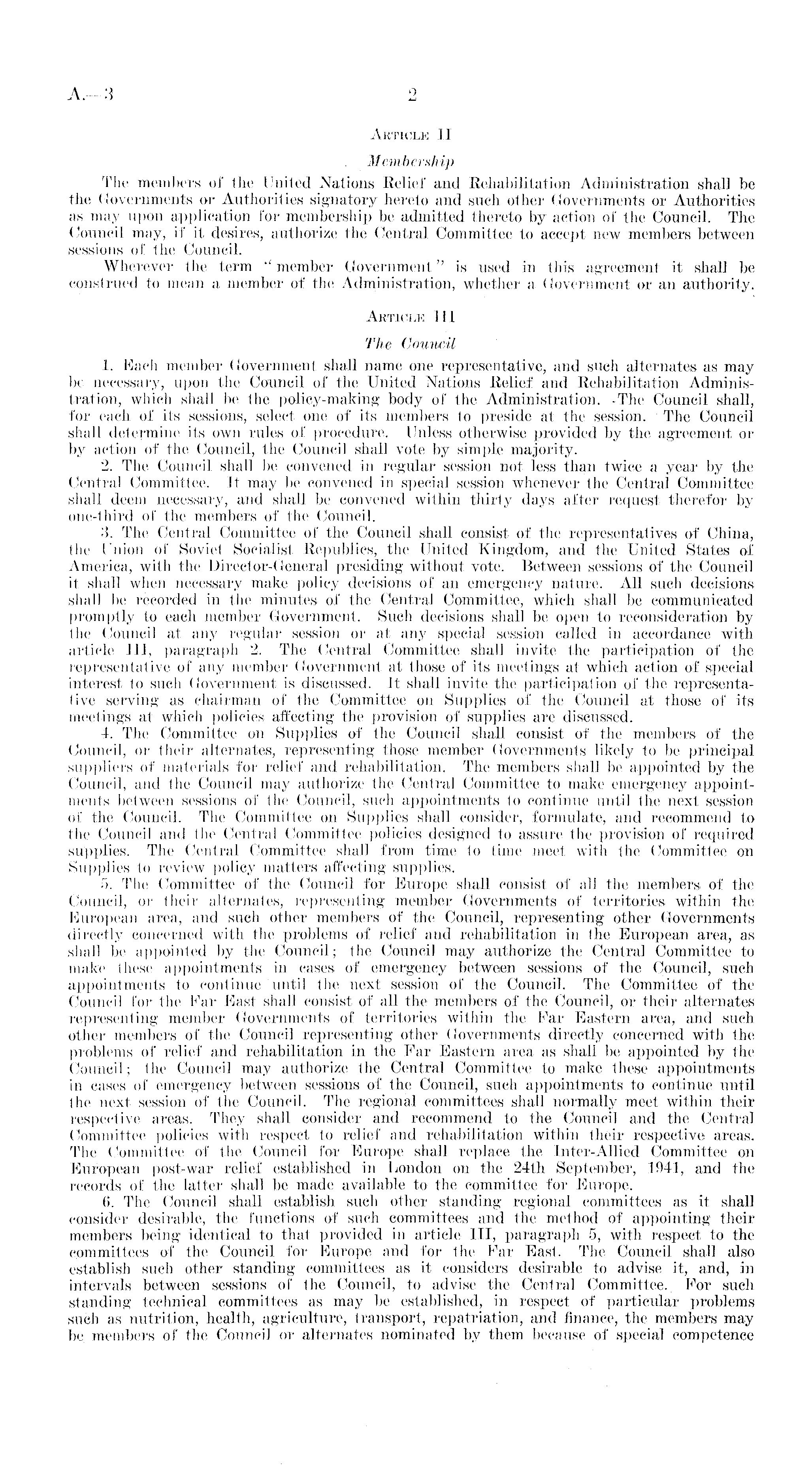 Article II Membership The members of the United Nations Relief and Rehabilitation Administration shall be the Governments or Authorities signatory hereto and such other Governments or Authorities as may upon application for membership be admitted thereto by action of the Council. The Council may, if it desires, authorize the Central Committee to accept new members between sessions of the Council. Wherever the term " member Government" is used in this agreement it shall be construed to mean a member of the Administration, whether a Government or an authority. Article 111 The Council 1. Each member Government shall name one representative, and such alternates as may be necessary, upon the Council of the United Nations Relief and Rehabilitation Administration, which shall be the policy-making body of the Administration. .The Council shall, for each of its sessions, select one of its members to preside at the session. The Council shall determine its own rules of procedure. Unless otherwise provided by the agreement or by action of the Council, the Council shall vote by simple majority. 2. The Council shall be convened in regular session not less than twice a year by the Central Committee. It may be convened in special session whenever the Central Committee shall deem necessary, and shall be convened within thirty days after request therefor by one-third of the members of the Council. 3. The Central Committee of the Council shall consist of the representatives of China, the Union of Soviet Socialist Republics, the United Kingdom, and the United States of America, with the Director-General presiding without vote. Between sessions of the Council it shall when necessary make policy decisions of an emergency nature. All such decisions shall be recorded in the minutes of the Central Committee, which shall be communicated promptly to each member Government. Such decisions shall be open to reconsideration by the Council at any regular session or at any special session called in accordance with article 111, paragraph 2. The Central Committee shall invite the participation of the representative of any member Government at those of its meetings at which action of special interest to such Government is discussed. It shall invite the participation of the representative serving as chairman of the Committee on Supplies of the Council at those of its meetings at which policies affecting the provision of supplies are discussed. 4. The Committee on Supplies of the Council shall consist of the members of the Council, or their alternates, representing those member Governments likely to bo principal suppliers of materials for relief and rehabilitation. The members shall be appointed by the Council, and the Council may authorize the Central Committee to make emergency appointments between sessions of the Council, such appointments to continue until the next session of the Council. The Committee on Supplies shall consider, formulate, and recommend to the Council and the Central Committee policies designed to assure the provision of required supplies. The Central Committee shall from time to time meet with the Committee on Supplies to review policy matters affecting supplies. 5. The Committee of the Council for Europe shall consist of all the members of the Council, or their alternates, representing member Governments of territories within the European area, and such other members of the Council, representing other Governments directly concerned with the problems of relief and rehabilitation in Ihe European area, as shall be appointed by the Council; the Council may authorize the Central Committee to make these appointments in cases of emergency between sessions of the Council, such appointments to continue until the next session of the Council. The Committee of the Council for the Far East shall consist of all the members of the Council, or their alternates representing member Governments of territories within the Far Eastern area, and such other members of the Council representing other Governments directly concerned with the problems of relief and rehabilitation in the Far Eastern area as shall be appointed by the Council; the Council may authorize the Central Committee to make these appointments in cases of emergency between sessions of the Council, such appointments to continue until the next session of the Council. The regional committees shall normally meet within their respective areas. They shall consider and recommend to the Council and the Central Committee policies with respect to relief and rehabilitation within their respective areas. The Committee of the Council for Europe shall replace the Inter-Allied Committee on European post-war relief established in London on the 24th September, 1941, and the records of the latter shall be made available to the committee for Europe. 6. The Council shall establish such other standing regional committees as it shall consider desirable, the functions of such committees and the method of appointing their members being identical to that provided in article 111, paragraph 5, with respect to the committees of the Council for Europe and for the Far East. The Council shall also establish such other standing committees as it considers desirable to advise it, and, in intervals between sessions of the Council, to advise the Central Committee.. For such standing technical committees as may be established, in respect of particular problems such as nutrition, health, agriculture, transport, repatriation, and finance, the members may be. members of the Council or alternates nominated by them because of special competence