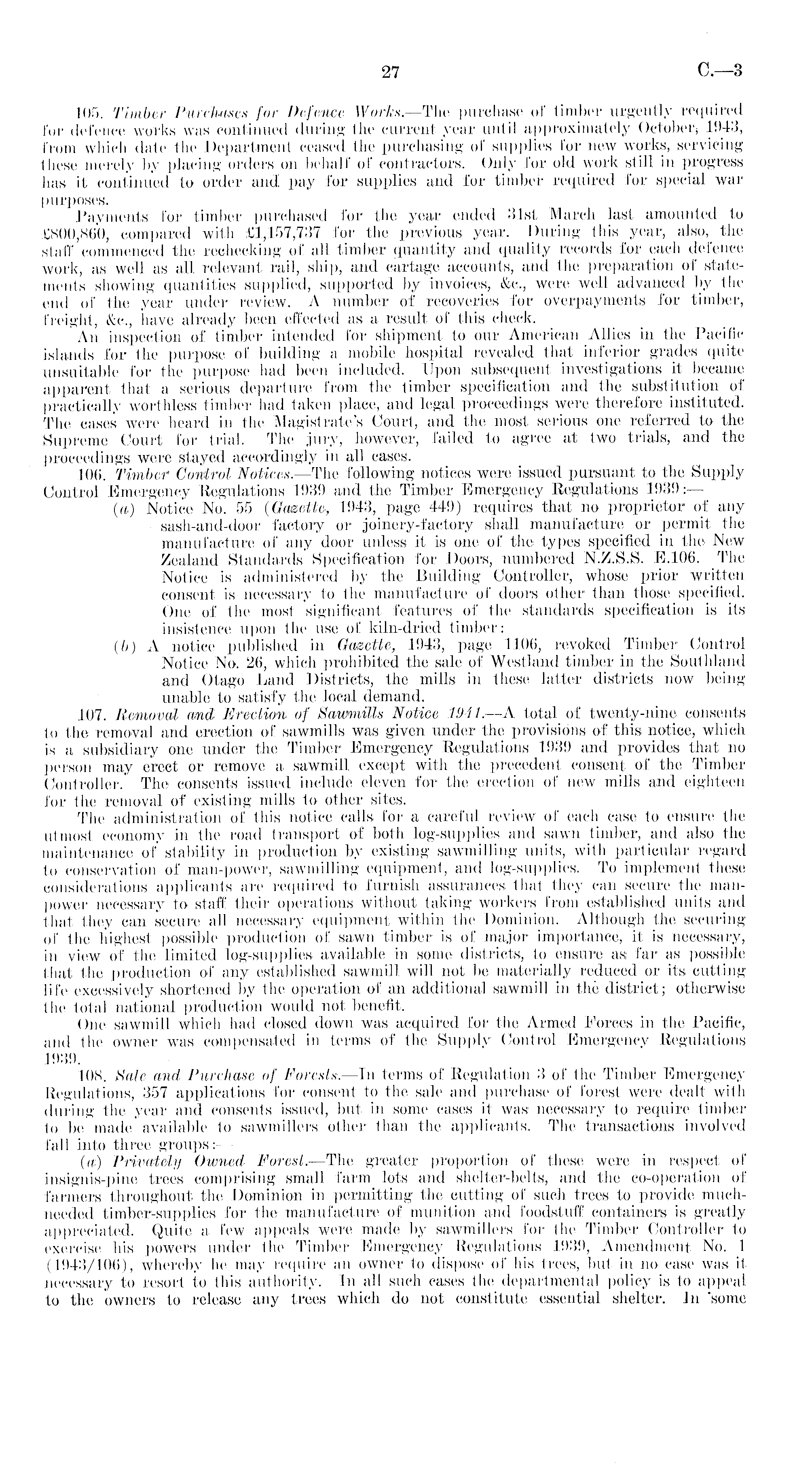 105. Timber Purchases for Defence Works.—-The purchase of timber urgently required for defence works was continued during the current year until approximately October, 1943, from which date the Department ceased the purchasing of supplies for new works, servicing these merely by placing orders on behalf of contractors. Only for old work still in progress has it continued to order and pay for supplies and for timber required for special war purposes. Payments for timber purchased for the year ended 31st March last amounted to £800,860, compared with £1,157,737 for the previous year. During this year, also,_ the staff commenced the rcchccking of all timber quantity and quality records for each defence work, as well as all relevant rail, ship, and cartage accounts, and the preparation of statements showing quantities supplied, supported by invoices, &c., were well advanced by the end of the year under review. A number of recoveries for overpayments for timber, freight, &c„ have already been effected as a result of this check. An inspection of timber intended for shipment to our American Allies in the Pacific islands for the purpose of building a mobile hospital revealed that inferior grades quite unsuitable for the purpose had been included. Upon subsequent investigations it became apparent that a serious departure from the timber specification and the substitution of practically worthless timber had taken place, and legal proceedings were therefore instituted. The cases were heard in the Magistrate's Court, and the most serious one referred to the Supreme Court for trial. The jury, however, failed to agree at two trials, and the proceedings were stayed accordingly in all cases, 106. Timber Control Notices. —The following notices were issued pursuant to the Supply Control Emergency Regulations 1939 and the Timber Emergency Regulations 1939 :— (a) Notice No. 55 (Gazette, 1943, page 449) requires that no proprietor of any sash-and-door factory or joinery-factory shall manufacture or permit the manufacture of a,ny door unless it is one of the types specified in the New Zealand Standards Specification for Doors, numbered N.Z.S.S. E. 106. The Notice is administered by the Building Controller, whose prior written consent is necessary to the manufacture of doors other than those specified. One of the most significant features of the standards specification is its insistence upon the use of kiln-dried timber: (b) A notice published in Gazette, 1943, page 1106, revoked Timber Control Notice No. 26, which prohibited the sale of West-land timber in the Southland and Otago Land Districts, the mills in these latter districts now being unable to satisfy the local demand. 107. Removal and Erection of Sawmills Notice 1941. —A total of twenty-nine- consents to the removal and erection of sawmills was given under the provisions of this notice, which is a subsidiary one under the Timber Emergency Regulations 1939 and provides that no person may erect or remove a sawmill except with the precedent consent of the Timber Controller. The consents issued include eleven for the erection of new mills and eighteen for the removal of existing mills to other sites. The administration of this notice calls for a careful review of each case to ensure the utmost economy in the road transport of both log-supplies and sawn timber, and also the maintenance of stability in production by existing sawmilling units, with particular regard to conservation of man-power, sawmilling equipment, and log-supplies. To implement these considerations applicants are required to furnish assurances that they can secure the manpower necessary to staff their operations without taking workers from established units and that they can secure all necessary equipment within the Dominion. Although the securing of the highest possible production of sawn timber is of major importance, it is necessary, in view of the limited log-supplies available in some districts, to ensure as; far as possible that the production of any established sawmill will not be materially reduced or its cutting life excessively shortened by the operation of an additional sawmill in the district; otherwise the total national production would not benefit. One sawmill which had closed down was acquired for the Armed Forces in the Pacific, and the owner was compensated in terms of the Supply Control Emergency Regulations 1939. 108. Sale and Purchase of Forests. —In terms of Regulation 3 of the Timber Emergency Regulations, 357 applications for consent to the sale and purchase of forest were dealt with during the year and consents issued, but in some cases it was necessary to require timber to be made available to sawmillers other than the applicants. The transactions involved fall into three groups:— («) Privately Owned Forest. —The greater proportion of these were in respect of insignis-pine trees comprising small farm lots and shelter-belts, and the co-operation of farmers throughout the Dominion in permitting the cutting of such trees to provide muchneeded timber-supplies for the manufacture of munition and foodstuff containers is greatly appreciated. Quite a few appeals were made by sawmillers for the Timber Controller to exercise his powers under the Timber Emergency Regulations 1939, Amendment- No. 1 (1943/106), whereby lie may require an owner to dispose of his trees, but in no case was it necessary to resort to this authority. In all such cases the departmental policy is to appeal to the owners to release any trees which do not constitute essential shelter. In "some