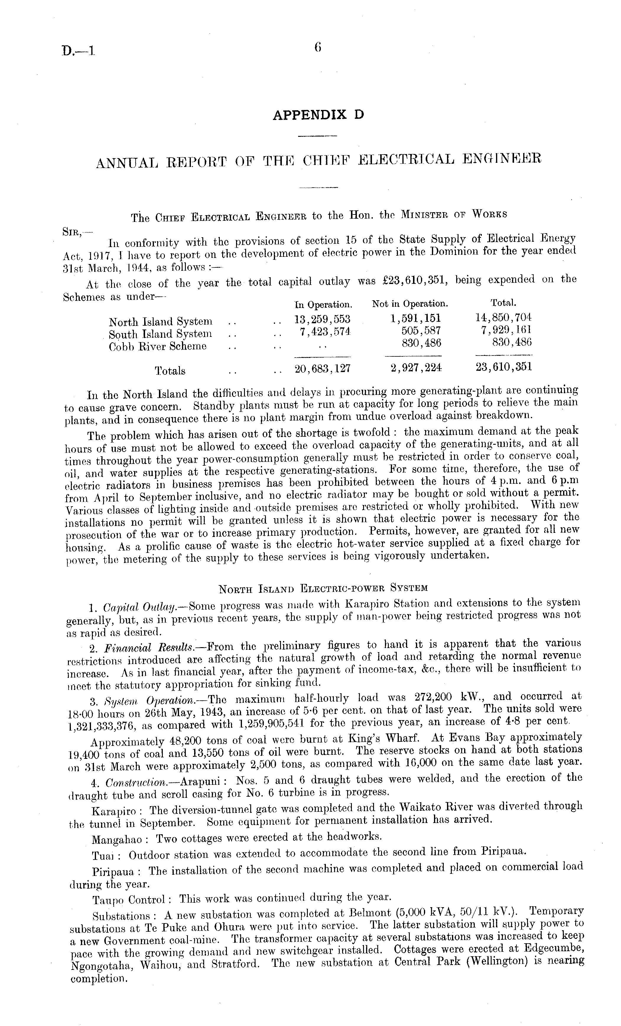 APPENDIX D ANNUAL REPORT OF THE CHIEF ELECTRICAL ENGINEER The Chief Electrical Engineer to the Hon. the Minister of Works In conformity with the provisions of section 15 of the State Supply of Electrical Energy Act, 1917. I have to report on the development of electric power in the Dominion for the year ended 31st March, 1944, as follows At the close of the year the total capital outlay was £23,610,351, being expended on the Schemes as under — . In Operation. Not in Operation. total. North Island System .. 13,259,553 1,591,151 11,850,704 South Island System .. .. 7,423,574 505,587 7,929,161 Cobb River Scheme .. • ■ • • 830, 486 830, 486 Totals •• 20,683,127 2,927,224 23,610,351 In the North Island the difficulties and delays in procuring more generating-plant are continuing to cause grave concern. Standby plants must be run at capacity for long periods to relieve the main plants, and in consequence there is no plant margin from undue overload against breakdown. The problem which has arisen out of the shortage is twofold : the maximum demand at the peak hours of use must not be allowed to exceed the overload capacity of the generating-units, and at all times throughout the year power-consumption generally must be restricted in order to conserve coal, oil, and water supplies at the respective generating-stations. For some time, therefore, the use of electric radiators in business premises has been prohibited between the hours of 4 p.m. and 6 p.m from April to September inclusive, and no electric radiator may be bought or sold without a permit. Various classes of lighting inside and outside premises are restricted or wholly prohibited. With new installations no permit will be granted unless it is shown that electric power is necessary for the prosecution of the war or to increase primary production. Permits, however, are granted for all new housing. As a prolific cause of waste is the electric hot-water service supplied at a fixed charge for power, the metering of the supply to these services is being vigorously undertaken. North Island Electric-power System 1 Capital Outlay.—Some progress was made with lvarapiro Station and extensions to the system generally, but, as in previous recent years, the supply of man-power being restricted progress was not as rapid as desired. 2 Financial From the preliminary figures to hand it is apparent that the various restrictions introduced are affecting the natural growth of load and retarding the normal revenue increase. As in last financial year, after the payment of income-tax, &c., there will be insufficient to meet the statutory appropriation for sinking fund. 3. System Operation.—The maximum half-hourly load was 272,200 k\V., and occurred at 18-00 hours on 26th May, 1943, an increase of 5-6 per cent, on that of last year. The units sold were 1,321,333,376, as compared with 1,259,905,541 for the previous year, an increase of 4-8 per cent. Approximately 48,200 tons of coal were burnt at King's Wharf. At Evans Bay approximately 19,400 tons of coal and 13,550 tons of oil were burnt. The reserve stocks on hand at both stations on' 31st March were approximately 2,500 tons, as compared with 16,000 on the same date last year. 4, Construction. —Arapuni : Nos. 5 and 6 draught tabes were welded, and the erection of the draught tube and scroll casing for No. 6 turbine is in progress. Karapiro : The diversion-tunnel gate was completed and the Waikato River was diverted through the tunnel in September. Some equipment for permanent installation has arrived. Mangahao : Two cottages were erected at the headworks. Tuai : Outdoor station was extended to accommodate the second line from Piripaua. Piripaua : The installation of the second machine was completed and placed on commercial load during the year. Taupo Control: This work was continued during the year. Substations : A new substation was completed at Belmont (5,000 kVA, 50/11 kV.). Temporary substations at Te Puke and Ohura were put into service. The latter substation will supply power to a new Government coal-mine. The transformer capacity at several substations was increased to keep pace with the growing demand and new switchgear installed. Cottages were erected at Edgecumbe, Ngongotaha, Waihou, and Stratford. The new substation at Central Park (Wellington) is neanng completion.