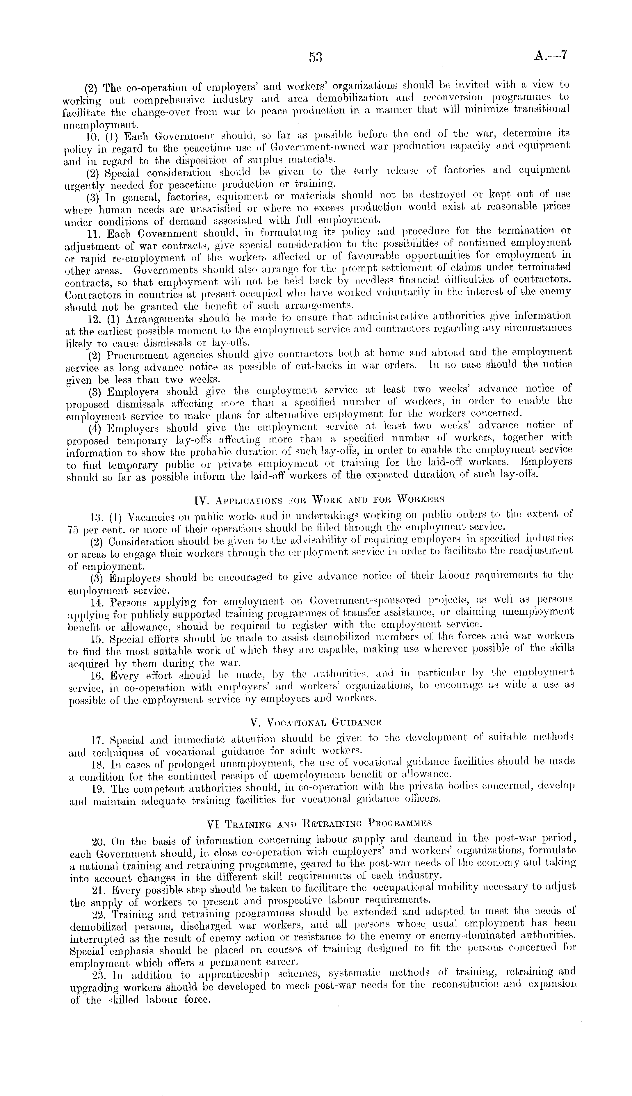 (2) The co-operation of employers' and workers' organizations should be invited with a view ta working out comprehensive industry and area demobilization and programmes to facilitate the change-over from war to peace production in a manner that will minimize transitional unemployment. _ „ , . . 10. (1) Each Government should, so far as possible before the end of the war, determine its policy in regard to the peacetime use of Government-owned war production capacity and equipment and in regard to the disposition of surplus materials. (2) Special consideration should be given to the fearly release ol factories and equipment urgently needed for peacetime production or training. (3) In general, factories, equipment or materials should not be destroyed or kept out of use where human needs are unsatisfied or where no excess production would exist at reasonable prices under conditions of demand associated with full employment. 11. Each Government should, in formulating its policy and procedure for the termination or adjustment of war contracts, give special consideration to the possibilities ol continued employment or rapid re-employment of the workers affected or of favourable opportunities for employment in other areas. Governments should also arrange for the prompt settlement of claims under terminated contracts, so that employment will not be held back by needless financial difficulties of contractors. Contractors in countries at present occupied who have worked voluntarily in the interest of the enemy should not be granted the benefit of such arrangements. 12. (1) Arrangements should be made to ensure that administrative authorities give information at the earliest possible moment to the employment service and contractors regarding any circumstances likely to cause dismissals or lay-offs. (2) Procurement agencies should give contractors both at home and abroad and the employment service as long advance notice as possible of cut-backs in war orders. In no case should the notice given be less than two weeks. „ (3) Employers should give the employment service at least two weeks' advance notice of proposed dismissals affecting more than a specified number of workers, in order to enable the employment service to make plans for alternative employment for the workers concerned. (4) Employers should give the employment service at least two weeks' advance notice of proposed temporary lay-offs affecting more than a specified number of workers, together with information to show the probable duration of such lay-ofts, in order to enable the employment service to find temporary public or private employment or training for the laid-off workers. Employers should so far as possible inform the laid-off workers of the expected duration of such lay-offs. IV. Applications for Work and fob Workers 13. (1) Vacancies on public works and in undertakings working on public orders to the extent of 75 per cent, or more of their operations should be filled through the employmentservice.^ (2) Consideration should be given to the advisability of requiring employers in specified industries or areas to engage their workers through the employment service in order to facilitate the readjustment of employment. (3) Employers should be encouraged to give advance notice of their labour requirements to the employment service. 14. Persons applying for employment on Government-sponsored projects, as well as persons applying for publicly supported training programmes of transfer assistance, or claiming unemployment benefit or allowance, should be required to register with the employment service. 15. Special efforts should be made to assist demobilized members of the forces and war workers to find the most suitable work of which they are capable, making use wherever possible of the skills acquired by them during the war. 16. Every effort should be made, by the authorities, and in particular by the employnient service, in co-operation with employers' and workers organizations, to encourage as wide a use as possible of the employment service by employers and workers. V. Vocational Guidance 17. Special aud immediate attention should be given to the development of suitable methods and techniques of vocational guidance for adult workers. 18. In cases of prolonged unemployment, the use of vocational guidance facilities should be made a condition for the continued receipt of unemployment benefit or allowance. 19. The competent authorities should, in co-operation with the private bodies concerned, develop and maintain adequate training facilities for vocational guidance officers. VI Training and Retraining Programmes 20. On the basis of information concerning labour supply and demand in the post-war period, each Government should, in close co-operation with employers' and workers' organizations, formulate a national training and retraining programme, geared to the post-war needs of the economy and taking into account changes in the different skill requirements of each industry. 21. Every possible step should be taken to facilitate the occupational mobility necessary to adjust the supply of workers to present and prospective labour requirements. 22. Training and retraining programmes should be extended and adapted to meet the needs of demobilized persons, discharged war workers, and all persons whose usual employment has been interrupted as the result of enemy action or resistance to the enemy or enemy-dominated authorities. Special emphasis should be placed on courses of training designed to fit the persons concerned for employment which offers a permanent career. 23. In addition to apprenticeship schemes, systematic methods of training, retraining and upgrading workers should be developed to meet post-war needs for the reconstitution and expansion of the skilled labour force.