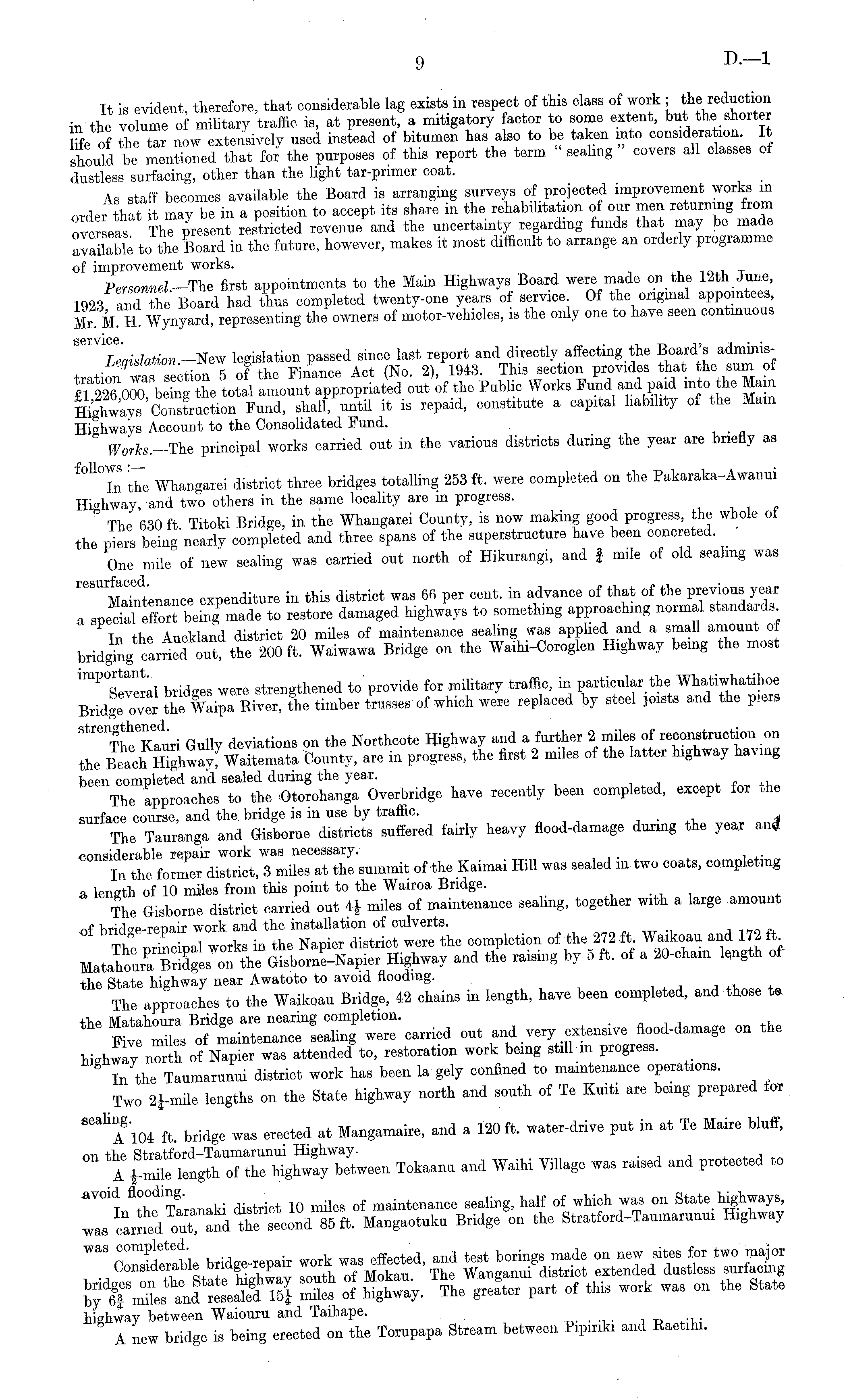 It is evident, therefore, that considerable lag exists in respect of this class of work ; the reduction in the volume of military traffic is, at present, a mitigatory factor to some extent, but the shorter life of the tar now extensivelv used instead of bitumen has also to be taken into consideration. It should be mentioned that for the purposes of this report the term sealing covers all classes of dustless surfacing, other than the light tar-primer coat. 4s staff becomes available the Board is arranging surveys of projected improvement works in order that it may be in a position to accept its share in the rehabilitation of our men returning from overseas. The present restricted revenue and the uncertainty regarding funds that may be made available to the Board in the future, however, makes it most difficult to arrange an orderly programme of improvement works. Personnel. —The first appointments to the Main Highways Board were made on the 12th June 1923 and the Board had thus completed twenty-one years of service Of the original appointees Mr. M. 11. Wynyard, representing the owners of motor-vehicles, is the only one to have seen continuous service. . 1 , . . IT the total amount appropriated out of the Public Works Fund and paid into the Main Highways Construction Fund, shall, until it is repaid, constitute a capital liability of the Main Highways Account to the Consolidated. Fund. _ ~ Works. The principal works carried out in the various districts during the year are briefly as fHll °in the Whangarei district three bridges totalling 253 ft. were completed on the Pakaraka-Awanui Highway, and two others in the same locality are in progress. ° The 630 ft Titoki Bridge, in the Whangarei County, is now making good progress, the whole ol the piers being nearly completed and three spans of the superstructure have been concreted. One mile of new sealing was carried out north of Hikurangi, and | mile of old sealing was rPSIITT}ICP(I • Maintenance expenditure in this district was 66 per cent, in advance of that of the previous year a special effort being made to restore damaged highways to something approaching normal standards. Tn the Auckland district 20 miles of maintenance sealing was applied and a small amount o bridging carried out, the 200 ft. Waiwawa Bridge on the Waihi-Coroglen Highway being the most miportent Btrengthened to provide for military traffic, in particular the Whatiwhatihoe Bridge over the Waipa River, the timber trusses of which were replaced by steel joists and the piers Btrl!, TheKauri Gully deviations on the Northcote Highway and a further 2 miles of reconstruction on the Beach Highway, Waitemata County, are in progress, the first 2 miles of the latter highway having been completed and sealed during the year. The approaches to the Otorohanga Overbridge have recently been completed, except for the surface course, and the bridge is in use by traffic. 7 j The Tauranga and Gisborne districts suffered fairly heavy flood-damage during the year and considerable repair work was necessary. In the former district, 3 miles at the summit of the Kaimai Hill was sealed in two coats, completing a length of 10 miles from this point to the Wairoa Bridge. The Gisborne district carried out miles of maintenance sealing, together with a large amount of brid»e-repair work and the installation of culverts. The principal works in the Napier district were the completion of the 272 ft Waikoau and 172 ft. Matahoura Bridges on the Gisborne-Napier Highway and the raising by o ft. of a 20-cham length o the State highway near Awatoto to avoid flooding. The approaches to the Waikoau Bridge, 42 chains in length, have been completed, and those to the Matahoura Bridge are nearing completion. a n n , Five miles of maintenance sealing were carried out and very extensive flood-damage on the highway north of Napier was attended to, restoration work being still in progress. " In the Taumarunui district work has been la gely confined to maintenance operations. Two 2J-mile lengths on the State highway north and south of Te Kuiti are being prepare or Beall AlO4 ft. bridge was erected at Mangamaire, and a 120 ft. water-drive put in at Te Maire bluff, on the Stratford-Taumarunui Highway. A I-mile length of the highway between Tokaanu and Waihi Village was raised and protected to avoid mileg of maintenancc sealing, half of which was on State highways, was carrJS out and the second 85 ft. Mangaotuku Bridge on the Stratford-Taumarunui Highway ™ S S3EL bridge-repair was «jd Sfiri'trM 32 S "gW. Ui. P«. of this work ™ « the highway between Waiouru and Taihape. n t> A new bridge is being erected on the Torupapa Stream between Pipinki and Raetihi.
