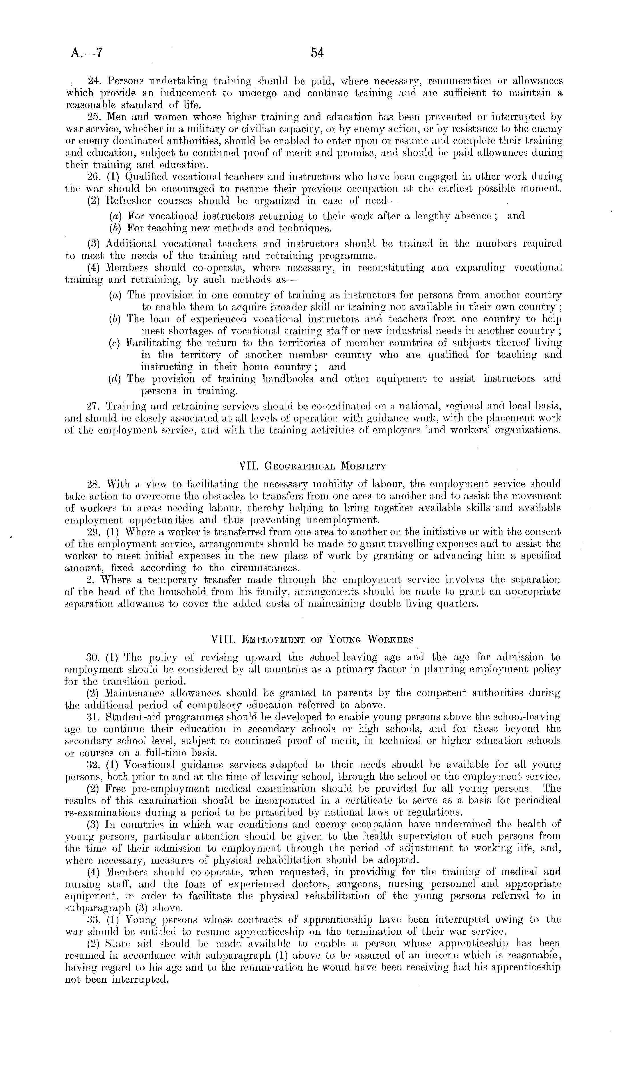 24. Persons undertaking training should be paid, where necessary, remuneration or allowances which provide an inducement to undergo and continue training and are sufficient to maintain a reasonable standard of life. 25. Men and women whose higher training and education has been prevented or interrupted by war service, whether in a military or civilian capacity, or by enemy action, or by resistance to the enemy or enemy dominated authorities, should be enabled to enter upon or resume and complete their training and education, subject to continued proof of merit and promise, and should be paid allowances during their training and education. 26. (1) Qualified vocational teachers and instructors who have been engaged in other work during the war should be encouraged to resume their previous occupation at the earliest possible moment. (2) Refresher courses should be organized in case of need— (а) For vocational instructors returning to their work after a lengthy absence ; and (б) For teaching new methods and techniques. (3) Additional vocational teachers and instructors should be trained in the numbers required to meet the needs of the training and retraining programme. (4) Members should co-operate, where necessary, in reconstituting and expanding vocational training and retraining, by such methods as — (a) The provision in one country of training as instructors for persons from another country to enable them to acquire broader skill or training not available in their own country ; (b) The loan of experienced vocational instructors and teachers from one country to help meet shortages of vocational training staff or new industrial needs in another country ; (c) Facilitating the return to the territories of member countries of subjects thereof living in the territory of another member country who are qualified for teaching and instructing in their home country; and (d) The provision of training handbooks and other equipment to assist instructors and persons in training. 27. Training and retraining services should be co-ordinated on a national, regional and local basis, and should be closely associated at all levels of operation with guidance work, with the placement work of the employment service, and with the training activities of employers 'and workers' organizations. VII. Geographical Mobility 28. With a view to facilitating the necessary mobility of labour, the employment service should take action to overcome the obstacles to transfers from one area to another and to assist the movement of workers to areas needing labour, thereby helping to bring together available skills and available employment opportunities and thus preventing unemployment. 29. (1) Where a worker is transferred from one area to another on the initiative or with the consent of the employment service, arrangements should be made to grant travelling expenses and to assist the worker to meet initial expenses in the new place of work by granting or advancing him a specified amount, fixed according to the circumstances. 2. Where a temporary transfer made through the employment service involves the separation of the head of the household from his family, arrangements should be made to grant an appropriate separation allowance to cover the added costs of maintaining double living quarters. VIII. Employment op Young Workers 30. (1) The policy of revising upward the school-leaving age and the age for admission to employment should be considered by all. countries as a primary factor in planning employment policy for the transition period. (2) Maintenance allowances should be granted to parents by the competent authorities during the additional period of compulsory education referred to above. 31. Student-aid programmes should be developed to enable young persons above the school-leaving age to continue their education in secondary schools or high schools, and for those beyond the secondary school level, subject to continued proof of merit, in technical or higher education schools or courses on a full-time basis. 32. (1) Vocational guidance services adapted to their needs should be available for all young persons, both prior to and at the time of leaving school, through the school or the employment service. (2) Free pre-employment medical examination should be provided for all young persons. The results of this examination should be incorporated in a certificate to serve as a basis for periodical re-examinations during a period to be prescribed by national laws or regulations. (3) In countries in which war conditions and enemy occupation have undermined the health of young persons, particular attention should be given to the health supervision of such persons from the time of their admission to employment through the period of adjustment to working life, and, where necessary, measures of physical rehabilitation should be adopted. (4) Members should co-operate, when requested, in providing for the training of medical and nursing staff, and the loan of experienced doctors, surgeons, nursing personnel and appropriate equipment, in order to facilitate the physical rehabilitation of the young persons referred to in subparagraph (3) above. 33. (1) Young persons whose contracts of apprenticeship have been interrupted owing to the war should be entitled to resume apprenticeship on the termination of their war service. (2) State aid should be made available to enable a person whose apprenticeship has been resumed in accordance with subparagraph (1) above to be assured of an income which is reasonable, having regard to his age and to the remuneration he would have been receiving had his apprenticeship not been interrupted.