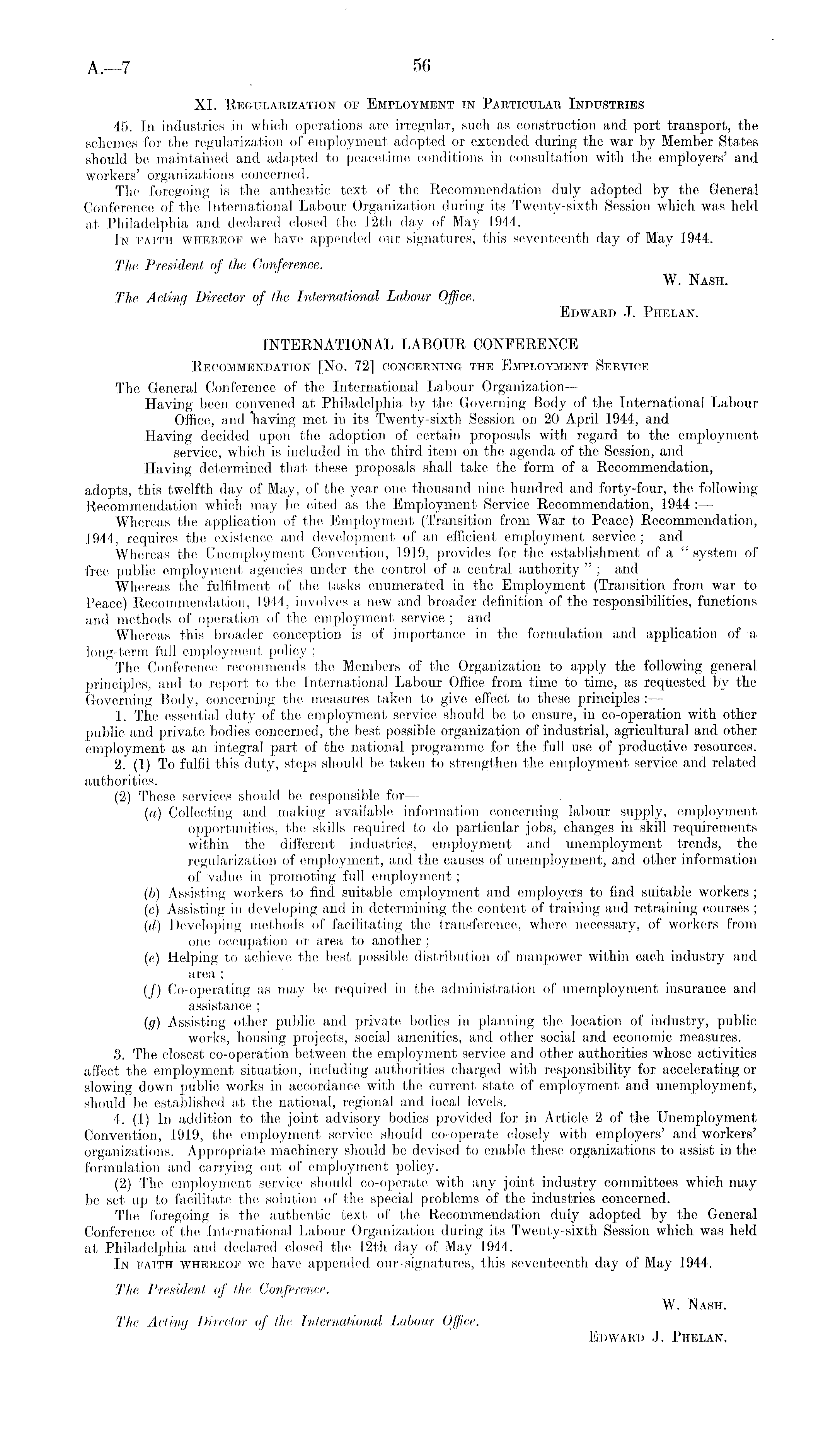 XI. Regularization of Employment in Particular Industries 45. In industries in which operations are irregular, such as construction and port transport, the schemes for the regularization of employment adopted or extended during the war by Member States should be maintained and adapted to peacetime conditions in consultation with the employers' and workers' organizations concerned. The foregoing is the authentic text of the Recommendation duly adopted by the General Conference of the International Labour Organization during its Twenty-sixth Session which was held at Philadelphia and declared closed the 12th day of May 1944. In faith: whereof we have appended our signatures, this seventeenth day of May 1944. The President of the Conference. W. Nash. The Acting Director of the International Labour Office. Edward J. Phelan. INTERNATIONAL LABOUR CONFERENCE Recommendation [No. 72] concerning the Employment Service The General Conference of the International Labour Organization — Having been convened at Philadelphia by the Governing Body of the International Labour Office, and "having met in its Twenty-sixth Session on 20 April 1944, and Having decided upon the adoption of certain proposals with regard to the employment service, which is included in the third item on the agenda of the Session, and Having determined that these proposals shall take the form of a Recommendation, adopts, this twelfth day of May, of the year one thousand nine hundred and forty-four, the following Recommendation which may be cited as the Employment Service Recommendation, 1944 : — Whereas the application of the Employment (Transition from War to Peace) Recommendation, 1944, requires the existence and development of an efficient employment service; and Whereas the Unemployment Convention, 1919, provides for the establishment of a " system of free public employment agencies under the control of a central authority " ; and Whereas the fulfilment of the tasks enumerated in the Employment (Transition from war to Peace) Recommendation, 1944, involves a new and broader definition of the responsibilities, functions and methods of operation of the employment service; and Whereas this broader conception is of importance in the formulation and application of a long-term full employment policy ; The Conference recommends the Members of the Organization to apply the following general principles, and to report to the International Labour Office from time to time, as requested by 'the Governing Body, concerning the measures taken to give effect to these principles : — 1. The essential duty of the employment service should be to ensure, in co-operation with other public and private bodies concerned, the best possible organization of industrial, agricultural and other employment as an integral part of the national programme for the full use of productive resources. 2. (1) To fulfil this duty, steps should be taken to strengthen the employment service and related authorities. (2) These services should be responsible for— (a) Collecting and making available information concerning labour supply, employment opportunities, the skills required to do particular jobs, changes in skill requirements within the different industries, employment and unemployment trends, the regularization of employment, and the causes of unemployment, and other information of value in promoting full employment; (b) Assisting workers to find suitable employment and employers to find suitable workers ; (c) Assisting in developing and in determining the content of training and retraining courses ; (d) Developing methods of facilitating the transference, where necessary, of workers from one occupation or area to another ; (e) Helping to achieve the best possible distribution of manpower within each industry and area ; (/) Co-operating as may be required in the administration of unemployment insurance and assistance ; (g) Assisting other public and private bodies in planning the location of industry, public works, housing projects, social amenities, and other social and economic measures. 3. The closest co-operation between the employment service and other authorities whose activities affect the employment situation, including authorities charged with responsibility for accelerating or slowing down public works in accordance with the current state of employment and unemployment, should be established at the national, regional and local levels. 4. (1) In addition to the joint advisory bodies provided for in Article 2 of the Unemployment Convention, 1919, the employment service should co-operate closely with employers' and workers' organizations. Appropriate machinery should be devised to enable these organizations to assist in the formulation and carrying out of employment policy. (2) The employment service should co-operate with any joint industry committees which, may be set up to facilitate the solution of the special problems of the industries concerned. The foregoing is the authentic text of the Recommendation duly adopted by the General Conference of the International Labour Organization during its Twenty-sixth Session which was held at Philadelphia and declared closed the 12th day of May 1944. In faith whereof we have appended our • signatures, this seventeenth day of May 1944. The President of the Conference. W. Nash. The Acting Director of the International Labour Office. Edward J. Phelan.