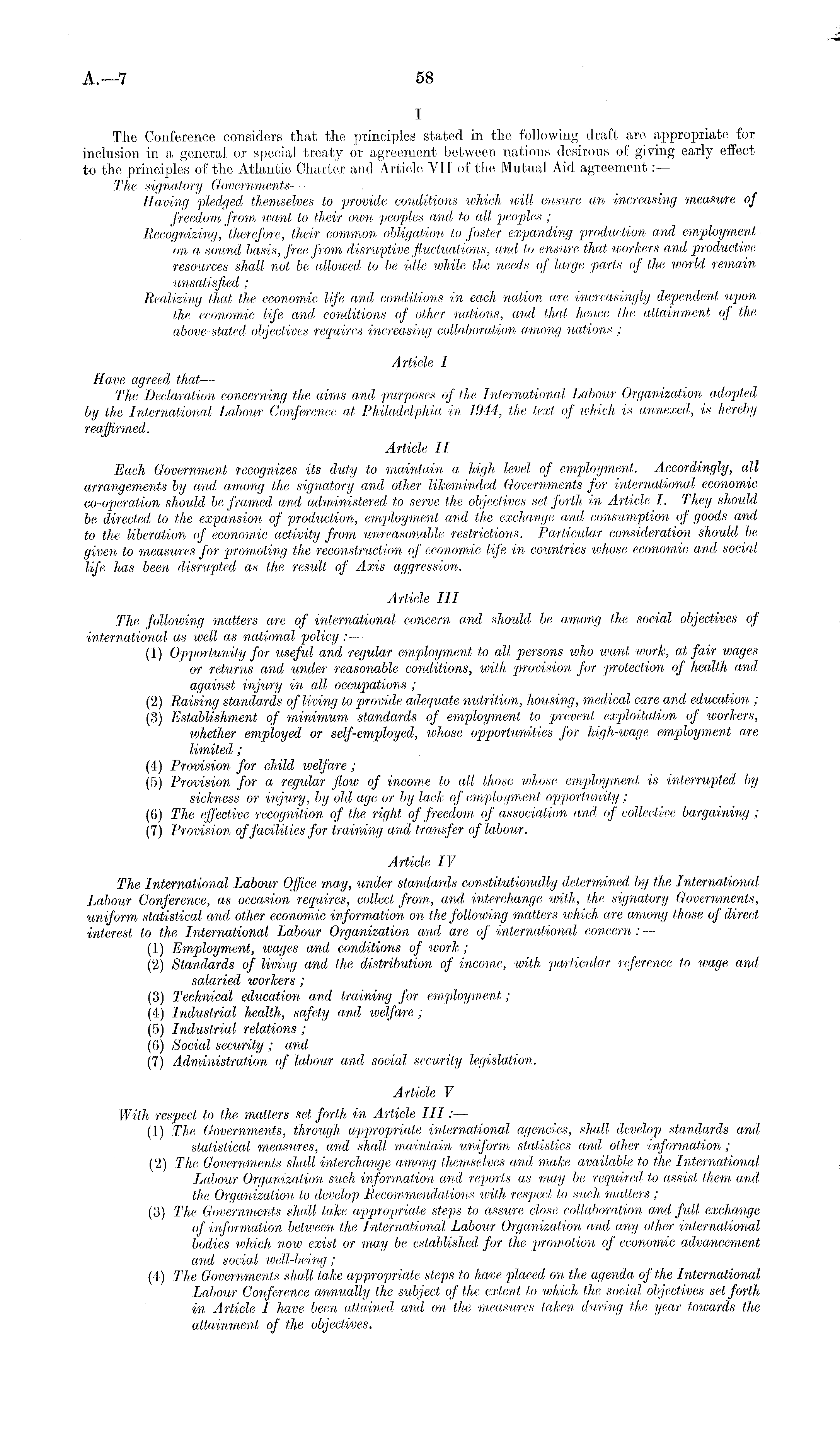 I The Conference considers that the principles stated in the following draft are appropriate for inclusion in a general or special treaty or agreement between nations desirous of giving early effect to the principles of the Atlantic Charter and Article VII of the Mutual Aid agreement: — The signatory Governments — Having fledged themselves to provide conditions which will ensure an increasing measure of freedom from want to their own peoples and to all peoples ; Recognizing, therefore, their common obligation to foster expanding production and employment ■ on a sound basis, free from disruptive fluctuations, and to ensure that workers and productive resources shall not be allowed to be idle while the needs of large parts of the world remain unsatisfied; Realizing that the economic life and conditions in each nation are increasingly dependent upon the economic life and conditions of other nations, and that hence the attainment of the above-stated objectives requires increasing collaboration among nations ; Article I Have agreed that— The Declaration concerning the aims and purposes of the International Labour Organization adopted by the International Labour Conference at Philadelphia in 1944, the text of which is annexed, is hereby reaffirmed. Article II Each Government recognizes its duty to maintain a high level of employment. Accordingly, all arrangements by and among the signatory and other likeminded Governments for international economic co-operation should be framed and administered to serve the objectives set forth in Article I. They should be directed to the expansion of production, employment and the exchange and consumption of goods and to the liberation of economic activity from unreasonable restrictions. Particular consideration should be given to measures for promoting the reconstruction of economic life in countries whose economic and social life has been disrupted as the result of Axis aggression. Article 111 The following matters are of international concern and should be among the social objectives of international as well as national policy : — (1) Opportunity for useful and regular employment to all persons who want work, at fair wages or returns and under reasonable conditions, with provision for protection of health and against injury in all occupations ; (2) Raising standards of living to provide adequate nutrition, housing, medical care and education ; (3) Establishment of minimum standards of employment to prevent exploitation of workers, whether employed or self-employed, whose opportunities for high-wage employment are limited; (4) Provision for child welfare ; (5) Provision for a regular flow of income to all those whose employment is interrupted by sickness or injury, by old age or by lack of employment opportunity; (6) The effective recognition of the right of freedom of association and of collective bargaining ; (7) Provision of facilities for training and transfer of labour. Article IV The International Labour Office may, under standards constitutionally determined by the International Labour Conference, as occasion requires, collect from,, and interchange with, the signatory Governments, uniform statistical and other economic information on the following matters which are among those of direct interest to the International Labour Organization and are of international concern:— (1) Employment, wages and conditions of work; (2) Standards of living and the distribution of income, with particular reference to wage and salaried workers; (3) Technical education and training for employment; (4) Industrial health, safety and welfare; (5) Industrial relations; (6) Social security ; and (7) Administration of labour and social security legislation. Article V With respect to the matters set forth in Article III:—• (!) The Governments, through appropriate international agencies, shall develop standards and statistical measures, and shall maintain uniform statistics and other information; (2) The Governments shall interchange among themselves and make available to the International Labour Organization such information and reports as may be required to assist them and the Organization to develop Recommendations with respect to sucli matters; (3) The Governments shall take appropriate steps to assure close collaboration and full exchange of information between the International Labour Organization and any other international bodies which now exist or may be established for the promotion of economic advancement and social well-being; (4) The Governments shall take appropriate steps to have placed on the agenda of the International Labour Conference annually the subject of the extent to which the social objectives set forth in Article I have been attained arid on the measures taken during the year towards the attainment of the objectives.