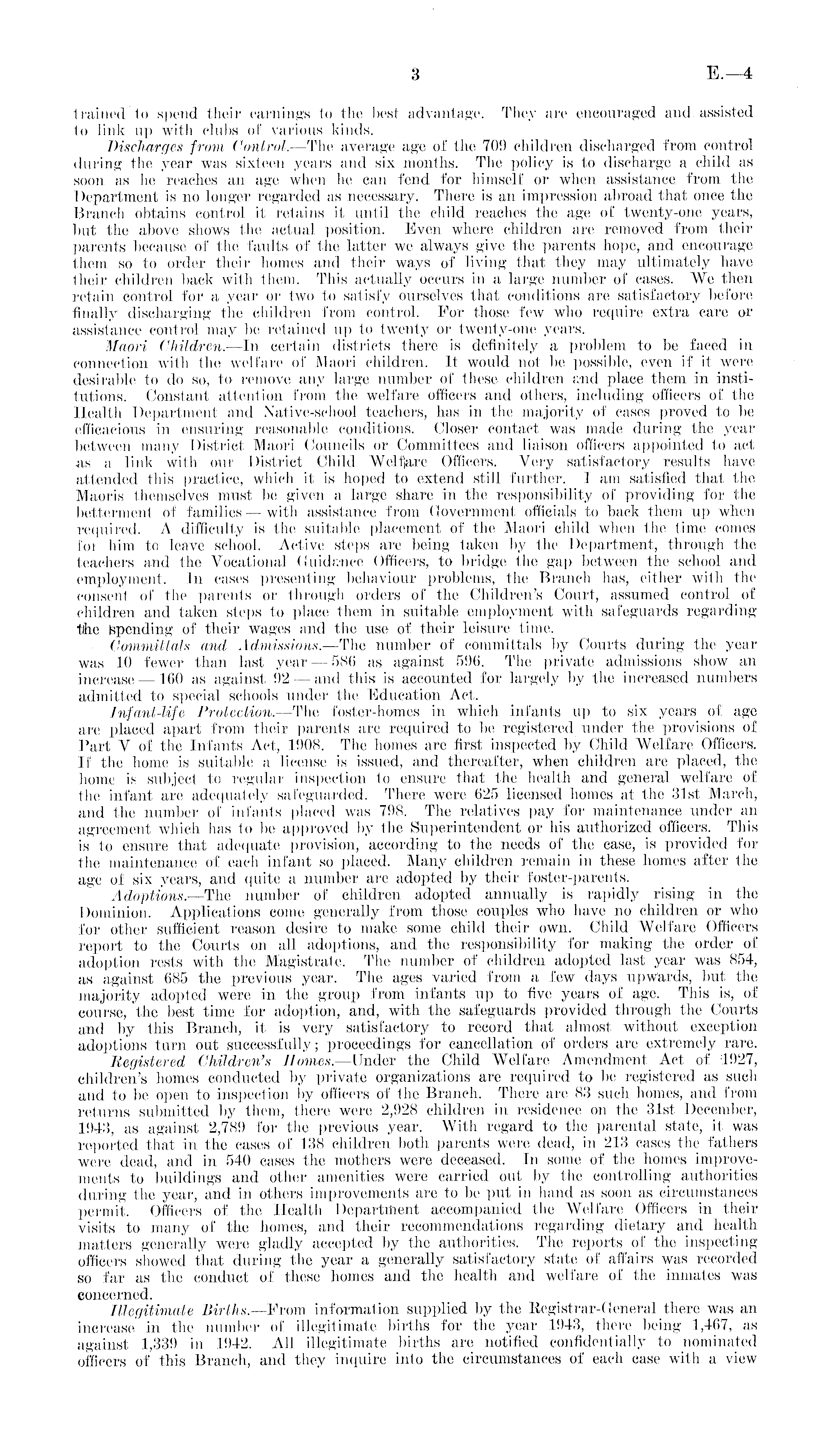 trained to spend their earnings to the best advantage. They are encouraged and. assisted to link up with clubs of various kinds. Discharges from Control.—The average age of the 70!) children discharged from control during the year was sixteen years and six months. The policy is to discharge a child as soon as lie reaches an age when he can fend for himself or when assistance from the Department is no longer regarded as necessary. There is an impression abroad that once the Branch obtains control it retains it until the child reaches the age of twenty-one years, but the above shows the actual position. Even where children are removed from their parents because of the faults of the latter wc always give the parents hope, and encourage them, so to order their homes and their ways of living that they may ultimately have their children back with them. This actually occurs in a large number of cases. We then retain control for a year or two to satisfy ourselves that conditions are satisfactory before finally discharging the children from control. For those few who require extra care or assistance control may be retained up to twenty or twenty-one years. Maori Children. —In certain districts there is definitely a problem to be faced in connection with the welfare of Maori children. It would not be possible, even if it were desirable to do so, to remove any large number of these children and place them in institutions. Constant attention from the welfare officers and others, including officers of the Health Department and Native-school teachers, has in the majority of cases proved to be efficacious in ensuring reasonable conditions. Closer contact was made during the year between many District Maori Councils or Committees and liaison officers appointed to act ■as a link with our District Child "Welfare Officers. Very satisfactory results have attended this practice, which it is hoped to extend still further. I am satisfied that the Maoris themselves must be given a large share in the responsibility of providing for the betterment of families — with assistance from Government officials to back them up when required. A difficulty is the suitable placement of the Maori child when the time comes for him to leave school. Active steps are being taken by the Department, through the teachers and the Vocational Guidance Officers, to bridge the gap between the school and employment. In cases presenting behaviour problems, the Branch has, either with the consent of the parents or through order's of the Children's Court, assumed control of children and taken steps to place them in suitable employment with safeguards regarding tftie Spending of their wages and the use of their leisure time. Committals and Admissions. —The number of committals by Courts during the year was 10 fewer than last year — 586 as against 596. The private admissions show an increase —160 as against 92 — and this is accounted for largely by the increased numbers admitted to special schools under the Education Act. Infant-life Protection. —The foster-homes in which infants up to six years of. age are placed apart from their parents are required to be registered under the provisions of Part V of the Infants Act, 1908. The homes are first inspected by Child Welfare Officers. If the home is suitable a license is issued, and thereafter, when children are placed, the home is subject to regular inspection to ensure that the health and general welfare of the infant are adequately safeguarded. There were 625 licensed homes at the 31st March, and the number of infants placed was 798. The relatives pay for maintenance under an agreement which has to be approved by the Superintendent or his authorized officers. This is to ensure that adequate provision, according to the needs of the case, is provided for the maintenance of each infant so placed. Many children remain in these homes after the age of six years, and quite a number are adopted by their foster-parents. Adoptions.—The number of children adopted annually is rapidly rising in the Dominion. Applications come generally from those couples who have no children or who for other sufficient reason desire to make some child their own. Child Welfare Officers report to the Courts on all adoptions, and the responsibility for making the order of adoption rests with the Magistrate. The number of children adopted last year was 854, as against 685 the previous year. The ages varied from a few days upwards, but the majority adopted were in the group from infants up to five years of age. This is, of course, the best time for adoption, and, with the safeguards provided through the Courts and by this Branch, it is very satisfactory to record that almost without exception adoptions turn out successfully; proceedings for cancellation of orders are extremely rare. Registered Children's Homes.—Under the Child Welfare Amendment Act of : 1927, children's homes conducted by private organizations are required to be registered as such and to be open to inspection by officers of the Branch. There arc 83 such homes, and from returns submitted by them, there were 2,928 children in residence on the 31st December, 1943, as against 2,789 for the previous year. With regard to the parental state, it was reported that in the cases of 138 children both parents were dead, in 213 cases the fathers were dead, and in 540 cases the mothers were deceased. In some of the homes improvements to buildings and other amenities were carried out by the controlling authorities during the year, and in others improvements are to be put in hand as soon as circumstances permit. Officers of the Health Department accompanied the Welfare Officers in their visits to many of the homes, and their recommendations regarding dietary and health matters generally were gladly accepted by the authorities. The reports of the inspecting officers showed that during the year a generally satisfactory state of affairs was recorded so far as t
