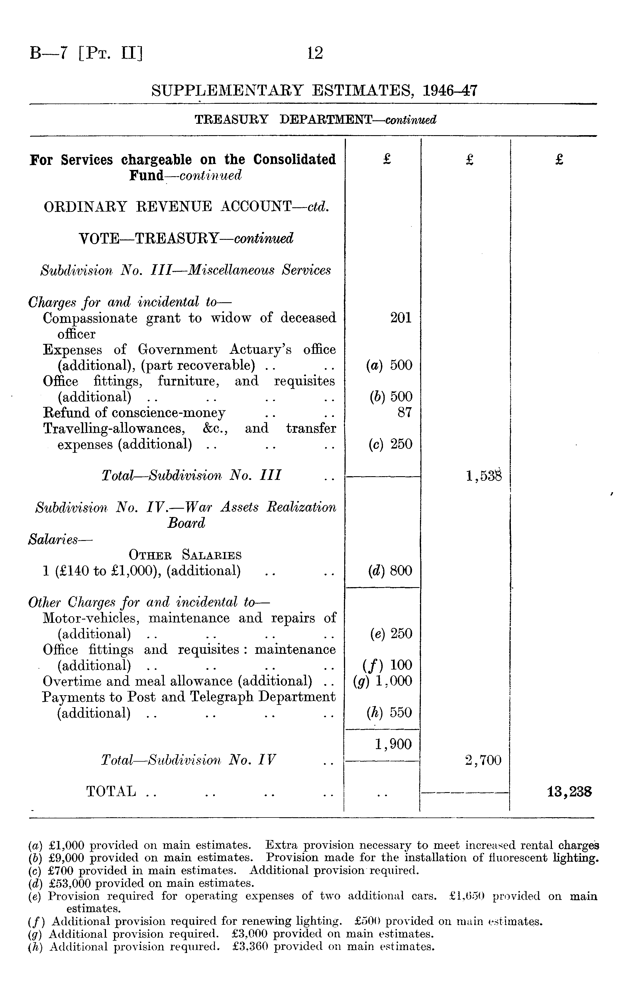For Services chargeable on the Consolidated £ £ £ Fund— continued ORDINARY REVENUE ACCOUNT— ctd. VOTE—TREASURY— continued Subdivision No. Ill — Miscellaneous Services Charges for and incidental to — Compassionate grant to widow of deceased 201 officer Expenses of Government Actuary's office (additional), (part recoverable) (a) 500 Office fittings, furniture, and requisites (additional) (b) 500 Refund of conscience-money 87 Travelling-allowances, &c, and transfer expenses (additional) (c) 250 Total — Subdivision No. Ill Subdivision No. IV. — War Assets Realization 1,538 Board Salaries — Other Salaries 1 (£140 to £1,000), (additional) (d)800 Other Charges for and incidental to — Motor-vehicles, maintenance and repairs of (additional) (e) 250 Office fittings and requisites : maintenance (additional) (/) ioo Overtime and meal allowance (additional) .. (9) 1,000 Payments to Post and Telegraph Department (additional) (h) 550 1,900 Total — Subdivision No. IV TOTAL .. 2,700 13,238