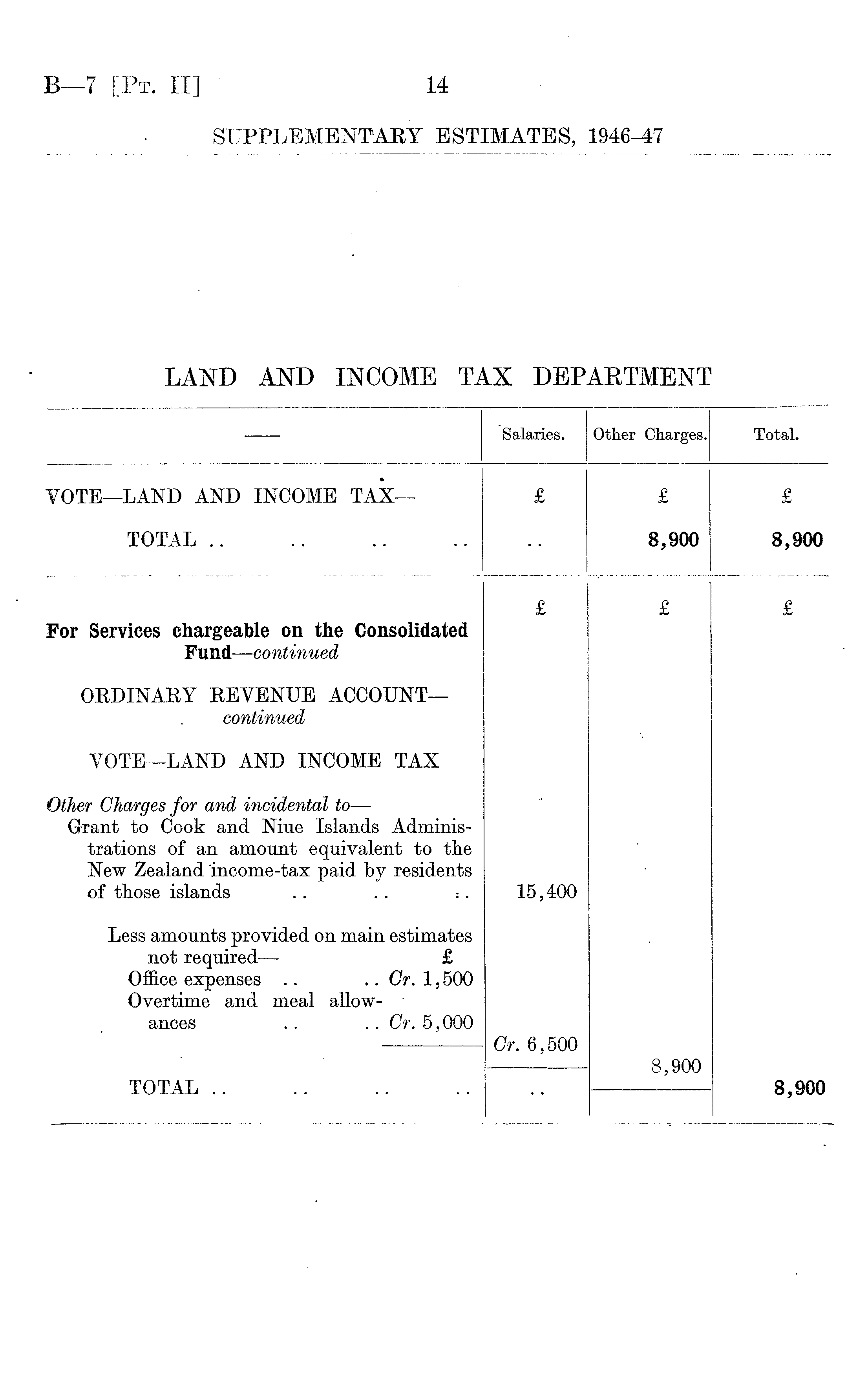 ■— Salaries. Other Charges. Total. VOTE—LAND AND INCOME TAX- £ £ £ TOTAL .. 8,900 8,900 For Services chargeable on the Consolidated Fund — continued £ £ £ ORDINARY REVENUE ACCOUNT— continued VOTE—LAND AND INCOME TAX Other Charges for and incidental to — Grant to Cook and Niue Islands Administrations of an amount equivalent to the New Zealand income-tax paid by residents of those islands . . .. : . 15,400 Less amounts provided on main estimates not required— £ Office expenses .. .. Cr. 1,500 Overtime and meal allowances .. .. Cr. 5,000 Cr. 6,500 8,900 TOTAL 8,900