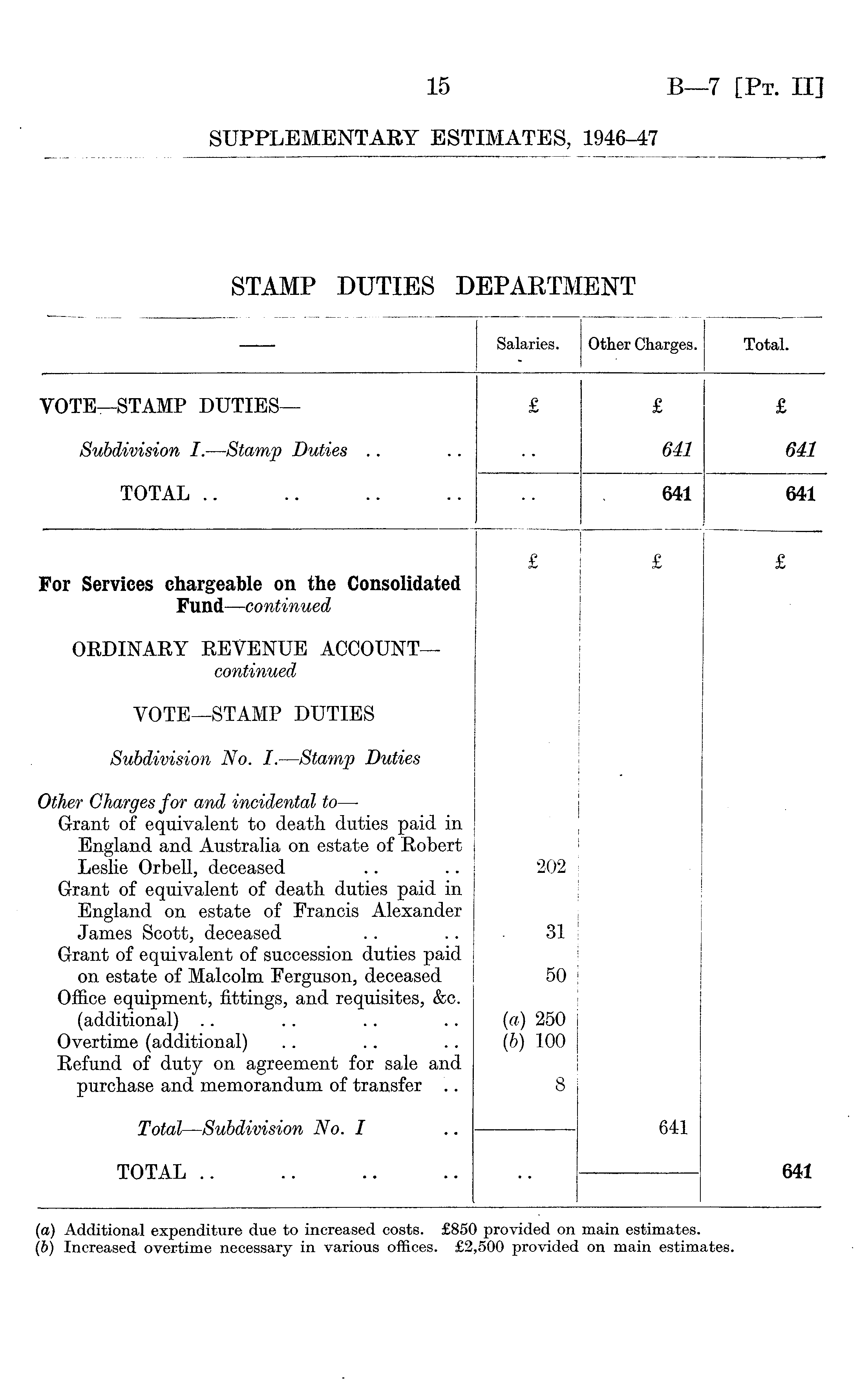 — Salaries. Other Charges. Total. VOTE—STAMP DUTIES— £ £ £ Subdivision I. — Stamp Duties 641 641 TOTAL .. 641 641 £ £ £ For Services chargeable on the Consolidated Fund — continued ORDINARY REVENUE ACCOUNT— continued VOTE—STAMP DUTIES Subdivision No. I. — Stamp Duties . Other Charges for and incidental to —• Grant of equivalent to death duties paid in England and Australia on estate of Robert Leslie Orbell, deceased 202 Grant of equivalent of death duties paid in England on estate of Francis Alexander James Scott, deceased 31 Grant of equivalent of succession duties paid on estate of Malcolm Ferguson, deceased 50 Office equipment, fittings, and requisites, &c. (additional) {a) 250 Overtime (additional) (b) 100 Refund of duty on agreement for sale and purchase and memorandum of transfer .. 8 Total — Subdivision No. I TOTAL 641 V/TCi 641