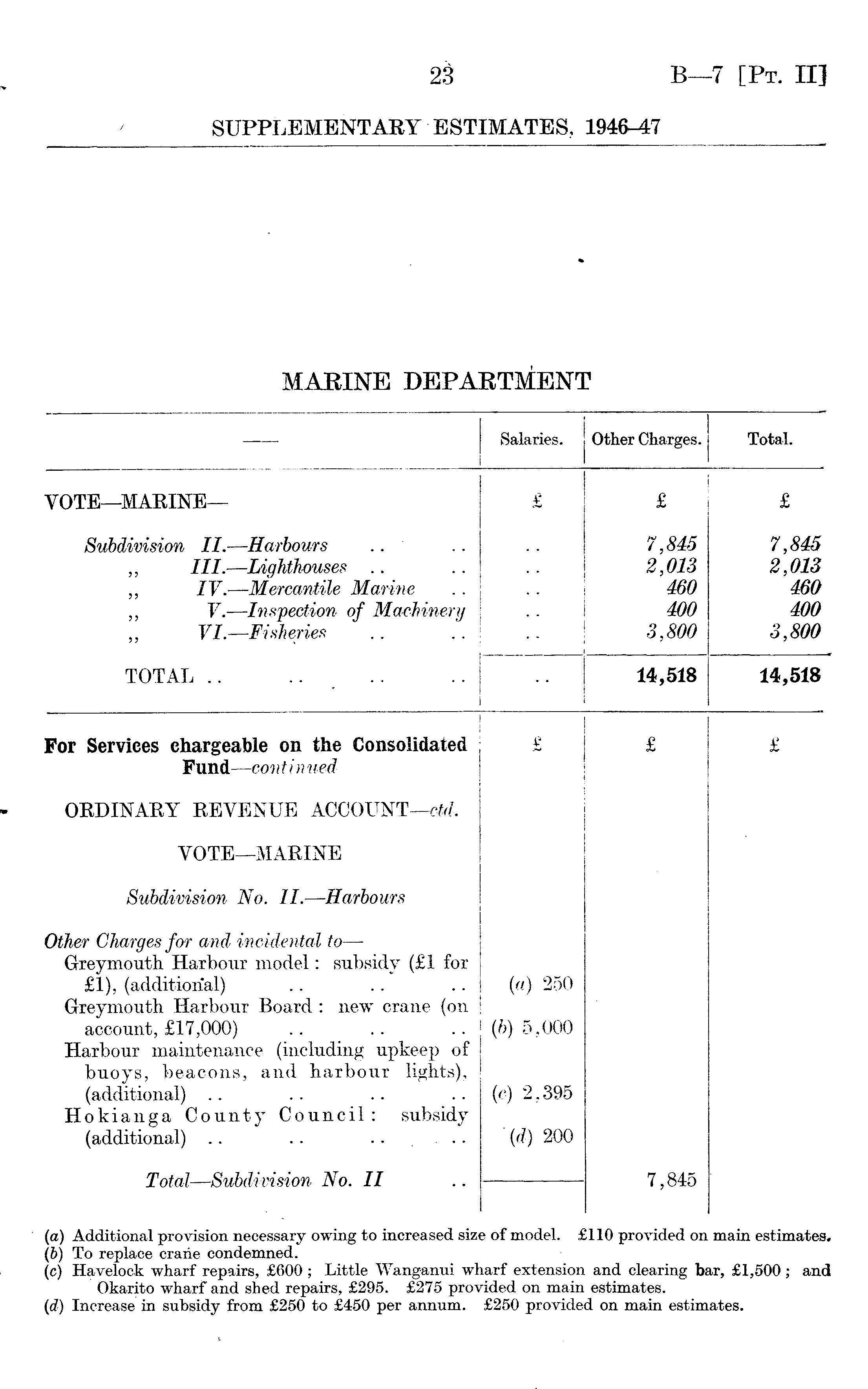 (a) Additional provision necessary owing to increased size of model. £llO provided on main estimates. (b) To replace crane condemned. (c) Havelock wharf repairs, £6OO ; Little Wanganui wharf extension and clearing bar, £1,500; and Okarito wharf and shed repairs, £295. £275 provided on main estimates. (d) Increase in subsidy from £250 to £450 per annum. £250 provided on main estimates.