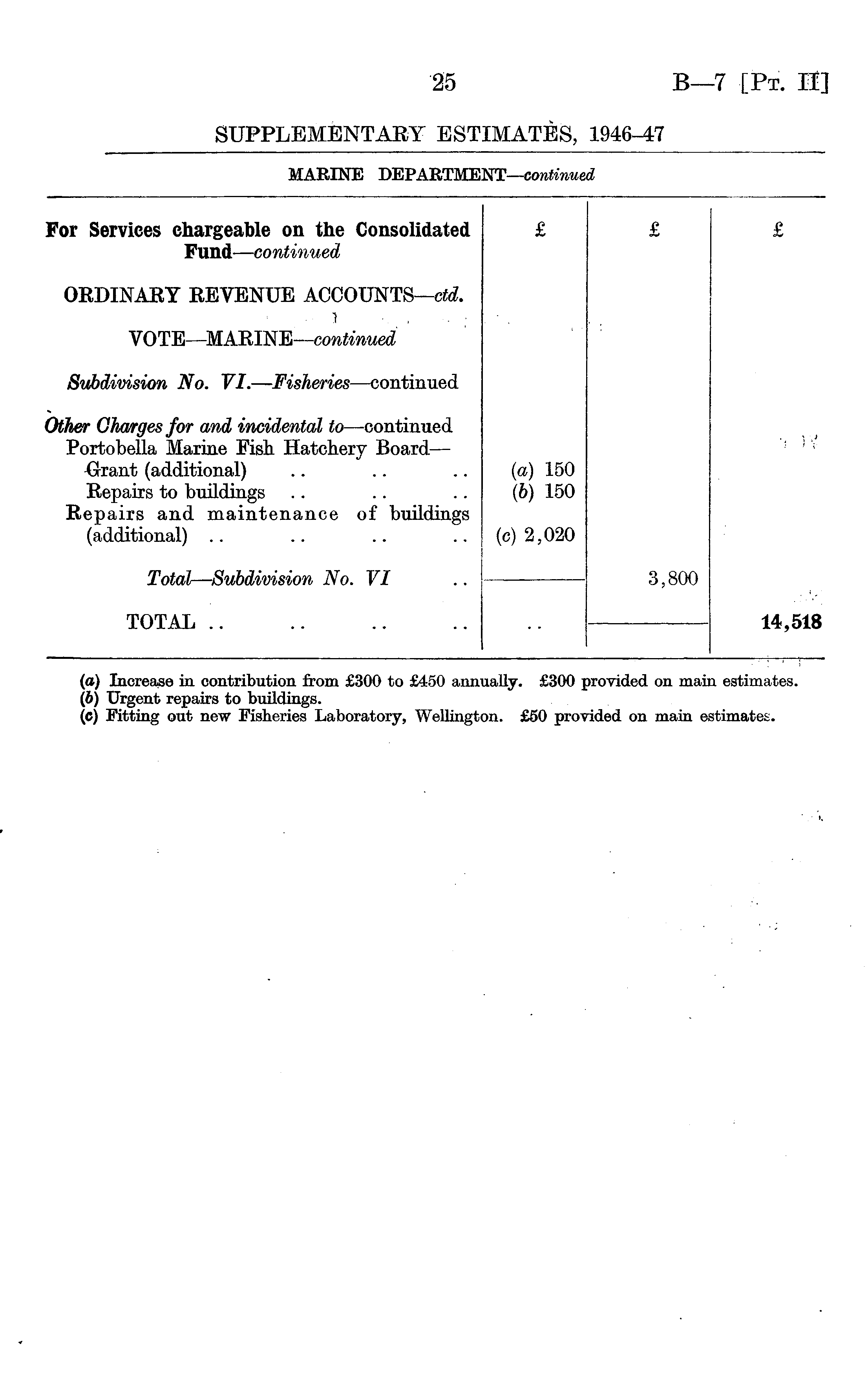 (a) Increase in contribution from £3OO to £450 annually. £3OO provided on main estimates. (b) Urgent repairs to buildings. (c) Fitting out new Fisheries Laboratory, Wellington. £5O provided on main estimates.