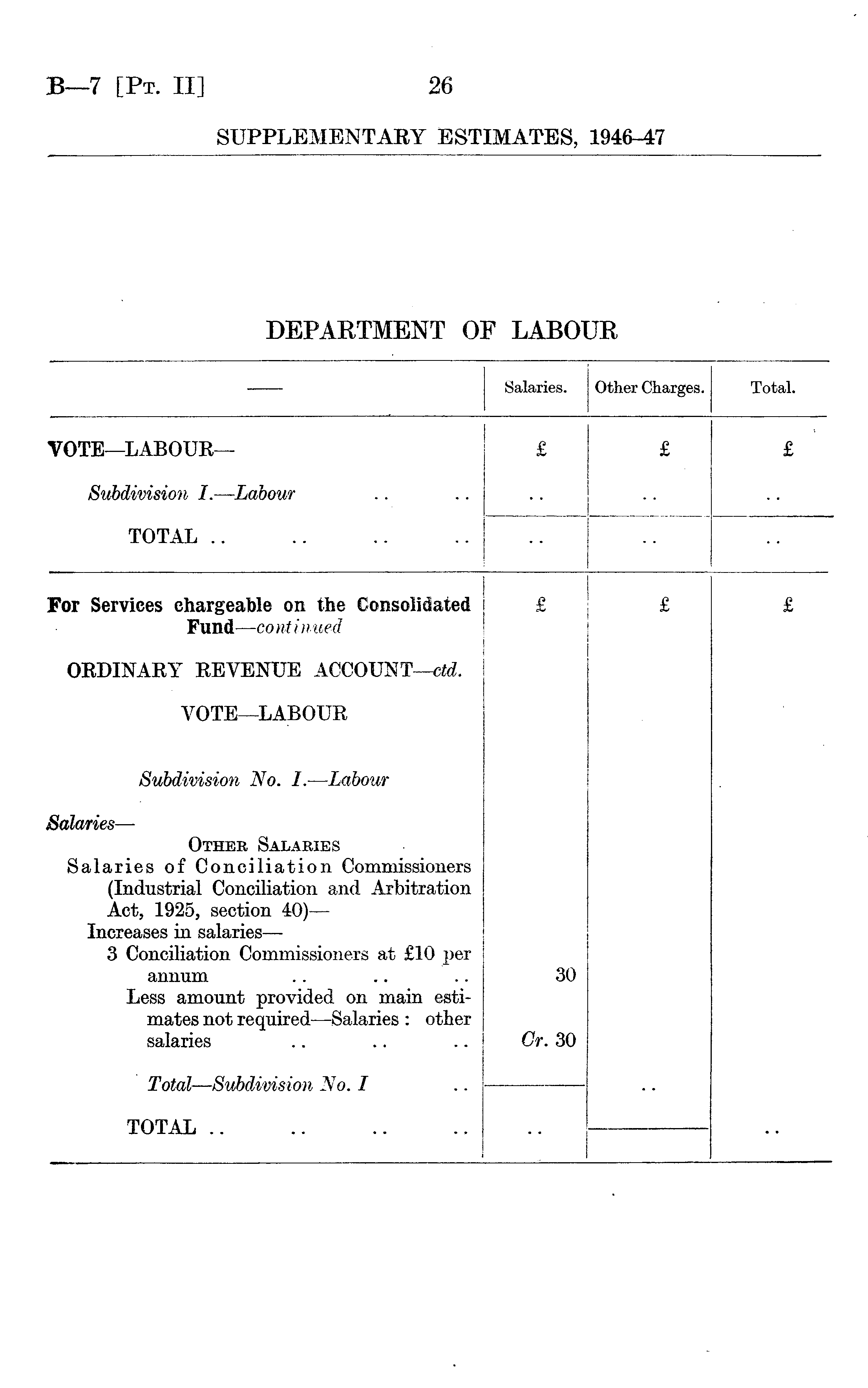— Salaries. Other Charges. Total. VOTE— LABOUR— £ £ £ Subdivision I.—Labour TOTAL .. For Services ehargeable on the Consolidated Fund — continued £ £ £ ORDINARY REVENUE ACCOUNT—<&Z. VOTE—LABOUR Subdivision No. I. — Labour Salaries — Other Salaries Salaries of Conciliation Commissioners (Industrial Conciliation and Arbitration Act, 1925, section 40) — Increases in salaries— 3 Conciliation Commissioners at £10 per annum Less amount provided on main estimates not required —Salaries : other salaries 30 Cr. 30 Total — Subdivision No. I TOTAL