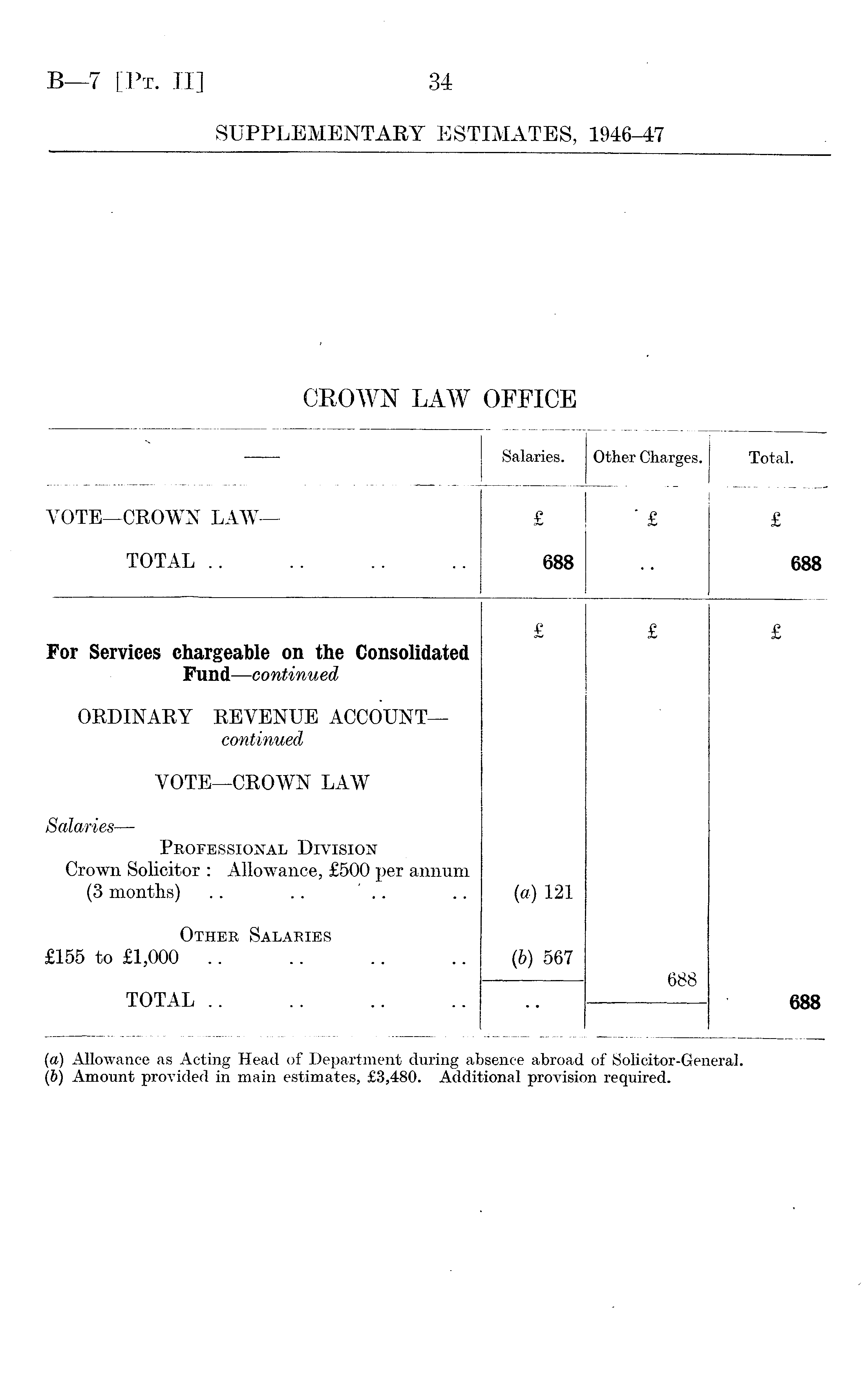 — Salaries. Other Charges. Total. VOTE—CROWN LAW- £ ' £ £ TOTAL .. 688 688 For Services chargeable on the Consolidated Fund — continued £ £ £ ORDINARY REVENUE ACCOUNT— continued VOTE—CROWN LAW Salaries — Professional Division Crown Solicitor : Allowance, £500 per annum (3 months) .. .. (a) 121 Other Salaries £155 to £1,000 (b) 567 688 TOTAL 688