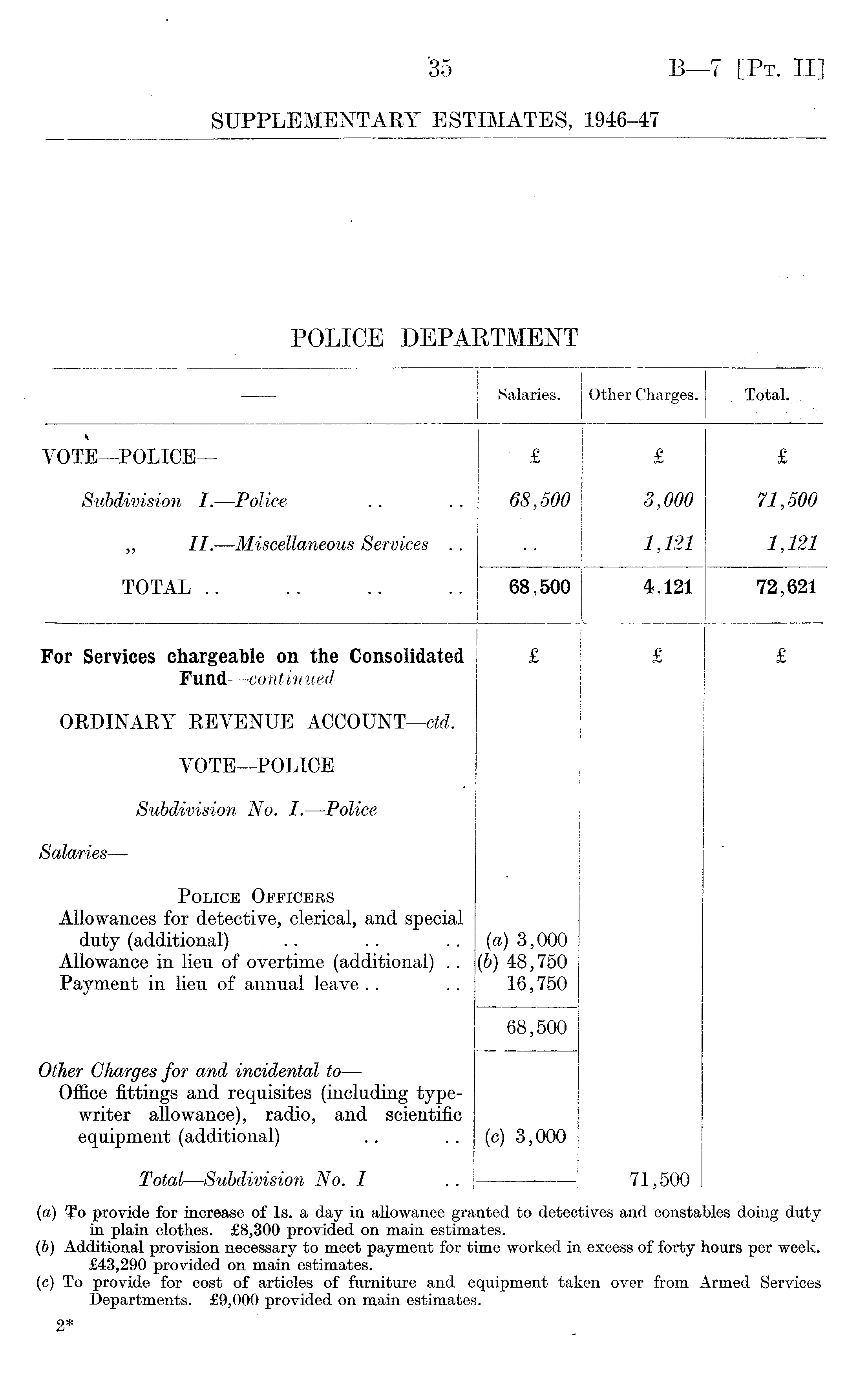 (a) To provide for increase of Is. a day in allowance granted to detectives and constables doing duty in plain clothes. £8,300 provided on main estimates. (6) Additional provision necessary to meet payment for time worked in excess of forty hours per week. £43,290 provided on main estimates, (c) To provide for cost of articles of furniture and equipment taken over from Armed Services Departments. £9,000 provided on main estimates.