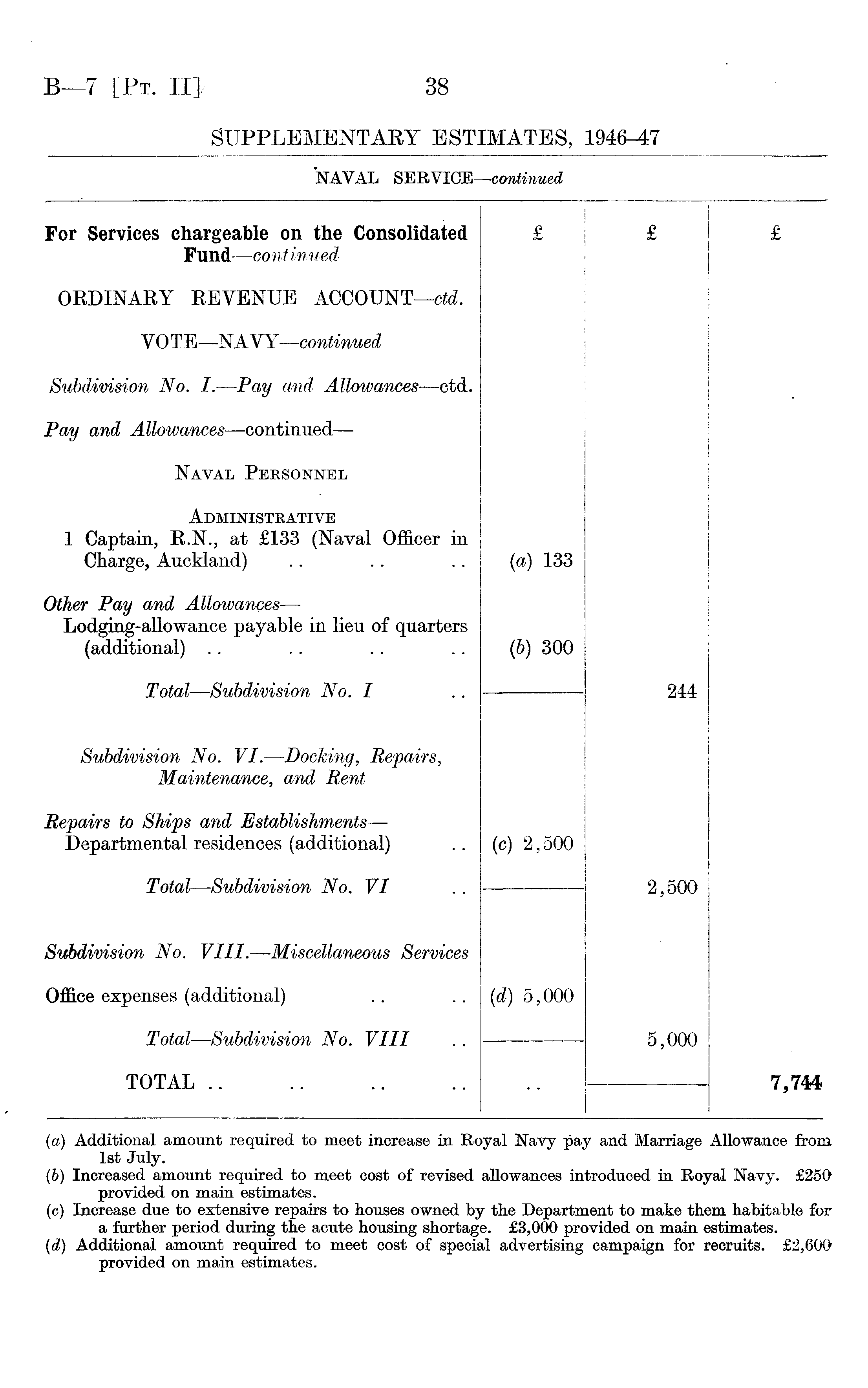 (a) Additional amount required to meet increase in Royal Navy pay and Marriage Allowance from Ist July. (b) Increased amount required to meet cost of revised allowances introduced in Royal Navy. £250 provided on main estimates. (c) Increase due to extensive repairs to houses owned by the Department to make them habitable for a further period during the acute housing shortage. £3,000 provided on main estimates. (d) Additional amount required to meet cost of special advertising campaign for recruits. £2,600 provided on main estimates.