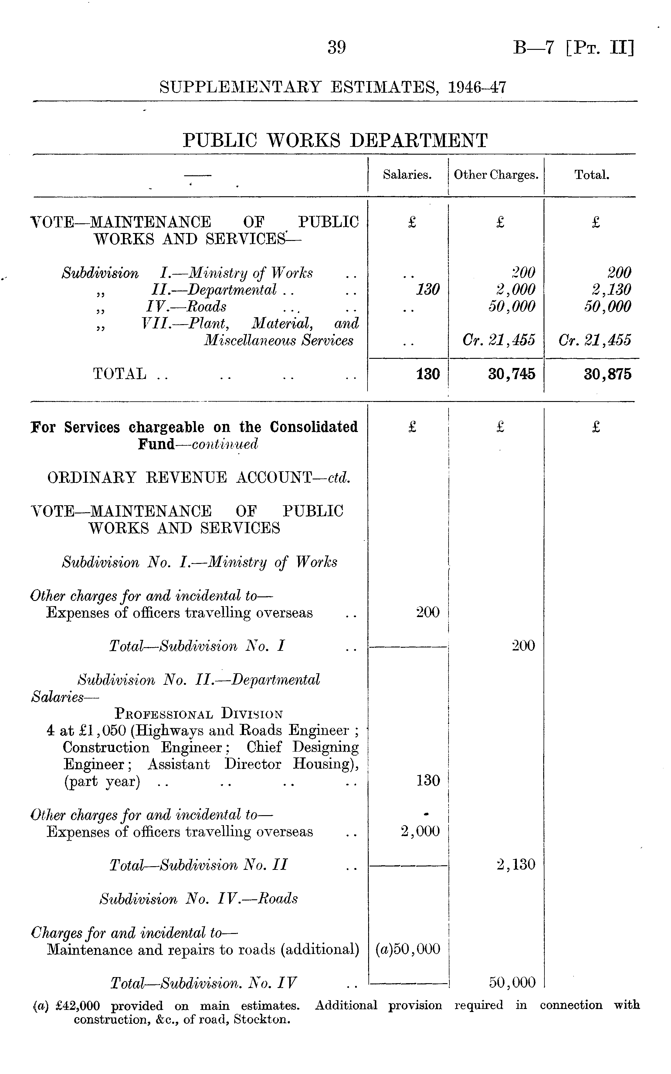 -— Salaries. Other Charges. Total. VOTE—MAINTENANCE OF PUBLIC WOKKS AND SERVICES— £ £ £ Subdivision I. — Ministry of Works „ II. — Departmental .. „ IV. — Roads ,, VII. — Plant, Material, and Miscellaneous Services ISO 200 2,000 50,000 Cr. 21,455 200 2,130 50,000 Cr. 21,455 TOTAL .. 130 30,745 30,875 For Services chargeable on the Consolidated Fund — contii lued £ £ £ ORDINARY REVENUE ACCOUNT— ctd. VOTE—MAINTENANCE OF PUBLIC WORKS AND SERVICES Subdivision No. I. — Ministry of Works Other charges for and incidental to — Expenses of officers travelling overseas 200 Total — Subdivision No. I Subdivision No. II. — Departmental Salaries — Professional Division 4 at £1,050 (Highways and Roads Engineer ; Construction Engineer; Chief Designing Engineer; Assistant Director Housing), (part year) 200 130 £J\J\J Other charges for and incidental to — Expenses of officers travelling overseas 2,000 Total — Subdivision No. II 2,130 Subdivision No. IV. — Roads Charges for and incidental to — Maintenance and repairs to roads (additional) (a)50,000 Total — Subdivision. No. IV 50,000