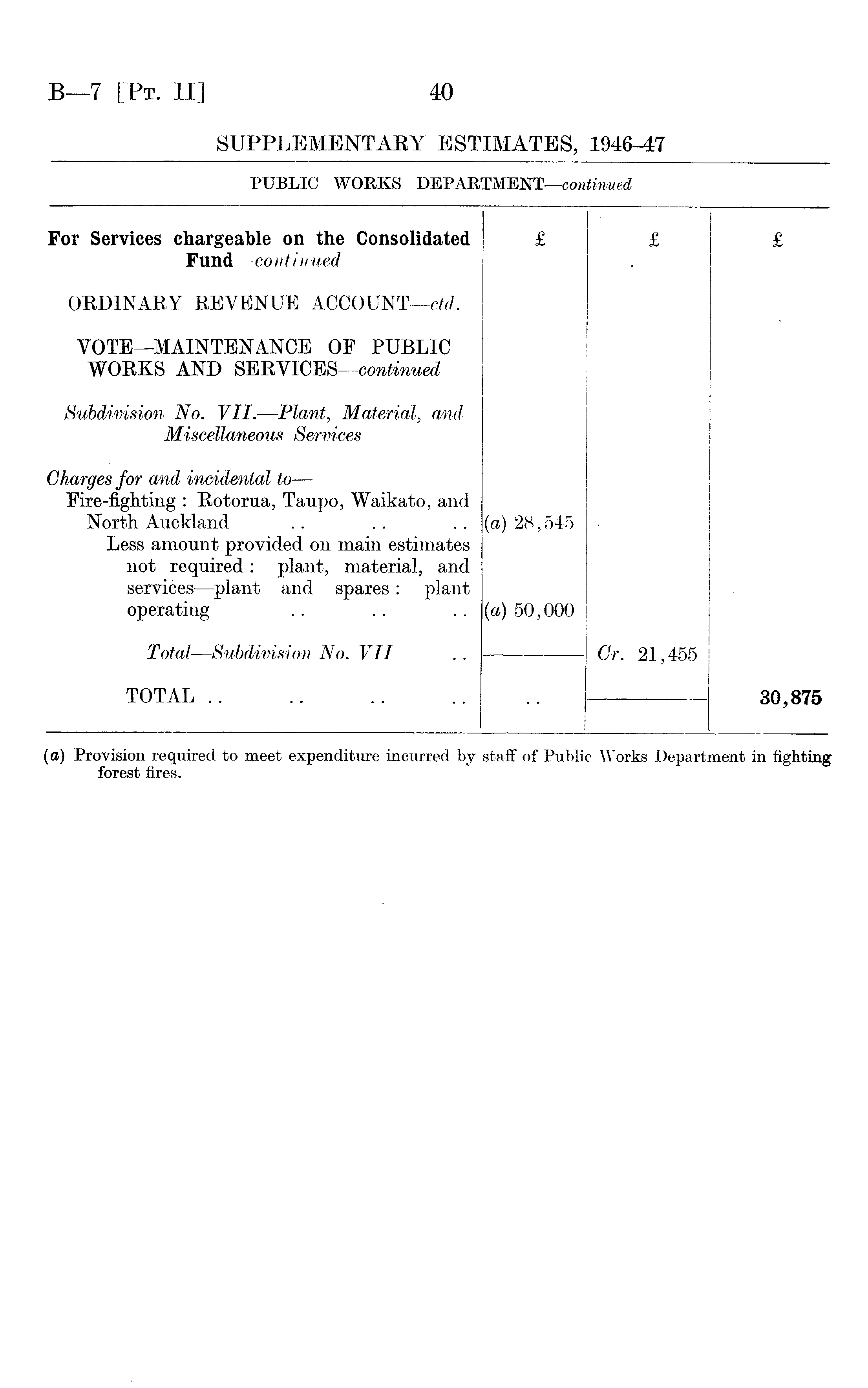 For Services chargeable on the Consolidated Fund — continued £ £ £ ORDINARY REVENUE ACCOUNT —ctd. VOTE—MAINTENANCE OF PUBLIC WORKS AND SERVICES— continued Subdivision No. VII. — Plant, Material, and Miscellaneous Services Charges for and incidental to — Fire-fighting : Rotorua, Taupo, Waikato, and North Auckland Less amount provided on main estimates not required: plant, material, and services—plant and spares : plant operating (a) (a) 28,545 50,000 Total — Subdivision No. VII TOTAL Or. 21,455 30,875