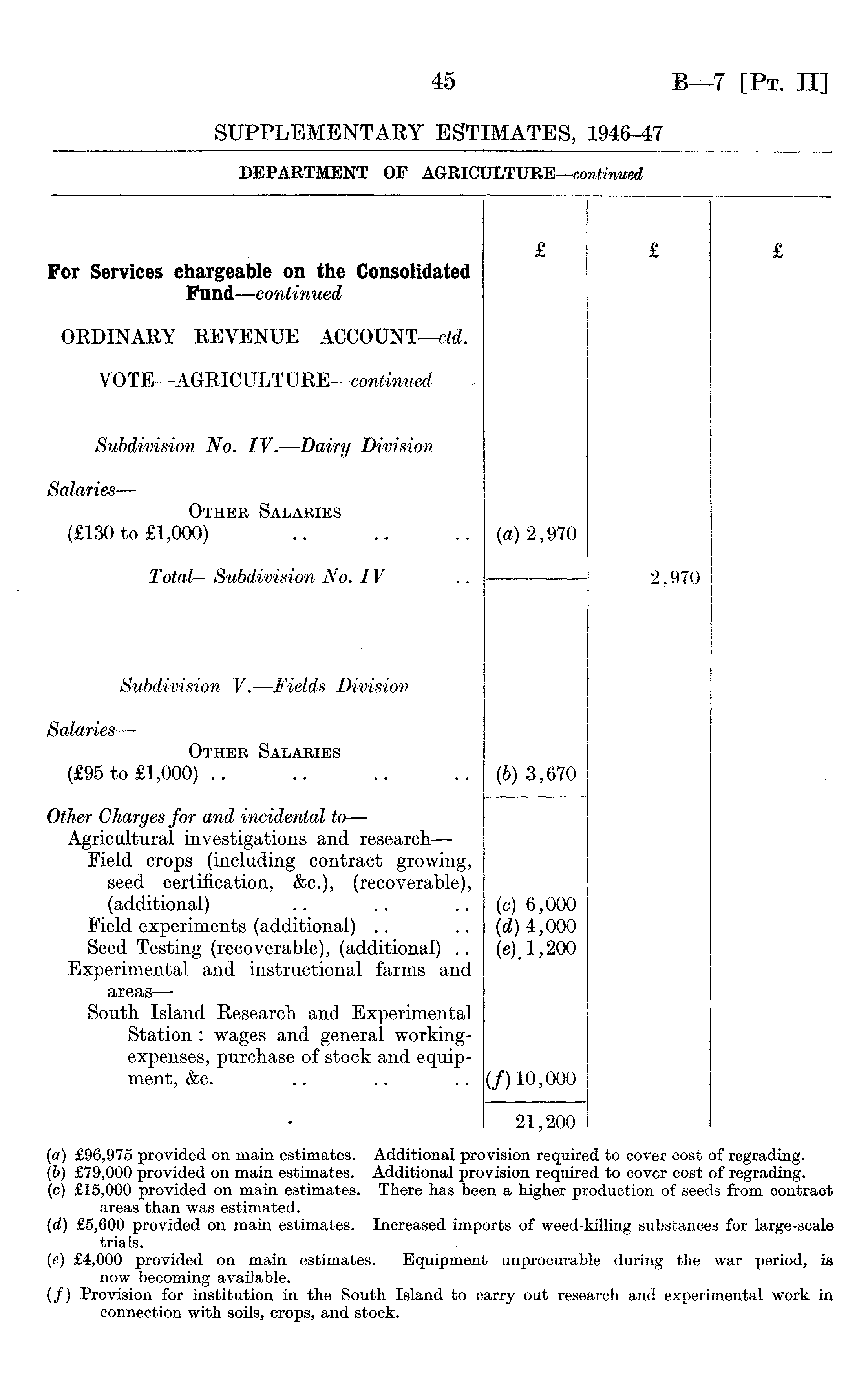(a) £96,975 provided on main estimates. Additional provision required to cover cost of regrading. (b) £79,000 provided on main estimates. Additional provision required to cover cost of regrading. (c) £15,000 provided on main estimates. There has been a higher production of seeds from contract areas than was estimated. (d) £5,600 provided on main estimates. Increased imports of weed-killing substances for large-scale trials. (e) £4,000 provided on main estimates. Equipment unprocurable during the war period, is now becoming available. (/) Provision for institution in the South Island to carry out research and experimental work in connection with soils, crops, and stock.