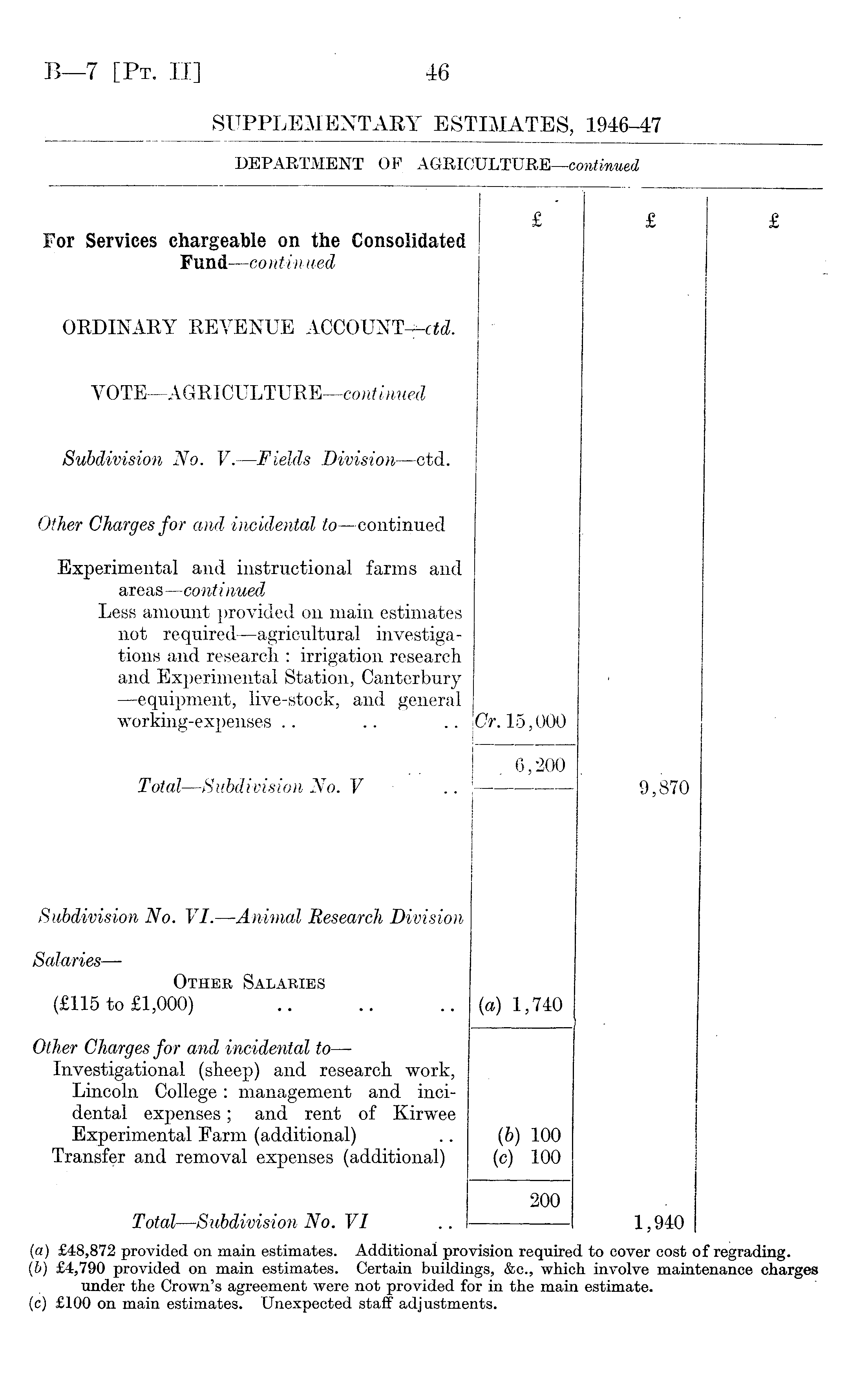 (a) £48,872 provided on main estimates. Additional provision required to cover cost of regrading. (b) £4,790 provided on main estimates. Certain buildings, &c, which involve maintenance charges under the Crown's agreement were not provided for in the main estimate. (c) £lOO on main estimates. Unexpected staff adjustments.