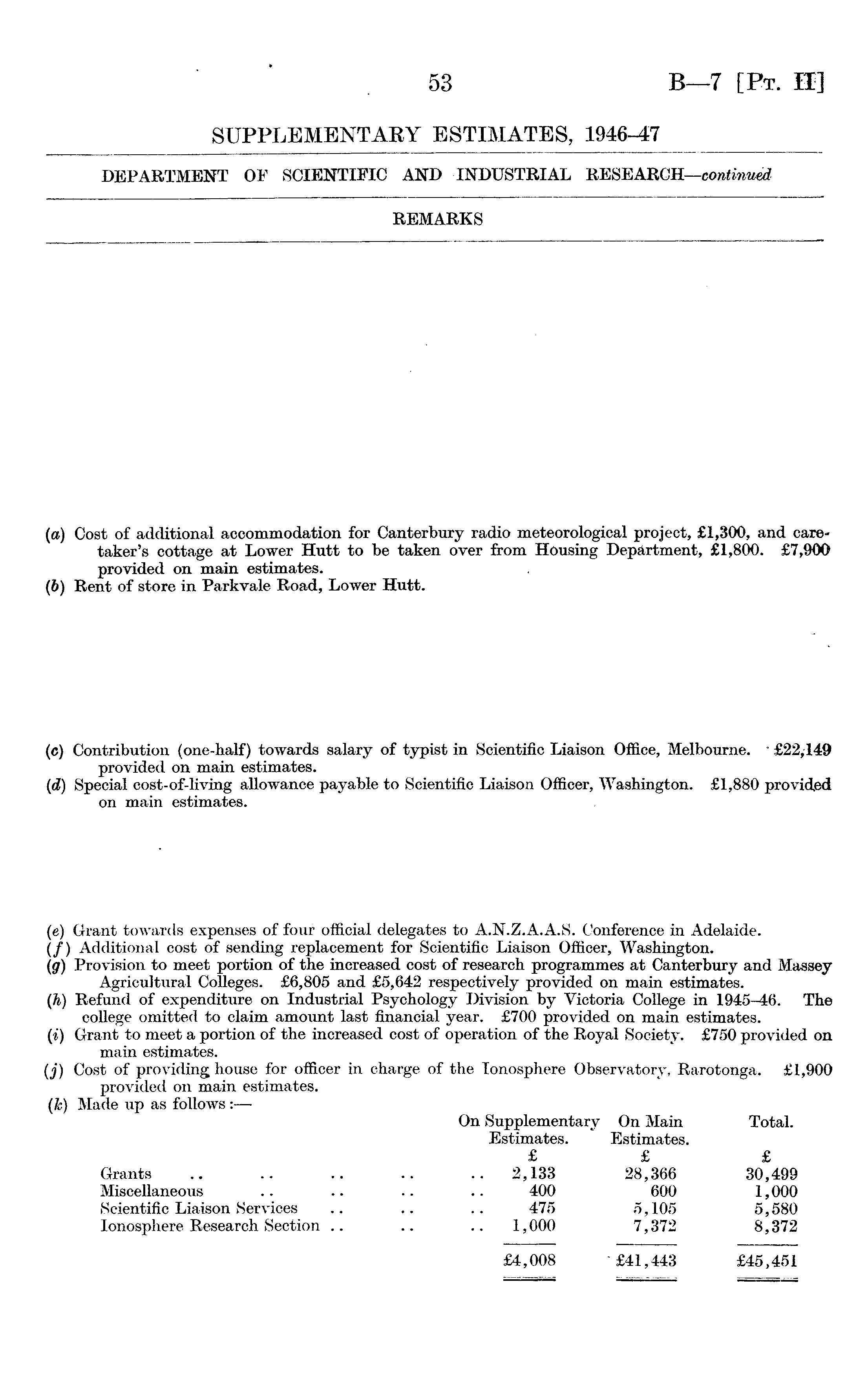 (a) Cost of additional accommodation for Canterbury radio meteorological project, £1,300, and caretaker's cottage at Lower Hutt to be taken over from Housing Department, £l,BOO. £7,900 provided on main estimates. (6) Rent of store in Parkvale Road, Lower Hutt. (c) Contribution (one-half) towards salary of typist in Scientific Liaison Office, Melbourne. £22,149 provided on main estimates. (d) Special cost-of-living allowance payable to Scientific Liaison Officer, Washington. £l,BBO provided on main estimates. (e) Grant towards expenses of four official delegates to A.N.Z.A.A.S. Conference in Adelaide. (/) Additional cost of sending replacement for Scientific Liaison Officer, Washington. \g) Provision to meet portion of the increased cost of research programmes at Canterbury and Massey Agricultural Colleges. £6,805 and £5,642 respectively provided on main estimates. (h) Refund of expenditure on Industrial Psychology Division by Victoria College in The college omitted to claim amount last financial year. £7OO provided on main estimates. (i) Grant to meet a portion of the increased cost of operation of the Royal Society. £750 provided on main estimates. (j) Cost of providing house for officer in charge of the lonosphere Observatory, Rarotonga. £1,900 provided on main estimates. (k) Made up as follows : On Supplementary On Main Total. Estimates. Estimates. £ £ £ Grants .. .. .. .. ..2,133 28,366 30,499 Miscellaneous .. .. .. .. 400 600 1,000 Scientific Liaison Services .. .. .. 475 5,105 5,580 lonosphere Research Section .. .. .. 1,000 7,372 8,372 £4,008 £41,443 £45,451
