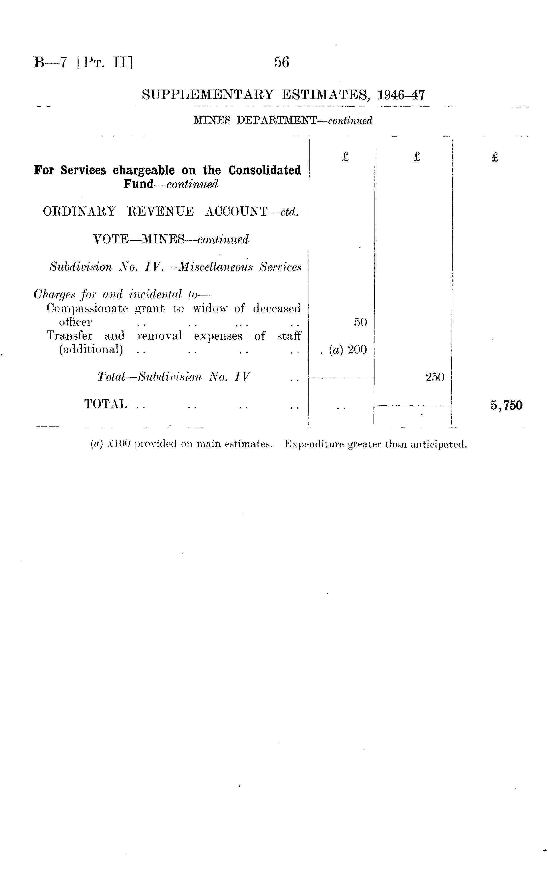 For Services chargeable on the Consolidated Fund — continued £ £ £ ORDINARY REVENUE ACCOUNT-^. VOTE—MINES— <mvtmued Subdivision No. IV. — Miscellaneous Services Charges for and incidental to — Compassionate grant to widow of deceased officer Transfer and removal expenses of staff (additional) 50 . {a) 200 Toted — Subdivision No. IV TOTAL .. 250 5,750