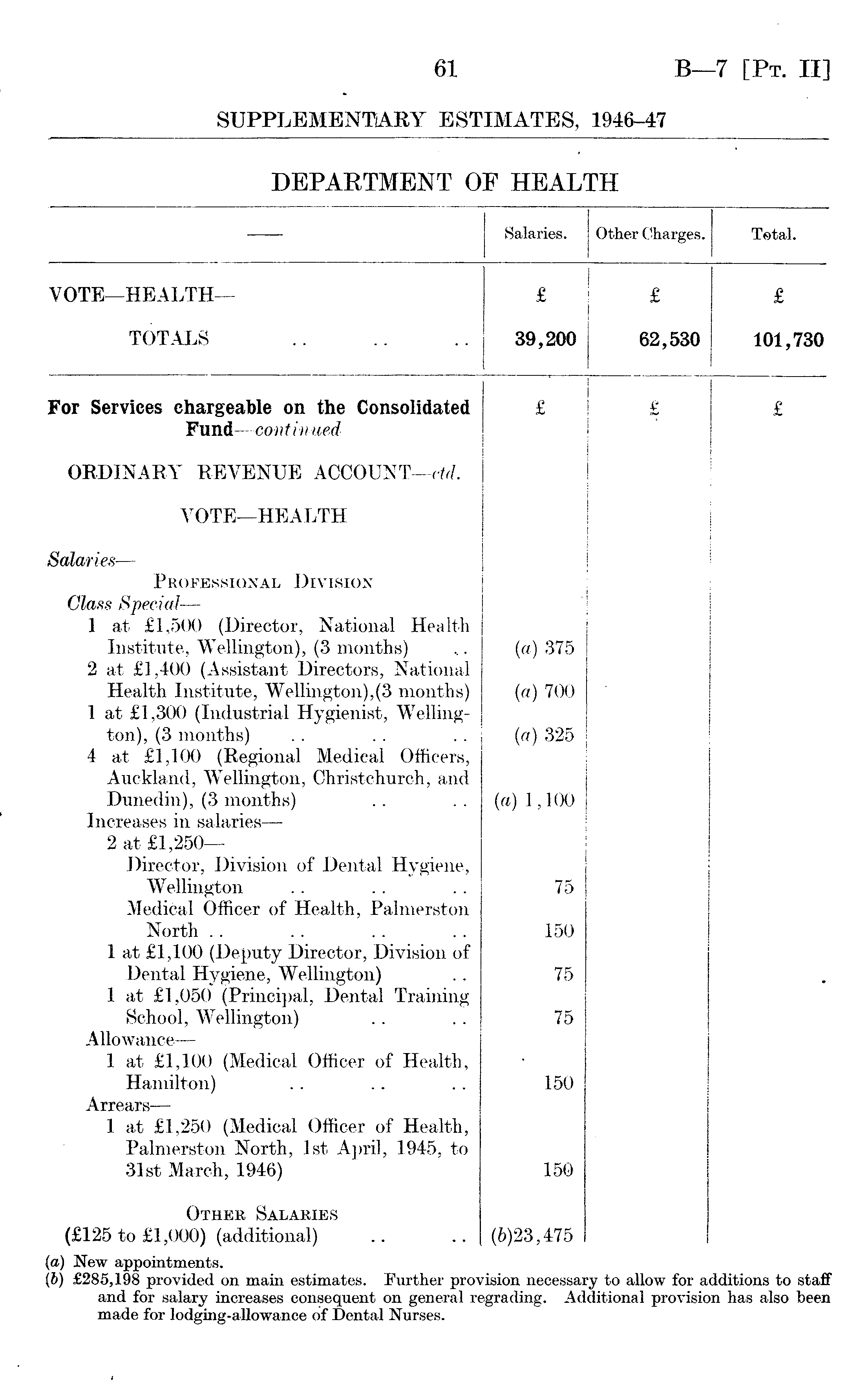 (a) New appointments. (6) £285,198 provided on main estimates. Further provision necessary to allow for additions to staff and for salary increases consequent on general regrading. Additional provision has also been made for lodging-allowance of Dental Nurses.