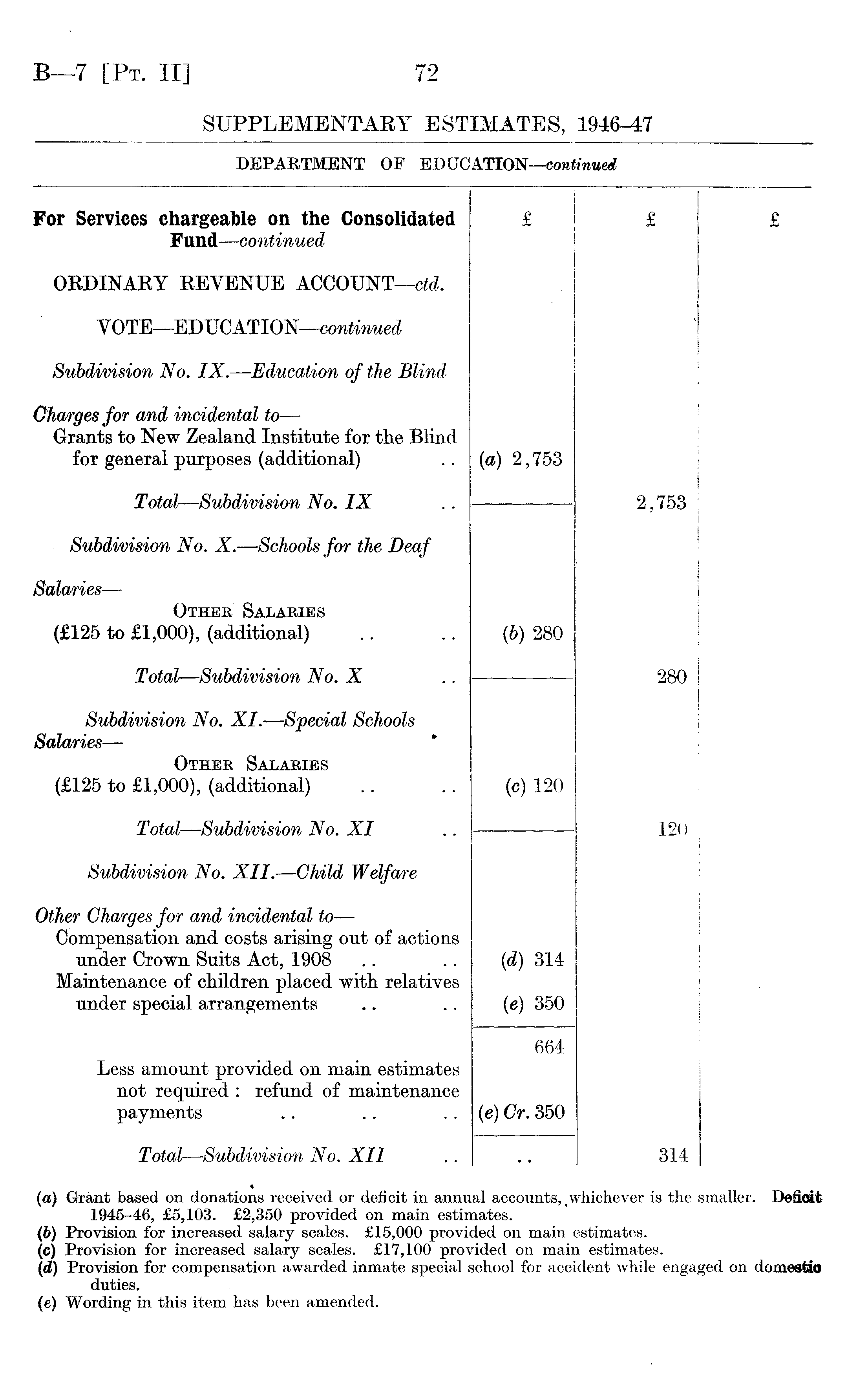 (a) Grant based on donations received or deficit in annual accounts, .whichever is the smaller. Detioit 1945-46, £5,103. £2,350 provided on main estimates. (b) Provision for increased salary scales. £15,000 provided on main estimates. (c) Provision for increased salary scales. £17,100 provided on main estimates. (d) Provision for compensation awarded inmate special school for accident while engaged on domeatio duties. (e) Wording in this item has been amended.