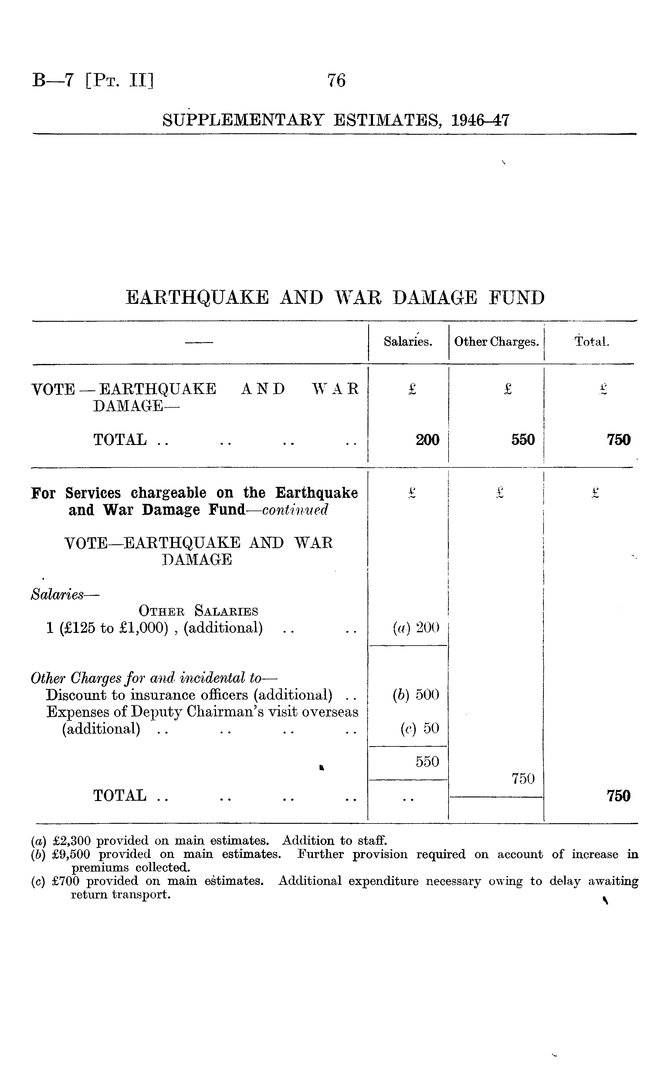— Salaries. Other Charges. Total. VOTE — EARTHQUAKE AND WAR DAMAGETOTAL .. £ 200 £ 550 £ 750 For Services chargeable on the Earthquake and War Damage Fund — continued VOTE—EARTHQUAKE AND WAR DAMAGE Salaries— Other Salaries 1 (£125 to £1,000) , (additional) £ (a) 200 £ 750 £ Other Charges for and incidental to — Discount to insurance officers (additional) . . Expenses of Deputy Chairman's visit overseas (additional) .. (b) 500 (c) 50 h 550 TOTAL .. •• 750