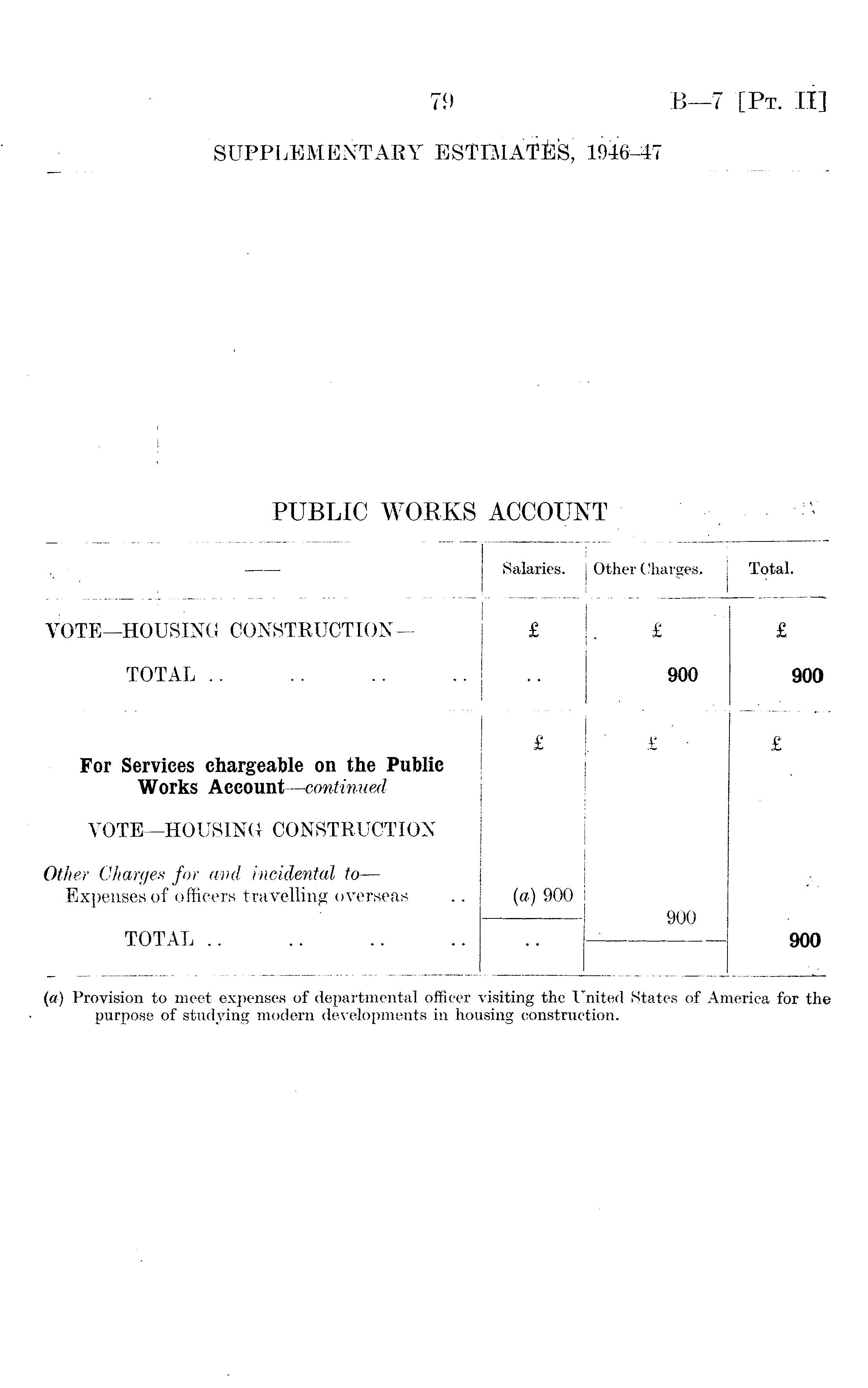 —■ Salaries. Other Charges, Total. VOTE—HOUSING CONSTRUCTION - TOTAL .. £ £ 900 £ 900 For Services chargeable on the Public Works Account— continued VOTE—HOUSING CONSTRUCTION Other Charges for and incidental to — Expenses of officers travelling overseas £ (a) 900 £ 900 £ TOTAL .. 900