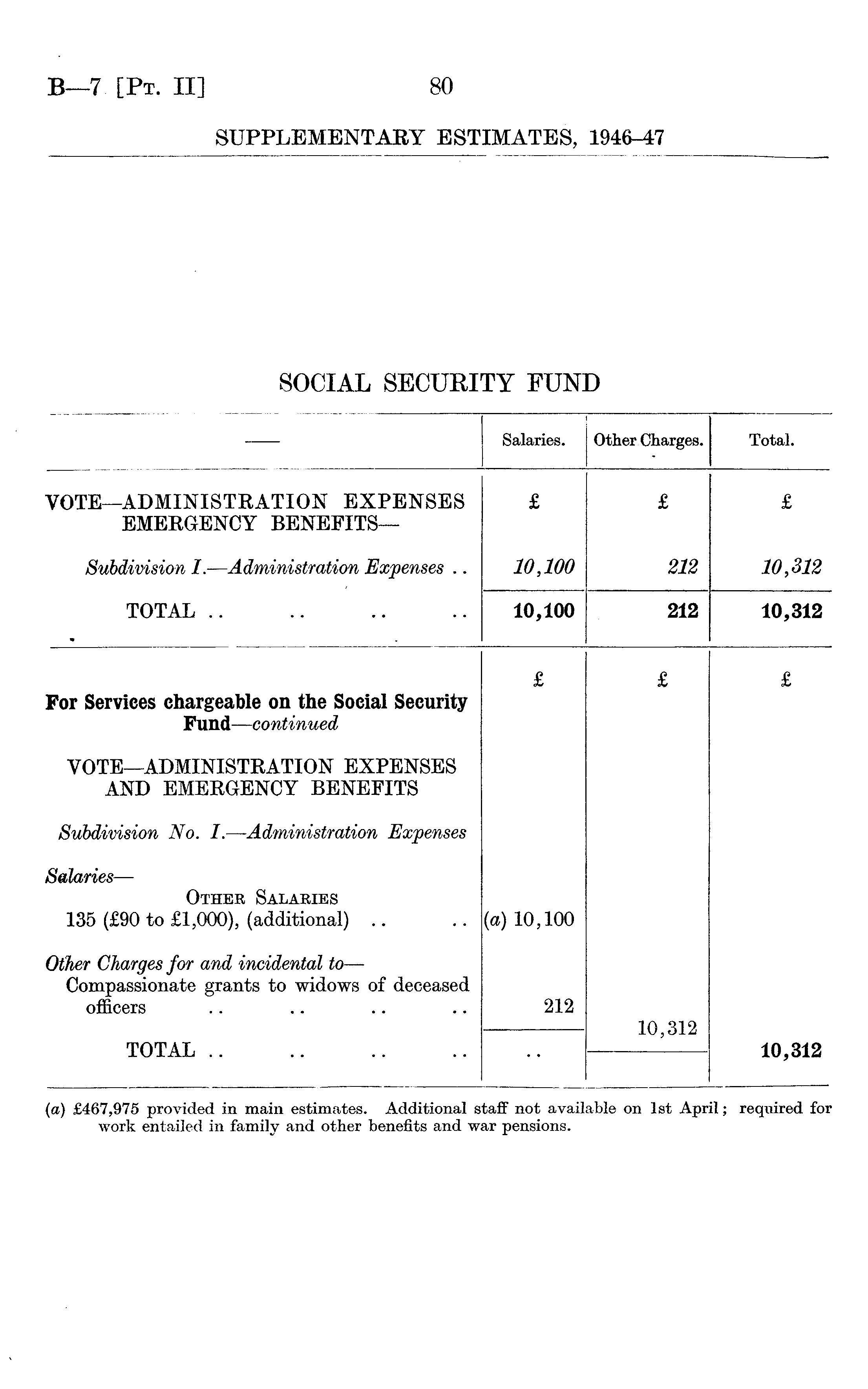 — Salaries. Other Charges. Total. VOTE—ADMINISTRATION EXPENSES EMERGENCY BENEFITS— £ £ £ Subdivision I. — Administration Expenses .. 10,100 212 10,312 TOTAL .. 10,100 212 10,312 For Services chargeable on the Social Security Fund — continued £ £ £ VOTE—ADMINISTRATION EXPENSES AND EMERGENCY BENEFITS Subdivision No. I. — Administration Expenses Salaries — Other Salaries 135 (£90 to £1,000), (additional) (a) 10,100 Oilier Charges for and incidental to — Compassionate grants to widows of deceased officers 212 10,312 TOTAL .. 10,312