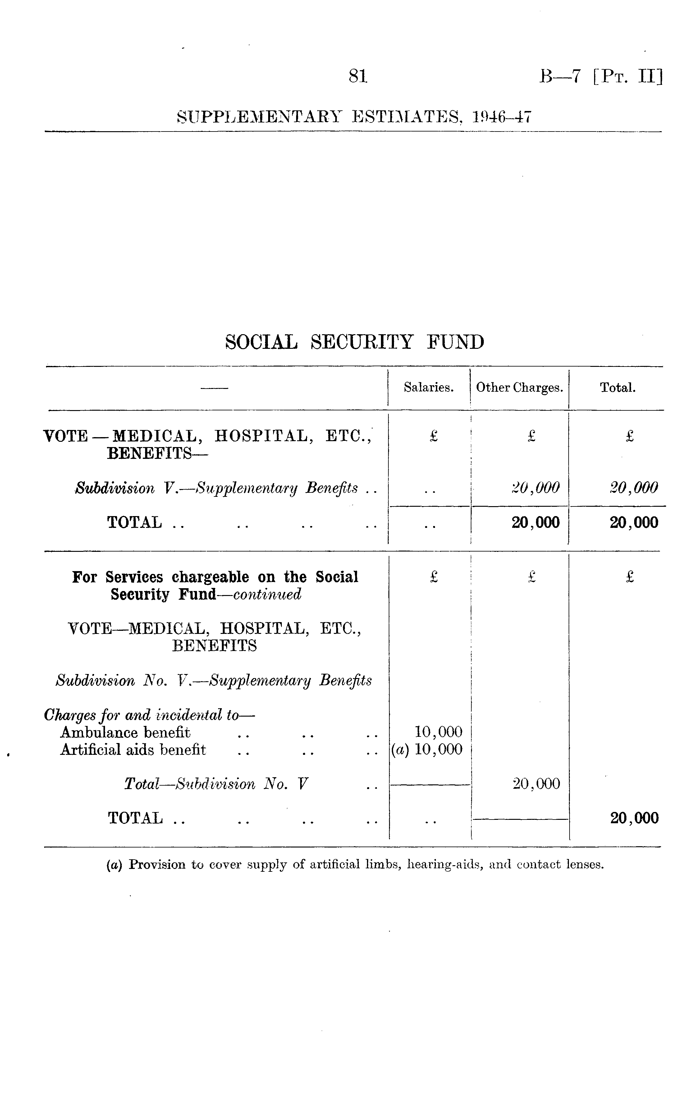 — Salaries. Other Charges. Total. VOTE —MEDICAL, HOSPITAL, ETC., BENEFITS— £ £ £ Subdivision V. — Supplementary Benefits .. 20,000 20,000 TOTAL .. 20,000 i 20,000 For Services chargeable on the Social Security Fund — continued £ £ £ VOTE—MEDICAL, HOSPITAL, ETC., BENEFITS Subdivision No. V. — Supplementary Benefits Charges for and incidental to — Ambulance benefit Artificial aids benefit 10,000 (a) 10,000 Total — Subdivision No. V TOTAL .. 20,000 - 20,000