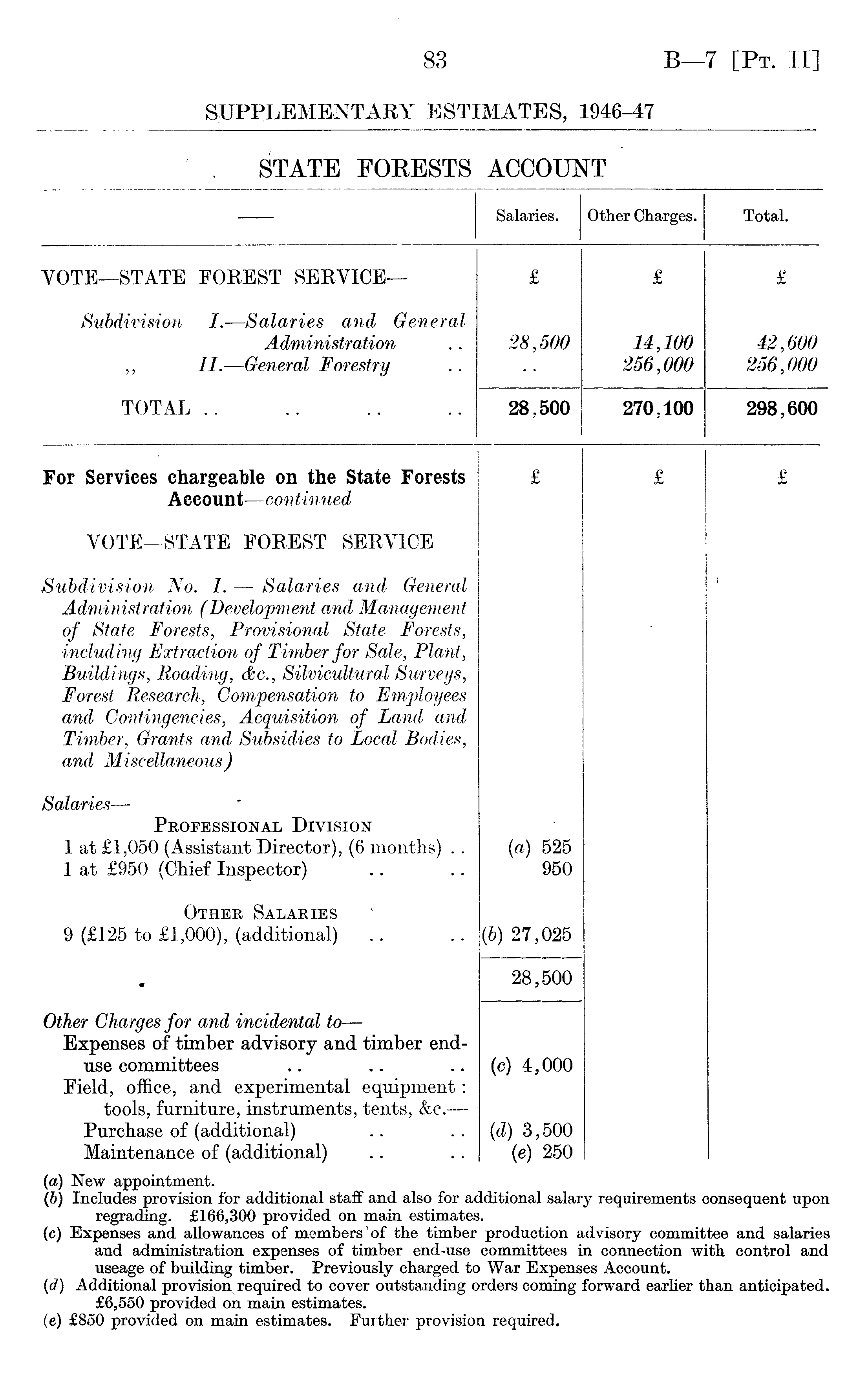 (a) New appointment. (h) Includes provision for additional staff and also for additional salary requirements consequent upon regrading. £166,300 provided on main estimates. (c) Expenses and allowances of members of the timber production advisory committee and salaries and administration expenses of timber end-use committees in connection with control and useage of building timber. Previously charged to War Expenses Account. (d) Additional provision required to cover outstanding orders coming forward earlier than anticipated. £6,550 provided on main estimates, (c) £B5O provided on main estimates. Further provision required.