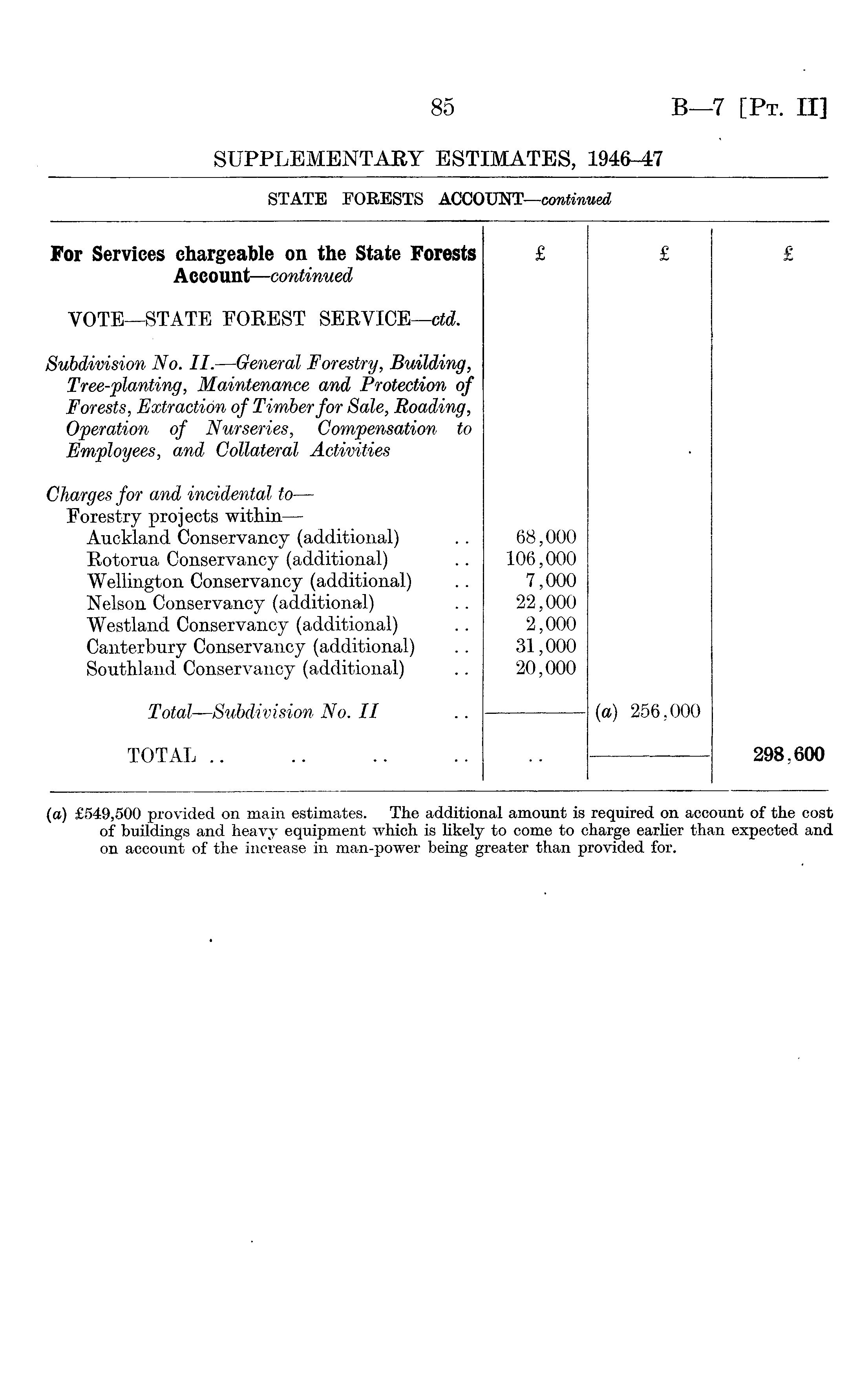 For Services chargeable on the State Forests £ £ £ Account — continued VOTE—STATE FOEEST SEKVICE— ctd. Subdivision No. II. — General Forestry, Building, Tree-planting, Maintenance and Protection of Forests, Extraction of Timber for Sale, Roading, Operation of Nurseries, Compensation to Employees, and Collateral Activities Charges for and incidental to — Forestry projects within — Auckland Conservancy (additional) 68,000 Kotorua Conservancy (additional) 106,000 Wellington Conservancy (additional) 7,000 Nelson Conservancy (additional) 22,000 Westland Conservancy (additional) 2,000 Canterbury Conservancy (additional) 31,000 Southland Conservancy (additional) 20,000 Total—Subdivision No. II TOTAL .. (a) 256,000 298,600